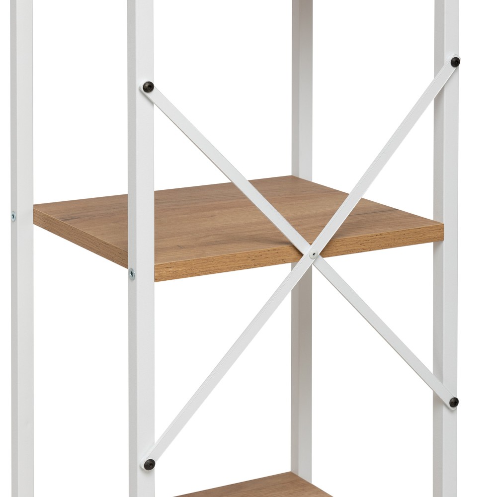 Компактный стеллаж на 4 полки Leset Стилвуд — практичный и стильный элемент для дома и офиса. Каркас из металлического профиля 1,5 см, толщина 0,1 см с порошковым покрытием обеспечивает жёсткость и долговечность; крестовина жесткости и крепление к стене добавляют стабильности и безопасности. Полки из ЛДСП толщиной 1,6 см легко чистятся, устойчивы к царапинам и выдерживают до 20 кг каждая. Нижняя полка имеет возможность крепления на разных высотах — удобно для высоких вещей или создания композиции. Маленькая плоская упаковка делает стеллаж лёгким в переноске и сборке. Универсальный дизайн впишется в любой интерьер: 4 декора (чёрный, дуб крафт, орех, белый) и 2 цвета каркаса (белый, чёрный).