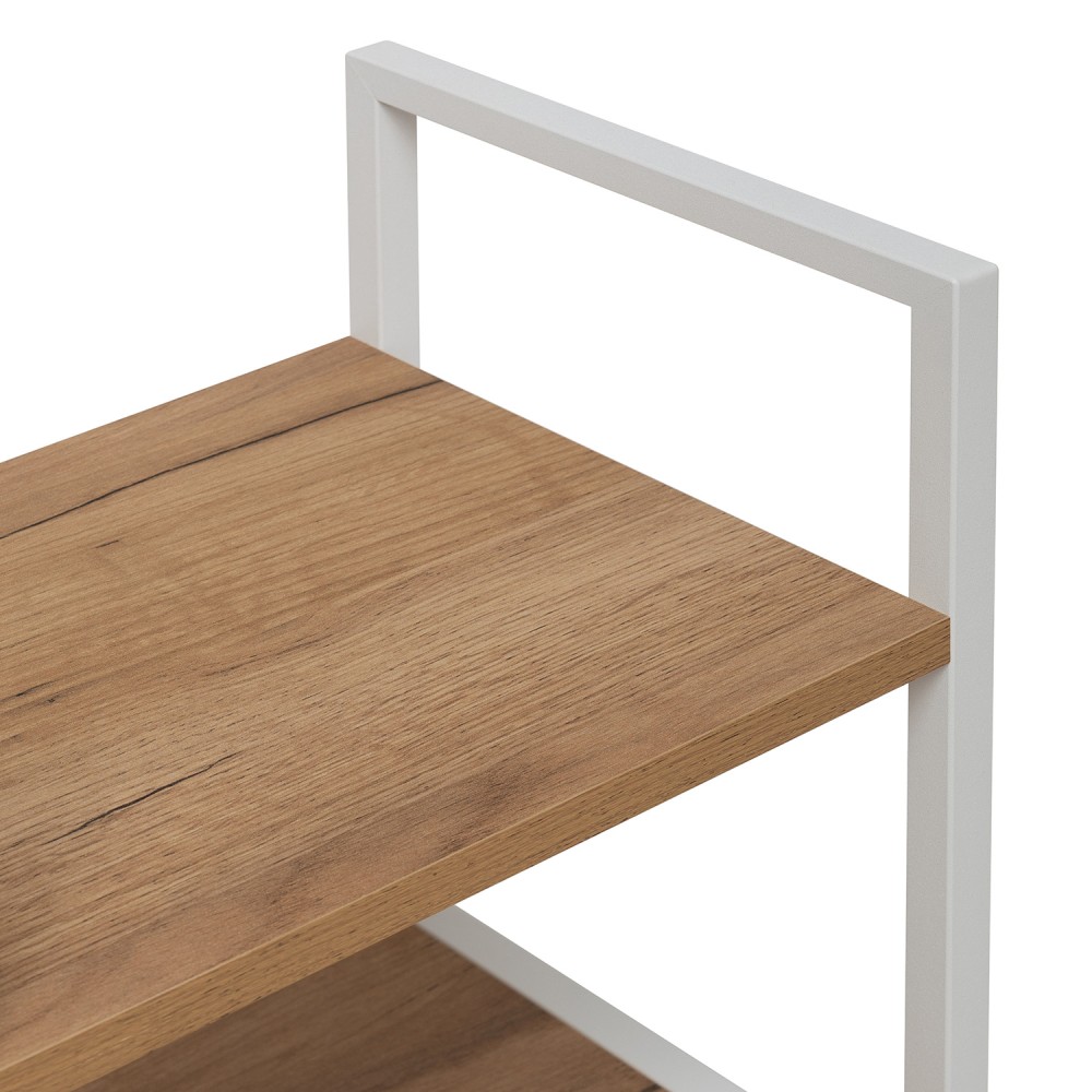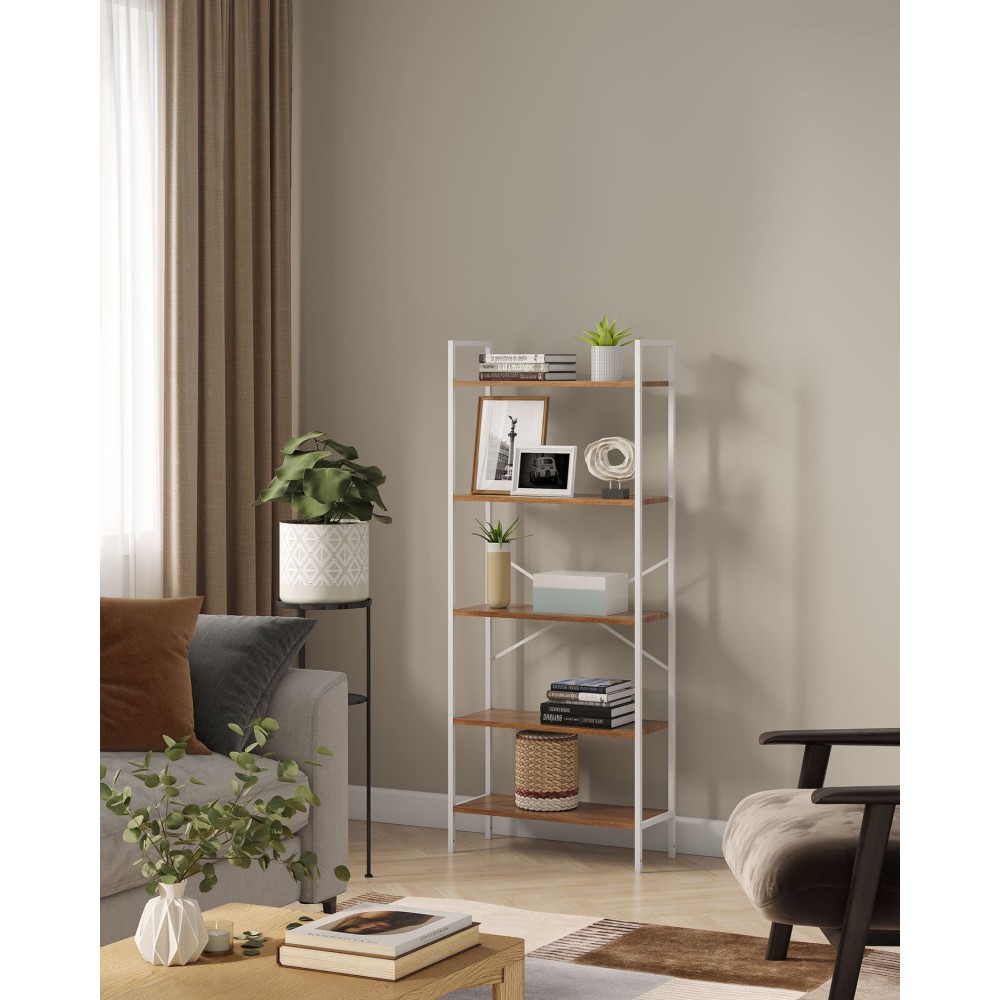Компактный стеллаж на 5 полок Leset Стилвуд — практичный и стильный элемент для дома и офиса. Каркас из металлического профиля 1,5 см, толщина 0,1 см с порошковым покрытием обеспечивает жёсткость и долговечность; крестовина жесткости и крепление к стене добавляют стабильности и безопасности. Полки из ЛДСП толщиной 1,6 см легко чистятся, устойчивы к царапинам и выдерживают до 20 кг каждая. Нижняя полка имеет возможность крепления на разных высотах — удобно для высоких вещей или создания композиции. Маленькая плоская упаковка делает стеллаж лёгким в переноске и сборке. Универсальный дизайн впишется в любой интерьер: 4 декора (чёрный, дуб крафт, орех, белый) и 2 цвета каркаса (белый, чёрный).