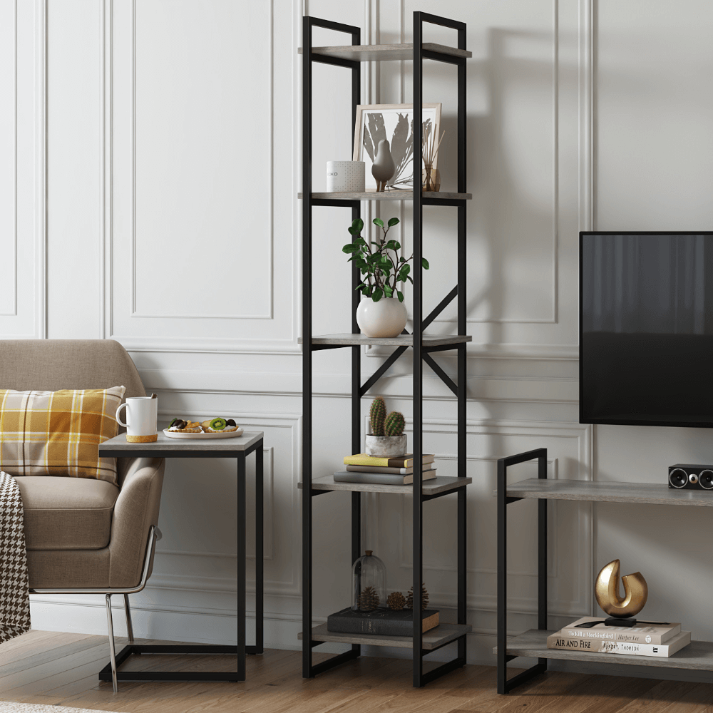 Высокий и узкий стеллаж - прекрасное дополнение для того самого угла, в который очень хочется что-то поставить. Он не отнимает пространство и позволяет разместить вещи, которые всегда должны быть под рукой.