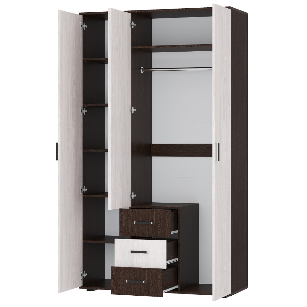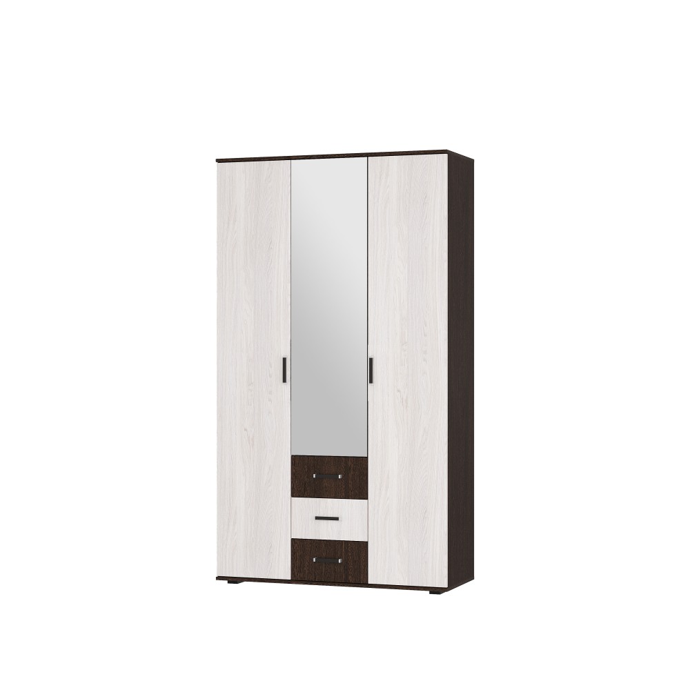 Шкаф трехдверный Белла имеет 3 ящика, зеркальную дверь. Шкаф оснащен металлической штангой и отсеком с полками для одежды.
