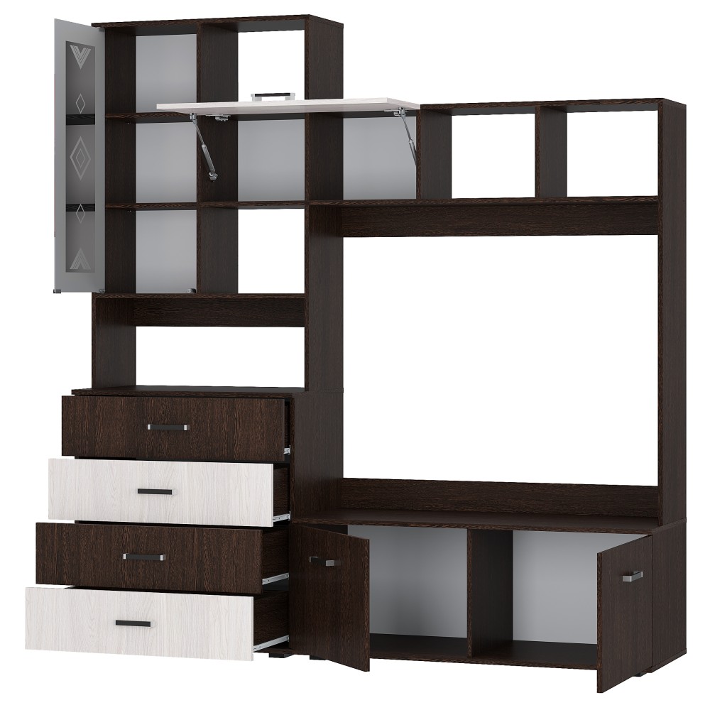 Центральная секция - 2000х2120х470 мм. Центральная секция состоит из комода с четырьмя выдвижными ящиками, тумбы под ТВ с диагональю до 40 дюймов, а также множества закрытых и открытых полок для различных мелочей.