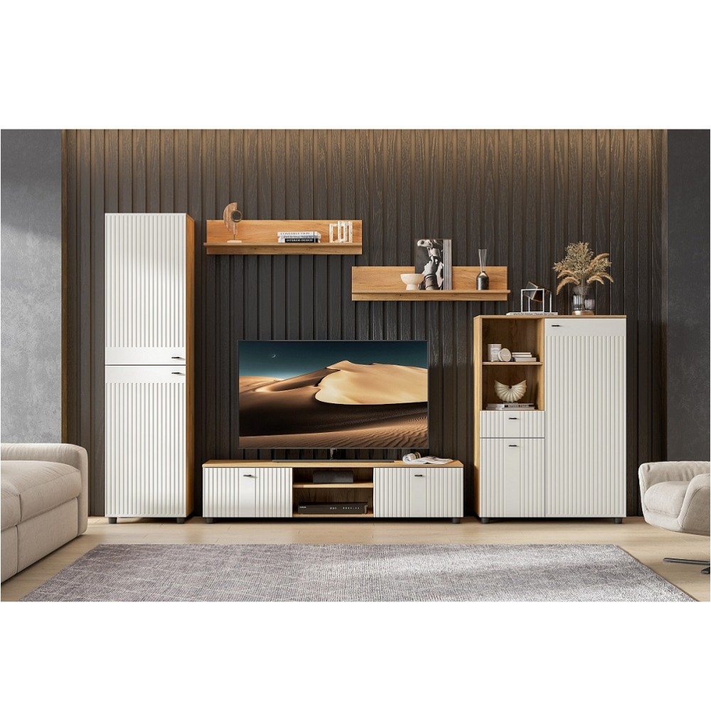 Модульная гостиная Милан выполнена в современном стиле и привлекает внимание сочетанием теплого древесного декора корпуса и белыми текстурными фасадами. Коллекция создана для ценителей глубоких и продуманных интерьеров.