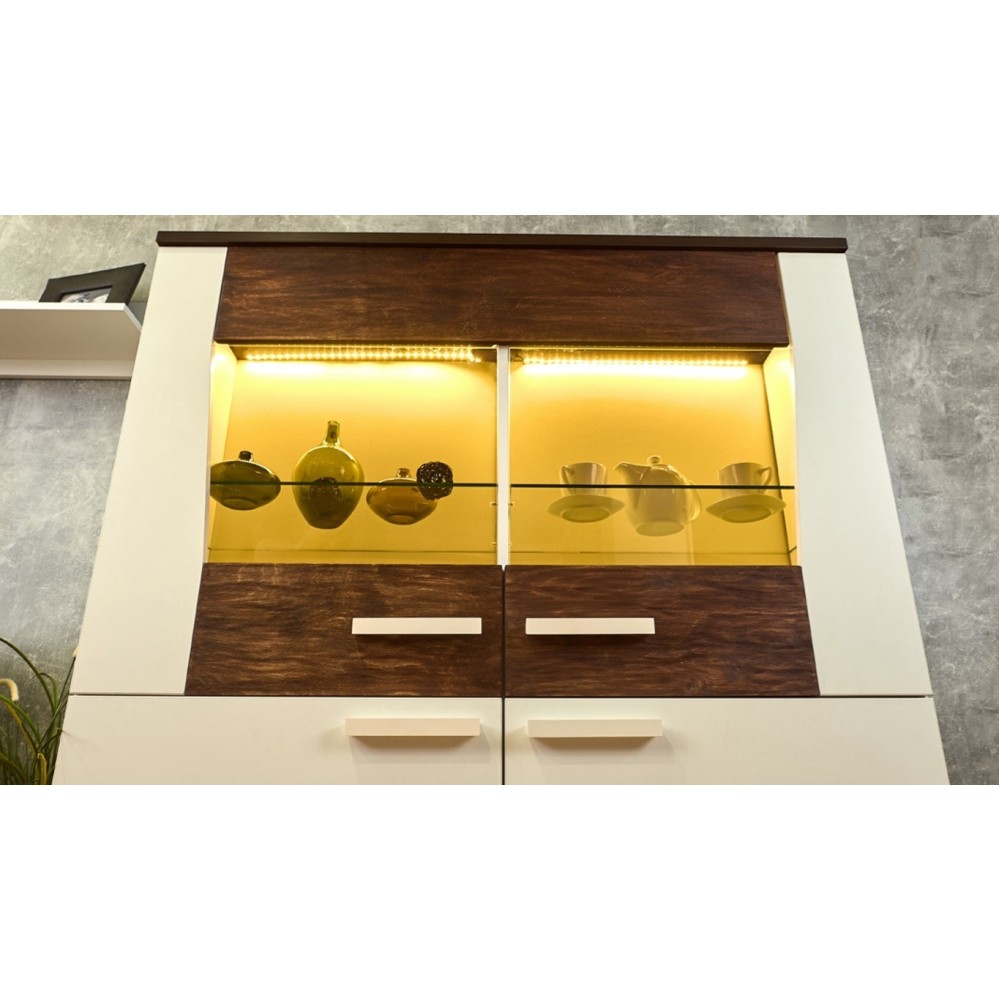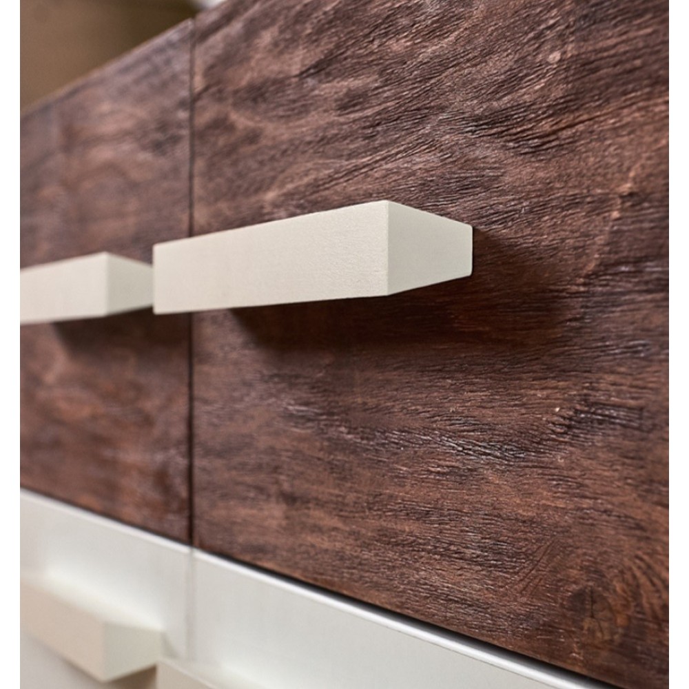 Основной декор гостиной НОРВУД — Белый. Именно он отвечает за визуальное расширение пространства и освещения. Контрастные горизонтальные поверхности толщиной 22 мм в декоре Орех Шоколадный разбавляют белые фасады модулей. Белый на фасадах также отлично контрастирует с оригинальными браширо