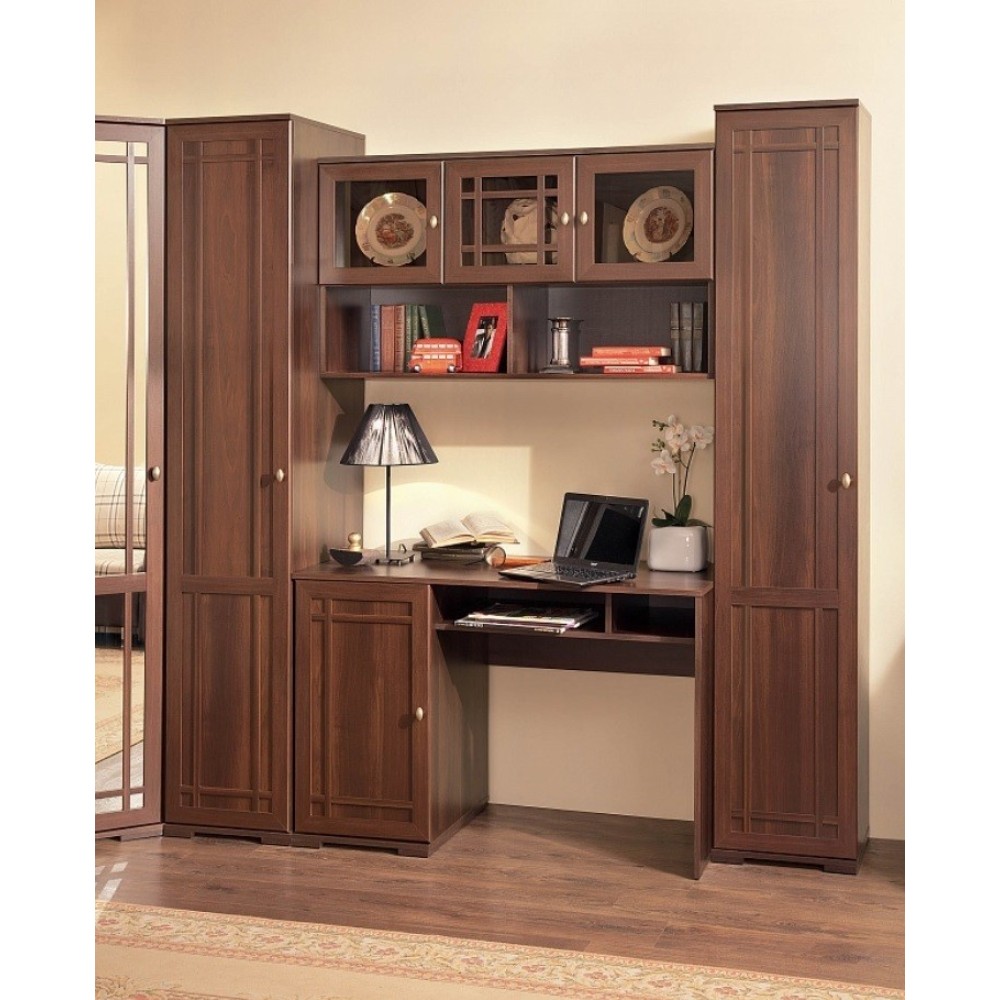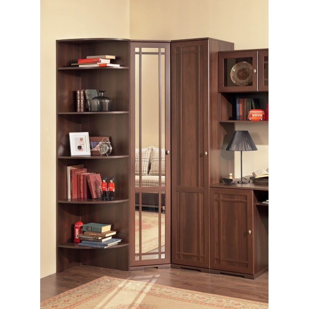 Гостиная Sherlock создана для любителей качественной и визуально привлекательной мебели в классическом исполнении. Особенность коллекции - необычные рамочные фасады из МДФ, дополненные тонкими накладками, что придает модулям особую атмосферу. Мебель выполнена в трех декорах на выбор с имитацией текстуры натурального дерева и украшена стильными металлическими ручками. Широкий ассортимент модулей позволит Вам грамотно обыграть пространство гостиной, не загромождая его, и украсить интерьер. Например, комплект 1 изготовлен в декоре "орех шоколадный" и состоит из шкафной группы, угловой открытой полки, туалетного стола (который можно использовать в качестве письменного), навесного шкафа и тумбы многоцелевого назначения.