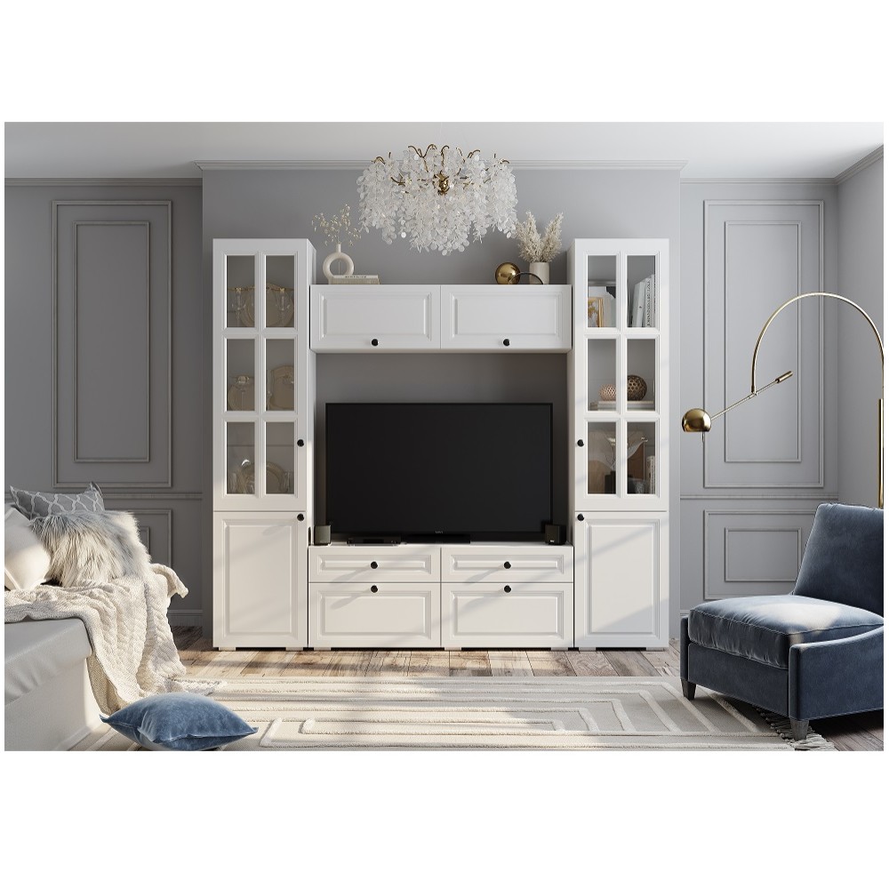 Сквозная коллекция Софт сочетает в себе лаконичный дизайн и продуманное наполнение модулей. Изюминку белому цвету корпуса добавляют фрезеровка на фасадах и минималистичные металлические ручки черного цвета. Модули практичны благодаря матовому покрытию фасадов, на котором не остается отпечатков пальцев и царапин.