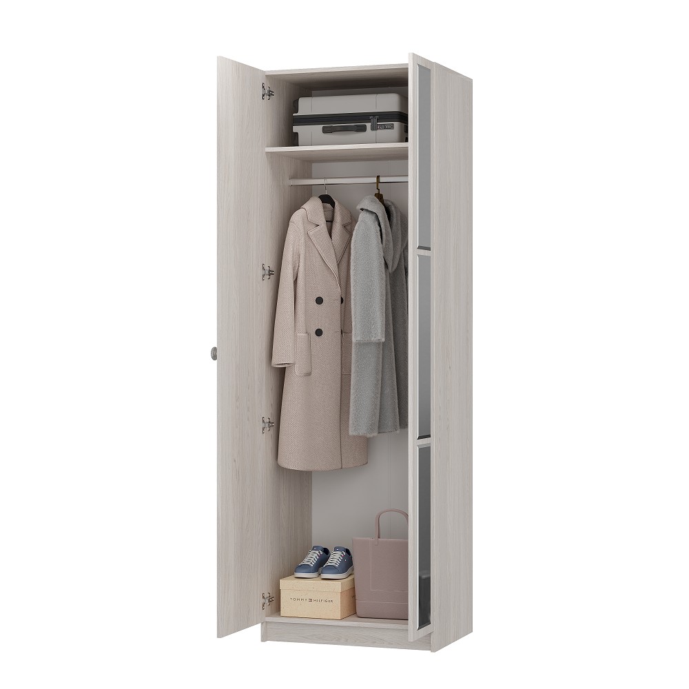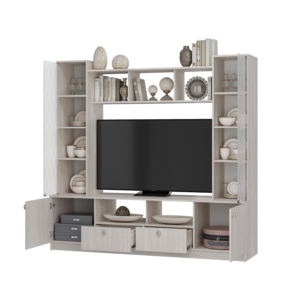 Модульная гостиная Зарина выполнена в классическом стиле и представлена двумя предметами мебели - центральной секцией с нишей под ТВ ЦС-01 и шкафом для одежды ШК-01. Центральная секция имеет набор полок с затонированными стеклянными фасадами, две закрытые створкой ниши, два выдвижных ящика и обилие открытых полок разной ширины. Шкаф оснащен стационарной штангой и полкой.