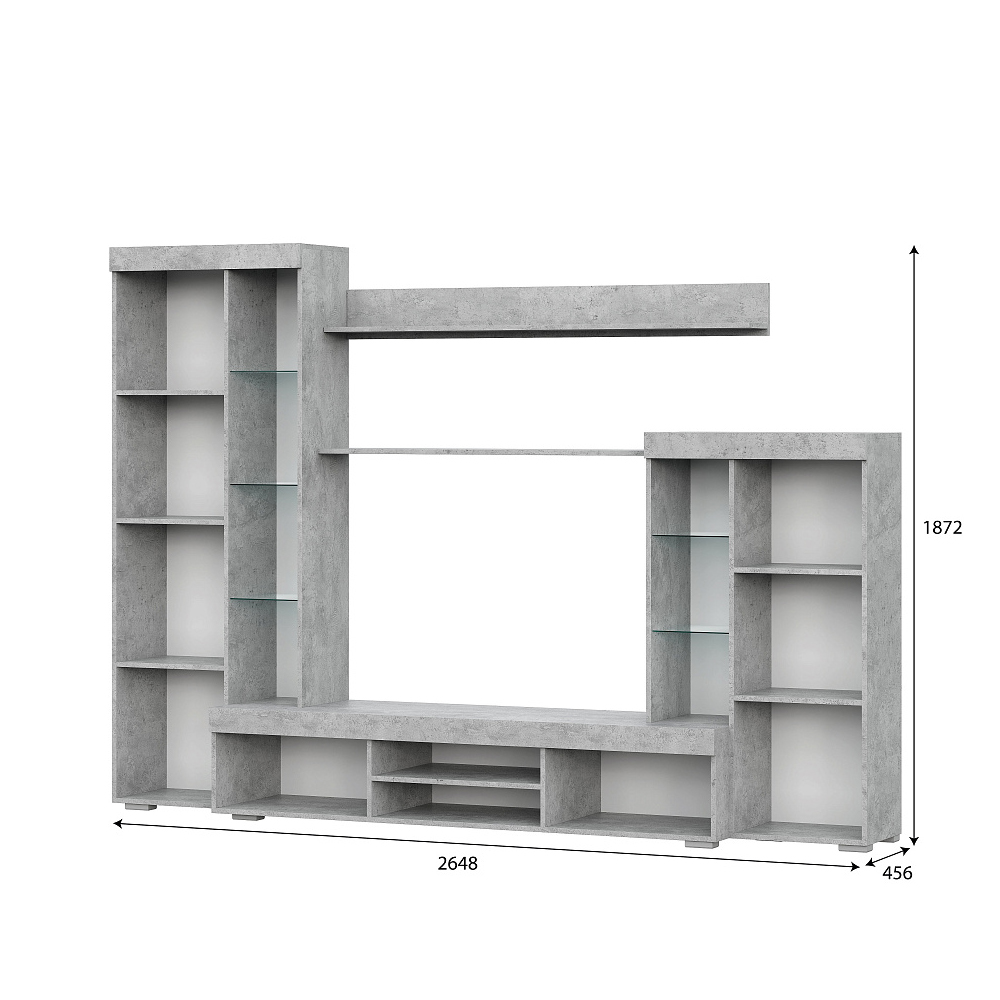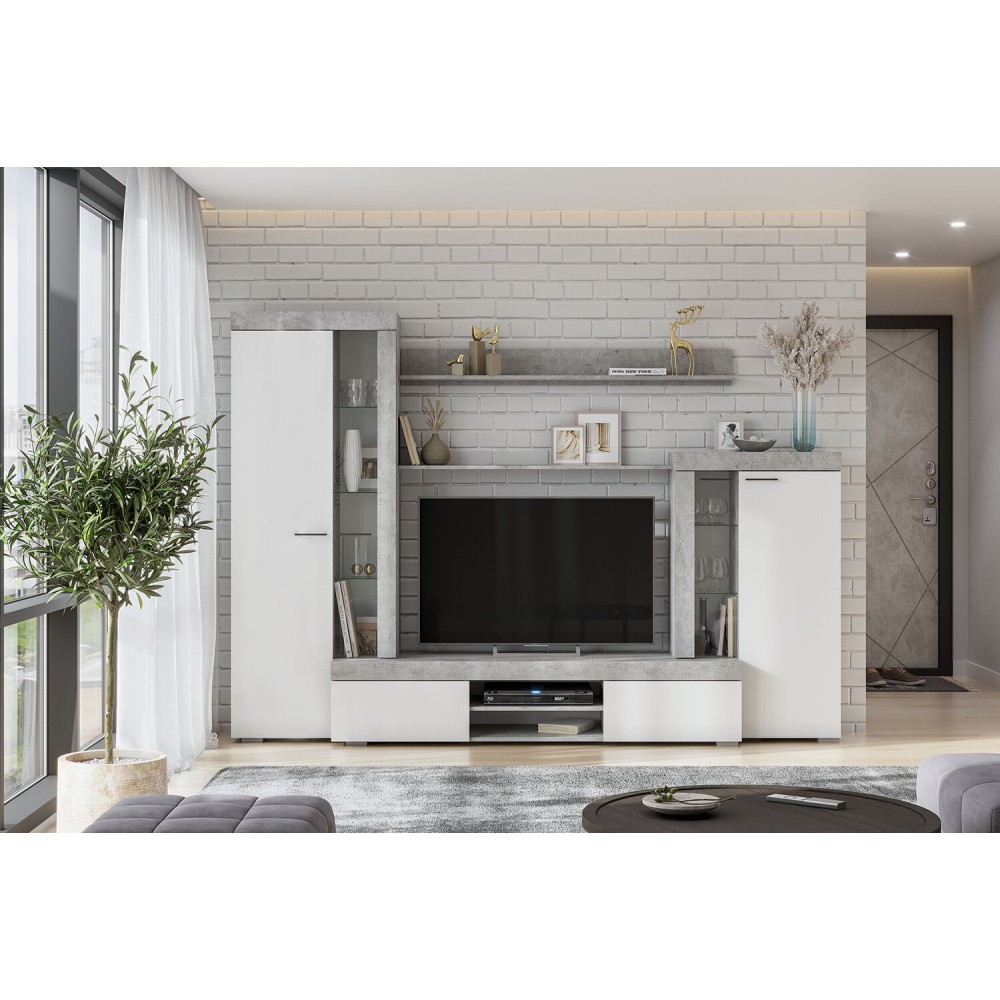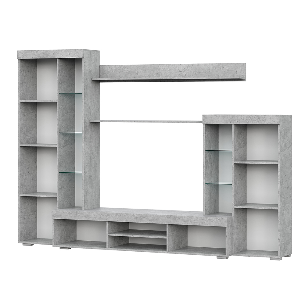 Новый гарнитур для гостиной МГС в цвете цемент светлый прекрасно впишется в современную обстановку. Модель отличается размером, обилием открытых зон хранения и фасадами со стеклянными вставками.