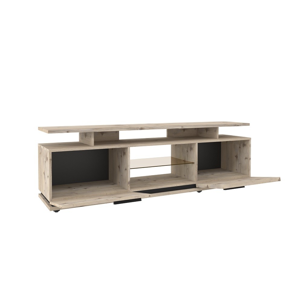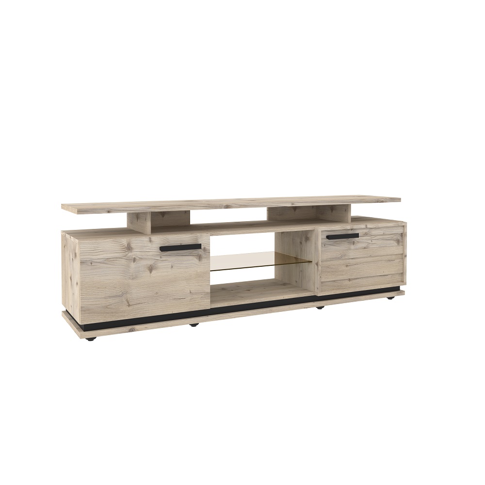 Стильная и аккуратная тумба приятного древесного оттенка гармонично впишется в интерьер гостиной в стиле Лофт. Визуально легкая конструкция не загромождает пространство и делает его более функциональным. Комбинированный вариант открытых полок со шкафчиками с глухими фасадами отлично подойдет для размещения многочисленной видеоаппаратуры, дисков и журналов. Благодаря вытянутой форме тумбы на ней без труда поместится телевизор с диагональю до 75'', а две удобные распашные дверцы позволят убрать от посторонних глаз личные вещи.