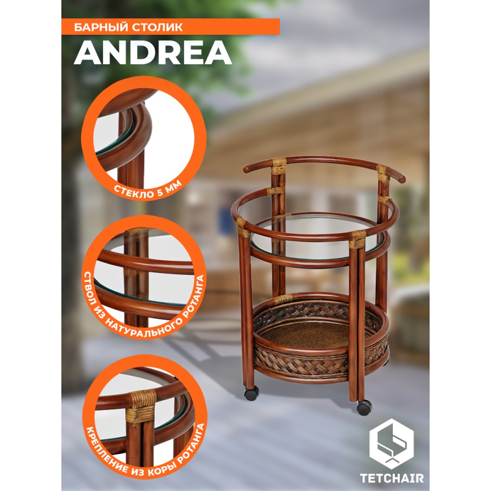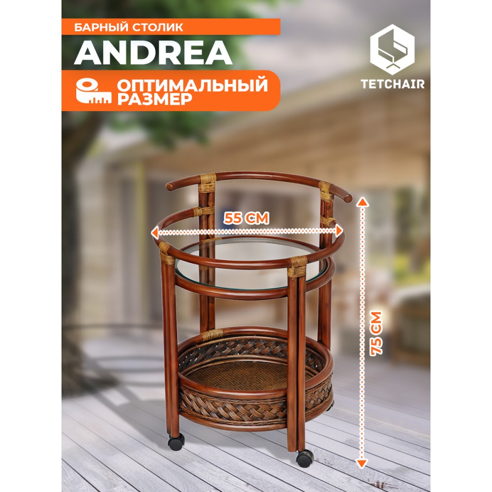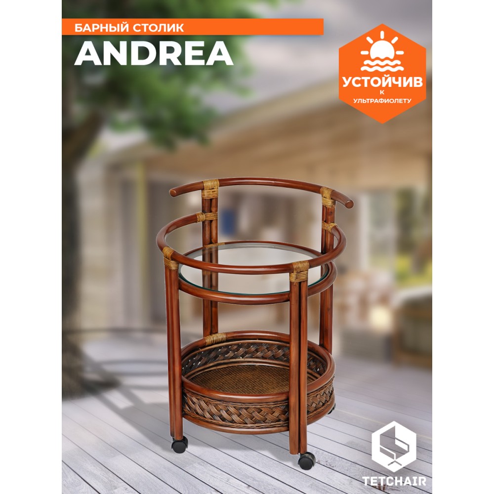 Интересный и продуманный дизайн барного столика из французской коллекции ANDREA позволит привлечь внимание и сделать яркий акцент на определенной зоне в интерьере. Это не только стильное, но и удобное решение. Столик украсит помещение, сделает ваш интерьер особенным и продуманным до мелочей. Круглая столешница из закаленного стекла и удобная нижняя полочка - отличное место для хранения вашей коллекции напитков и барных аксессуаров, надежные бортики защитят предметы от падения. Широкая ручка и колесики, вращающиеся в любом направлении, позволяют легко и быстро переместить столик при необходимости. Модель можно использовать не только по прямому назначению, но и как дополнительную сервировочную поверхность, либо как столик в гостиную для хранения под рукой всего самого необходимого. Каркас из натурального ротанга высочайшего качества изготовлен вручную с использованием нескольких видов традиционного индонезийского плетения. Отделка в цвете античный орех с нанесением темной патины подчеркивает красоту и благородство изделия. Натуральный ротанг, покрытый матовым лаком, устойчивым к УФ-излучению, прочен, долговечен, способен выдерживать большую нагрузку, и будет радовать вас своим первоначальным видом долгие годы. Модель идеально сочетается с мебелью из коллекции ANDREA, поставляется в собранном виде.