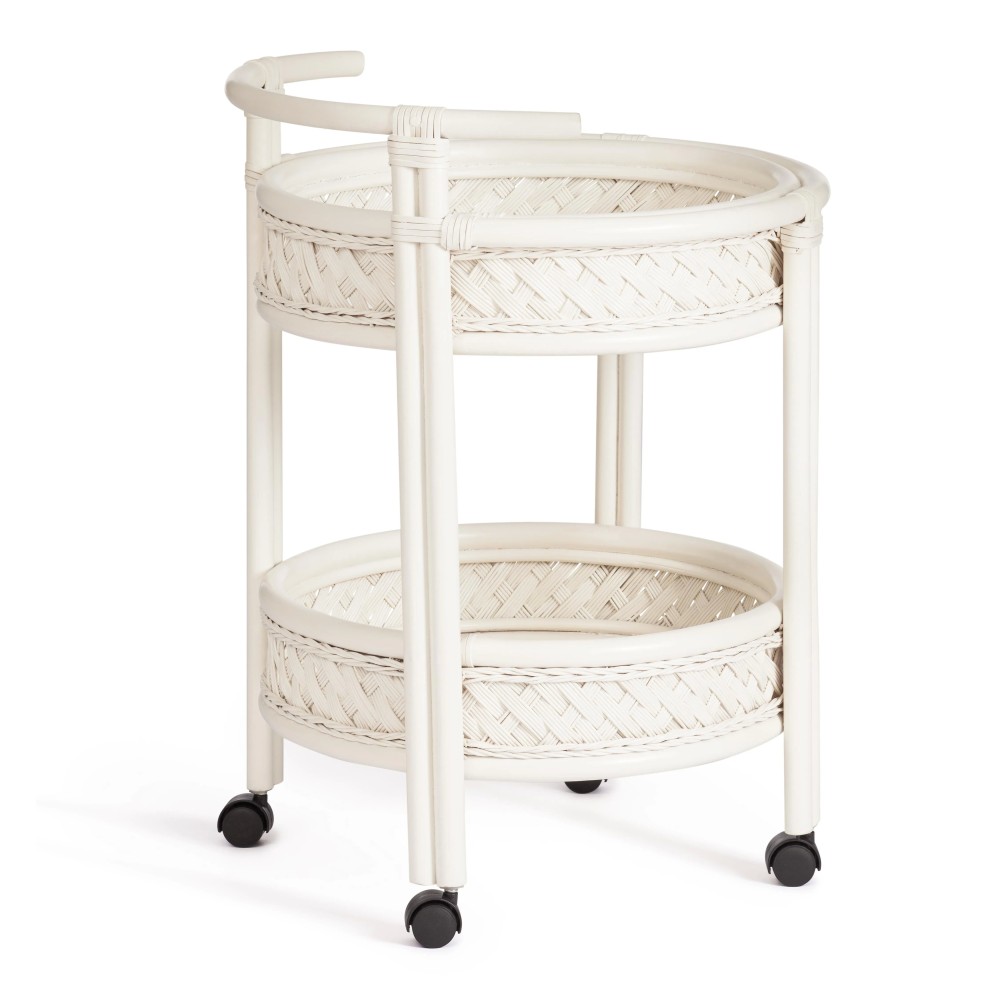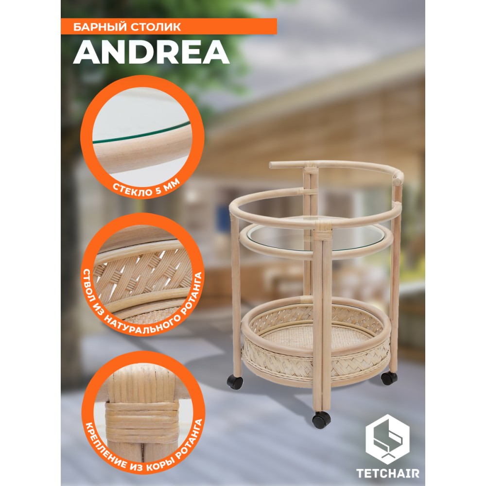 Интересный и продуманный дизайн барного столика из французской коллекции ANDREA позволит привлечь внимание и сделать яркий акцент на определенной зоне в интерьере. Это не только стильное, но и удобное решение. Столик украсит помещение, сделает ваш интерьер особенным и продуманным до мелочей. Круглая столешница из закаленного стекла и удобная нижняя полочка - отличное место для хранения вашей коллекции напитков и барных аксессуаров, надежные бортики защитят предметы от падения. Широкая ручка и колесики, вращающиеся в любом направлении, позволяют легко и быстро переместить столик при необходимости. Модель можно использовать не только по прямому назначению, но и как дополнительную сервировочную поверхность, либо как столик в гостиную для хранения под рукой всего самого необходимого. Каркас из натурального ротанга высочайшего качества изготовлен вручную с использованием нескольких видов традиционного индонезийского плетения. Натуральный ротанг, покрытый матовым лаком, устойчивым к УФ-излучению, прочен, долговечен, способен выдерживать большую нагрузку, и будет радовать вас своим первоначальным видом долгие годы. Модель идеально сочетается с мебелью из коллекции ANDREA, поставляется в собранном виде.