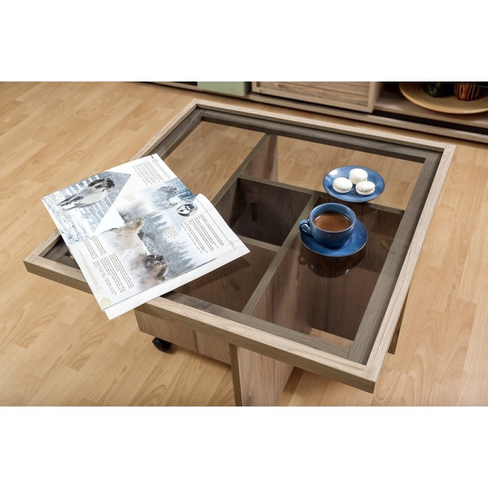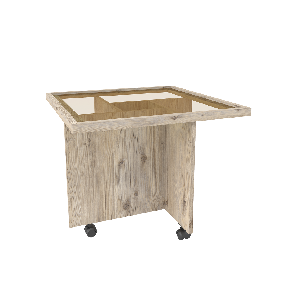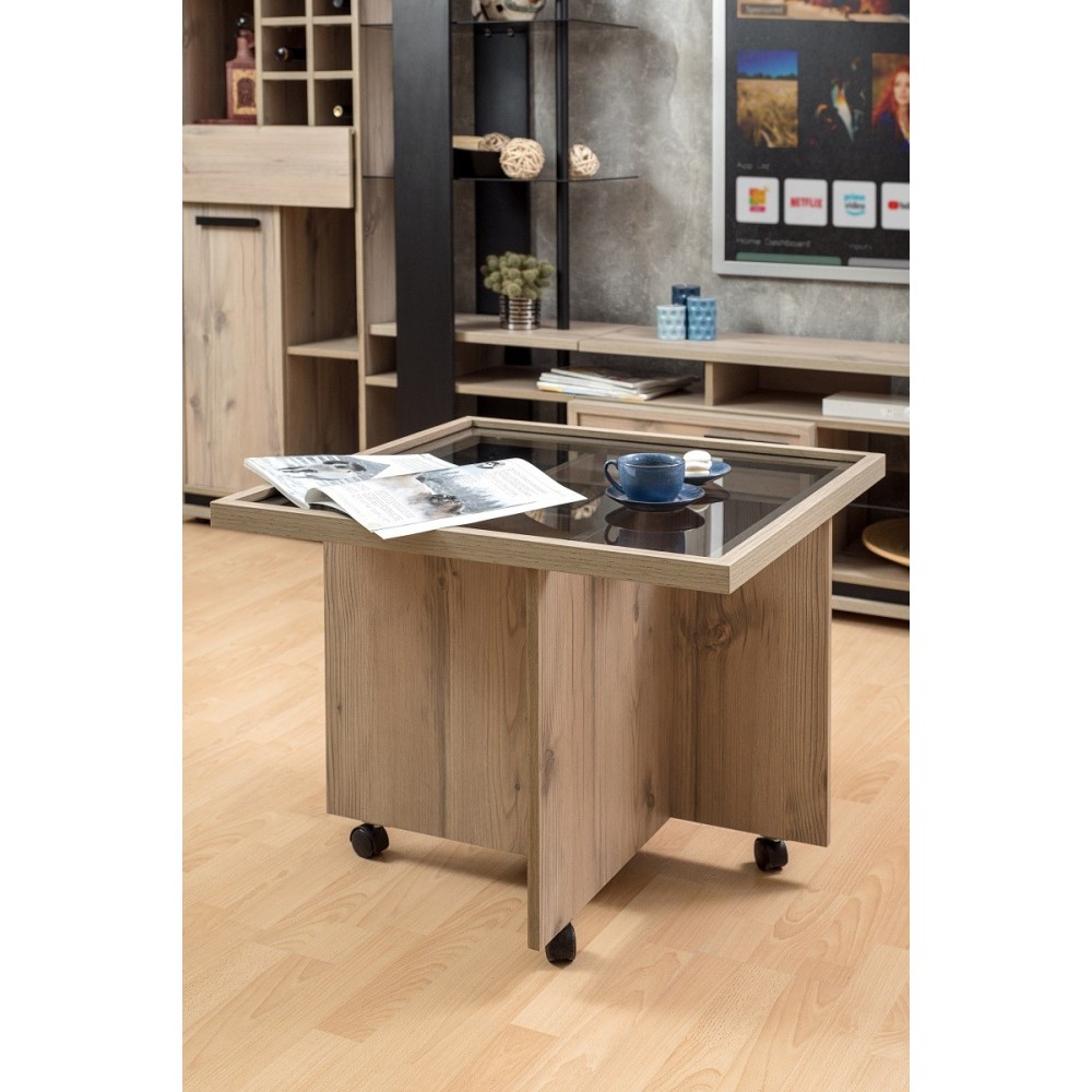Мобильный столик на колесных опорах можно свободно передвигать по гостиной. Опорные боковые стенки образуют геометричный рисунок, который четковырисовывается под столешницей из тонированного стекла. Рама, обрамляющая столешницу, предотвратит падение предметов.