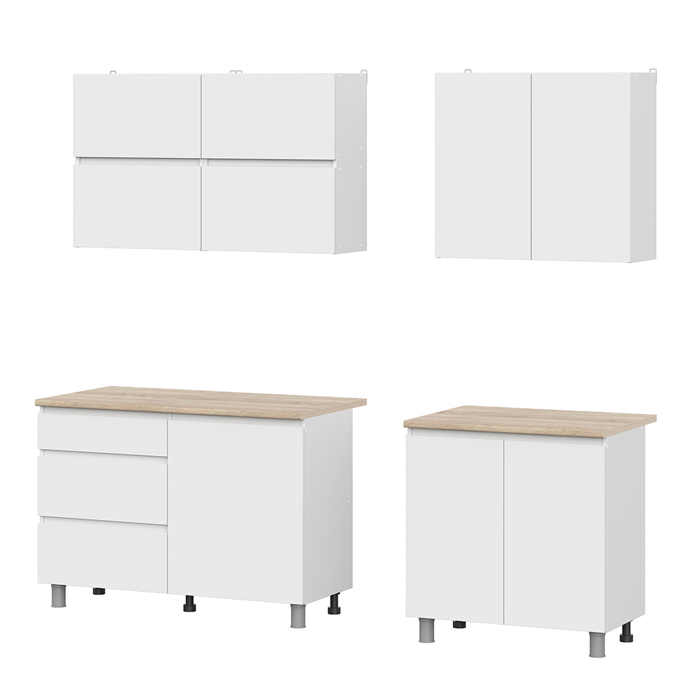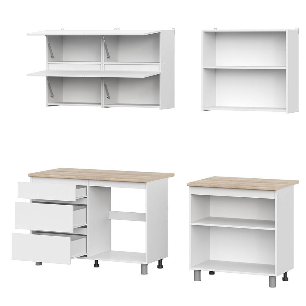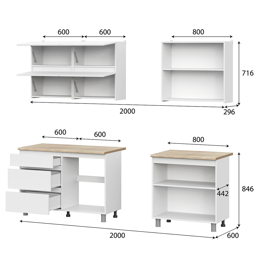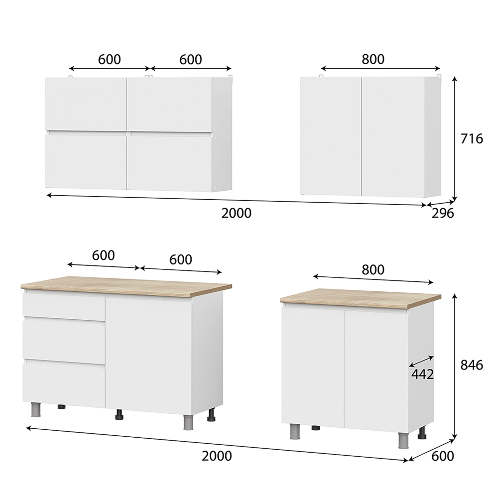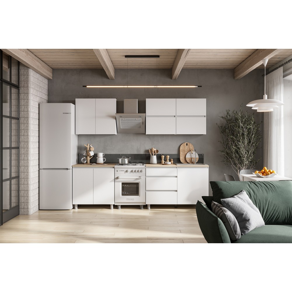 Готовая кухня Токио 2 м — готовая кухня в белом цвете со столешницей. Кухонный гарнитур не имеет ручек, их роль выполняют скосы под 45 градусов на нижних модулях и выступы на фасадах навесных шкафов. Это позволяет сэкономить пространство, а также придаёт кухне более целостный вид.
