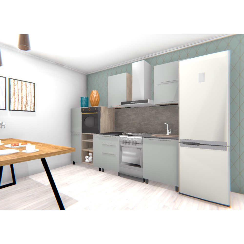 Модульная кухня Этна Софт Грей выполнена в популярном декоре – выбеленном нежно-сером оттенке с пудровой текстурой Soft. Такой декор фасадов гармонично дополняет корпус с древесным рисунком эндгрей необработанный.
