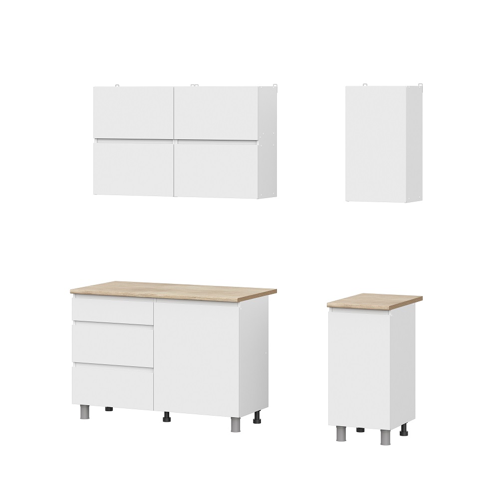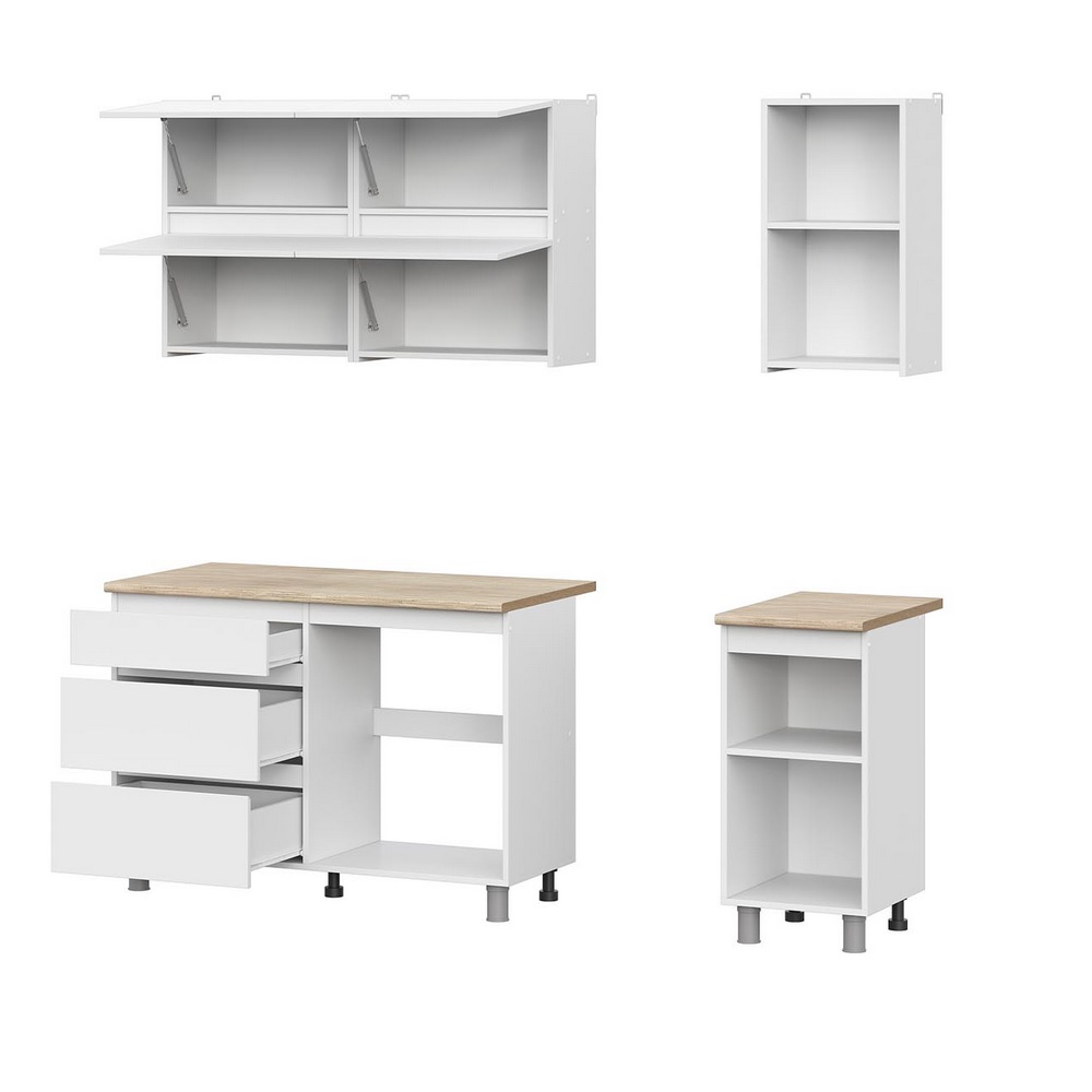 Готовая кухня в белом декоре в комплекте со столешницей. Кухонный гарнитур не имеет ручек, их роль выполняют скосы под 45 градусов на нижних модулях и выступы на фасадах навесных шкафов. Это позволяет сэкономить пространство, а также придаёт кухне более целостный вид.