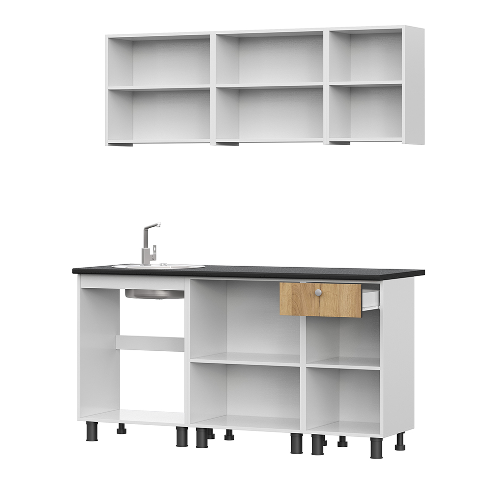 Готовый кухонный гарнитур КГ 1 1600 см из ЛДСП с продуманным наполнением и столешницей в черном цвете толщиной 26 мм. Отсутствие ручек на фасадах верхних модулей - это не только визуально привлекательно и подчеркивает минимализм, но и удобно при уборке. Отсутствие ручек акцентирует внимание на стиле и делает кухню современной.