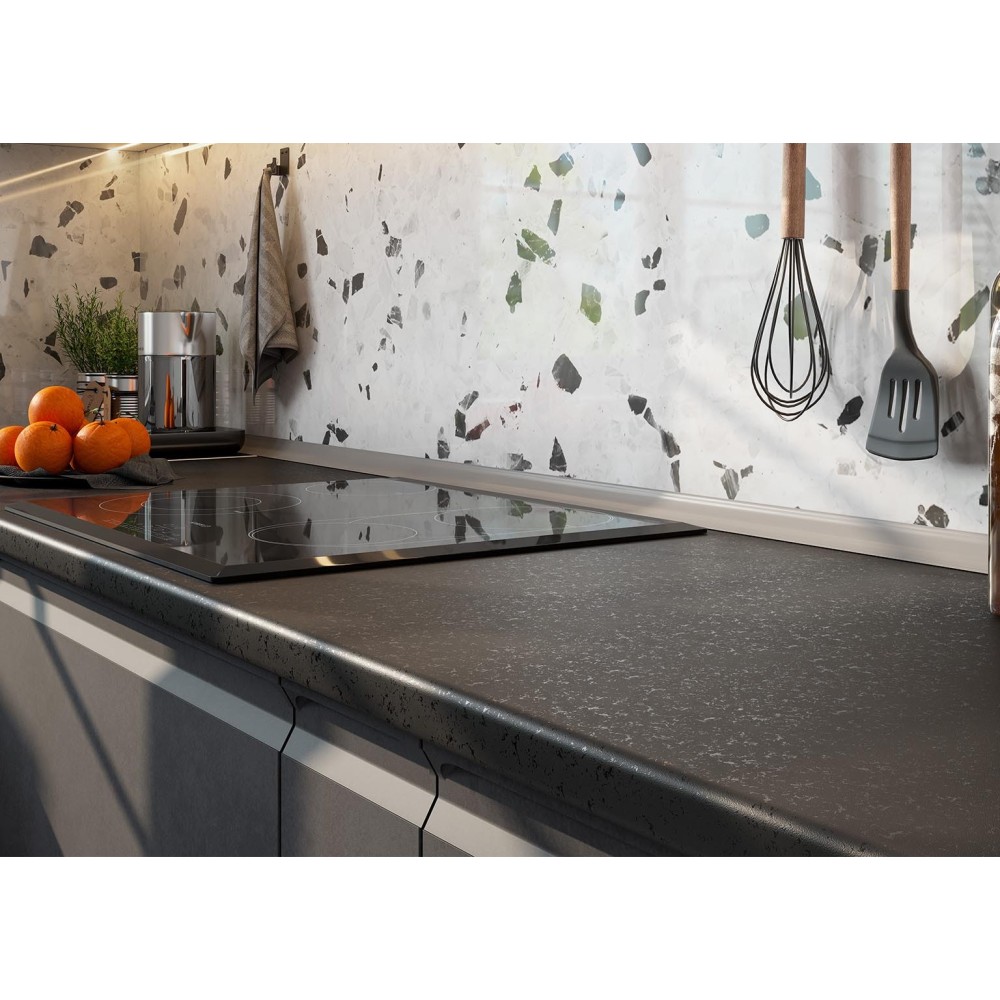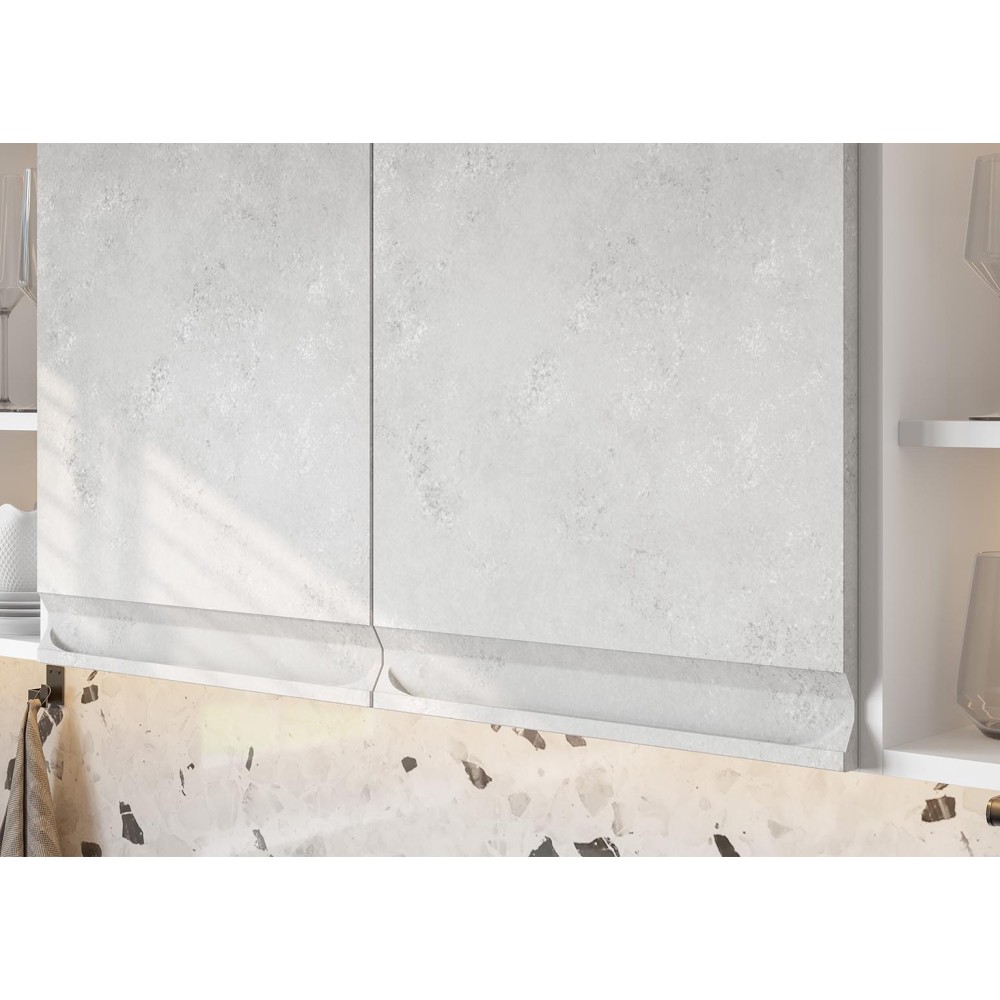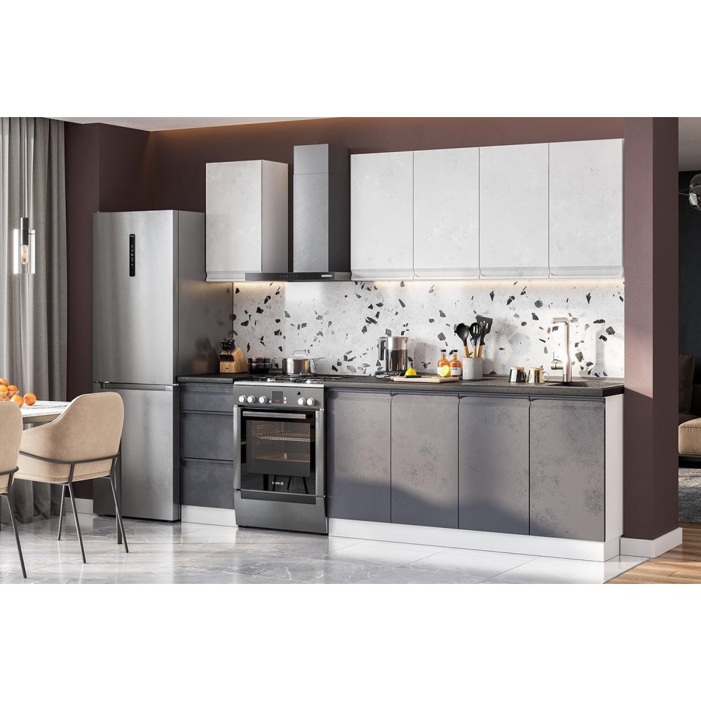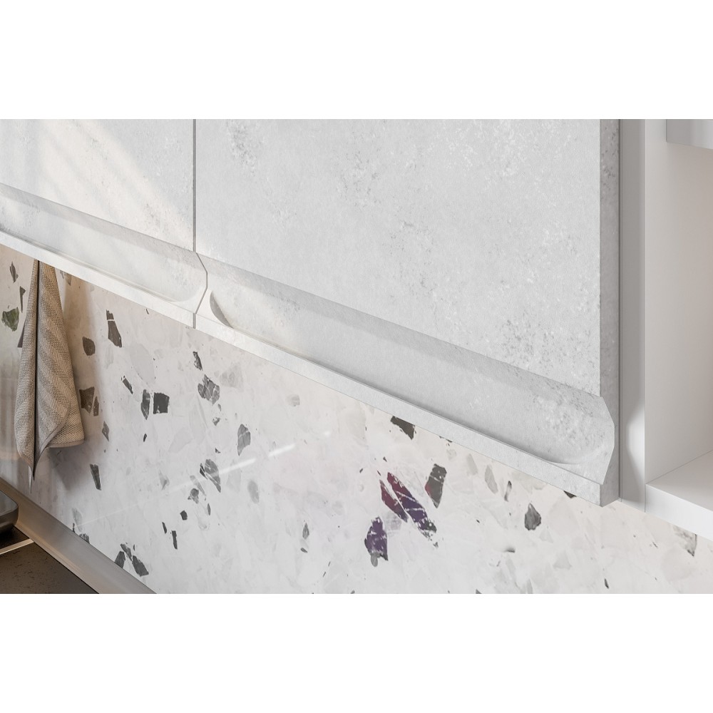 Модная в современном стиле кухня Вельвет с имитацией шлифованного бетона и матовым эффектом. Гладкие фасады без ручек визуально облегчают пространство и делают его более эстетичным.