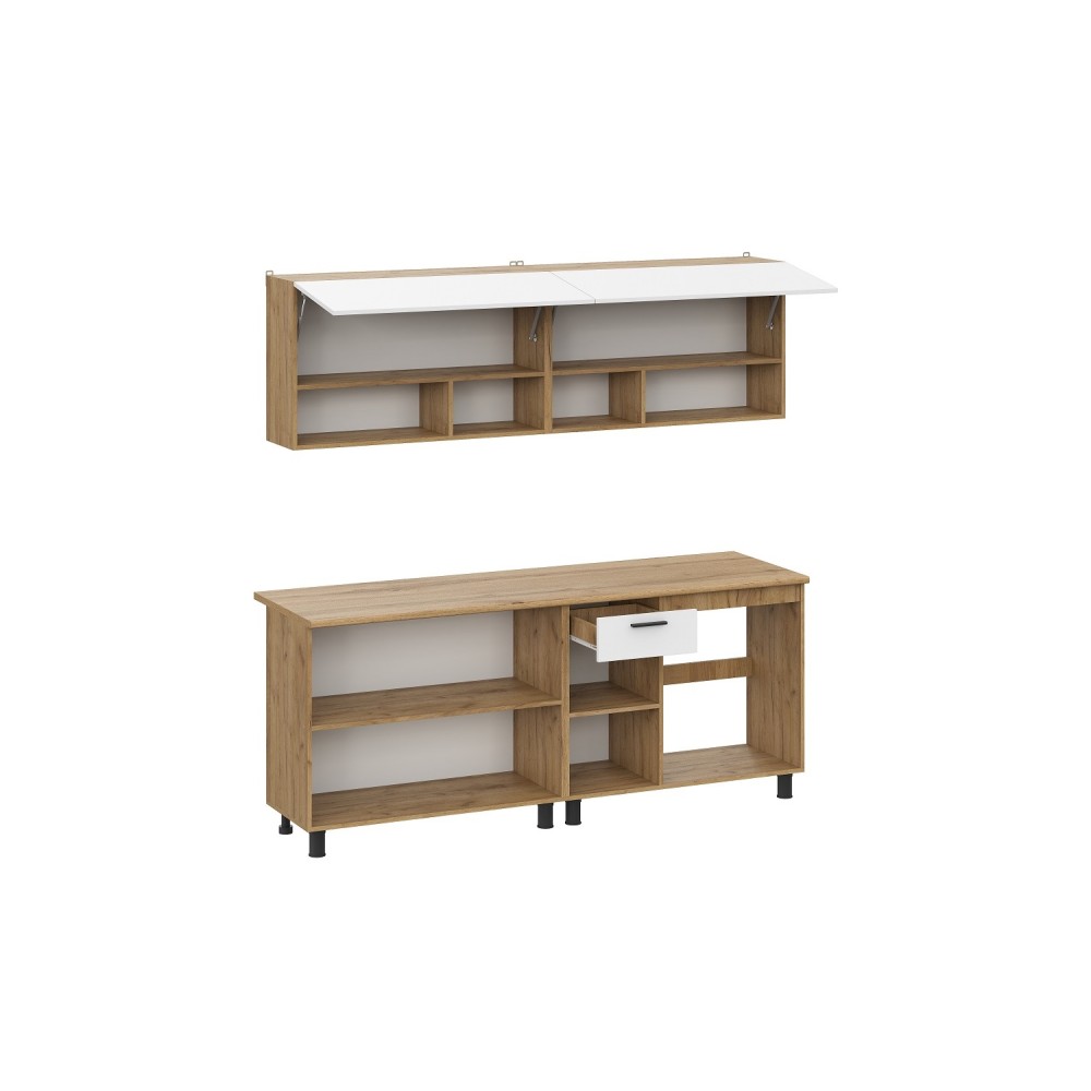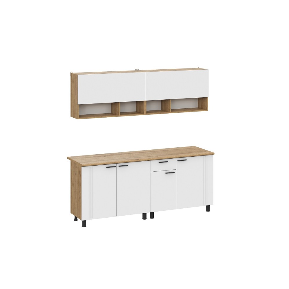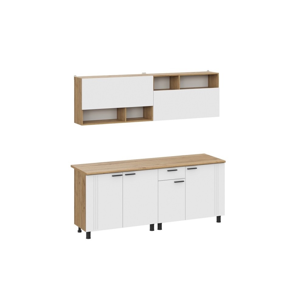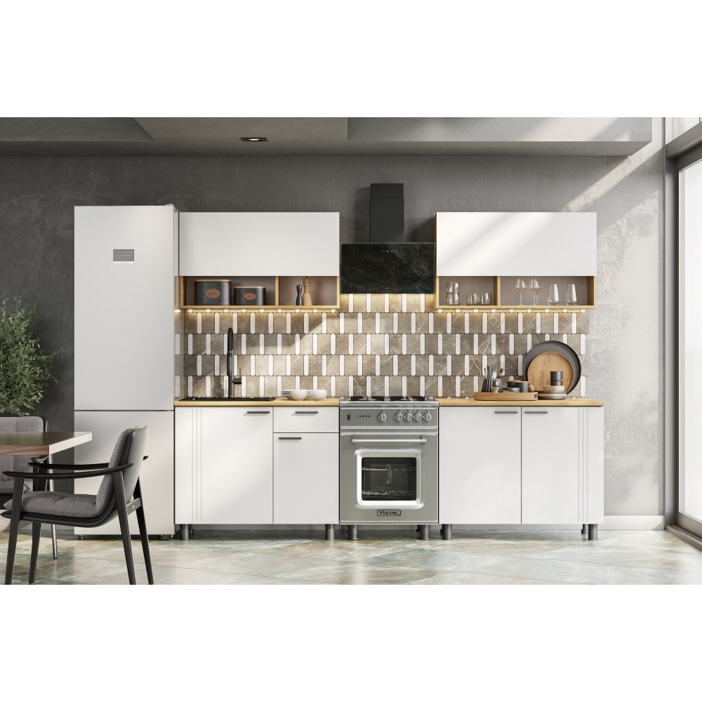 Цветовое решение: дуб золотой, белый— добавит изысканности и стиля интерьеру. Гарнитур состоит из удобных шкафов, ящиков и столешниц, обеспечивая максимальную функциональность и комфорт при готовке.