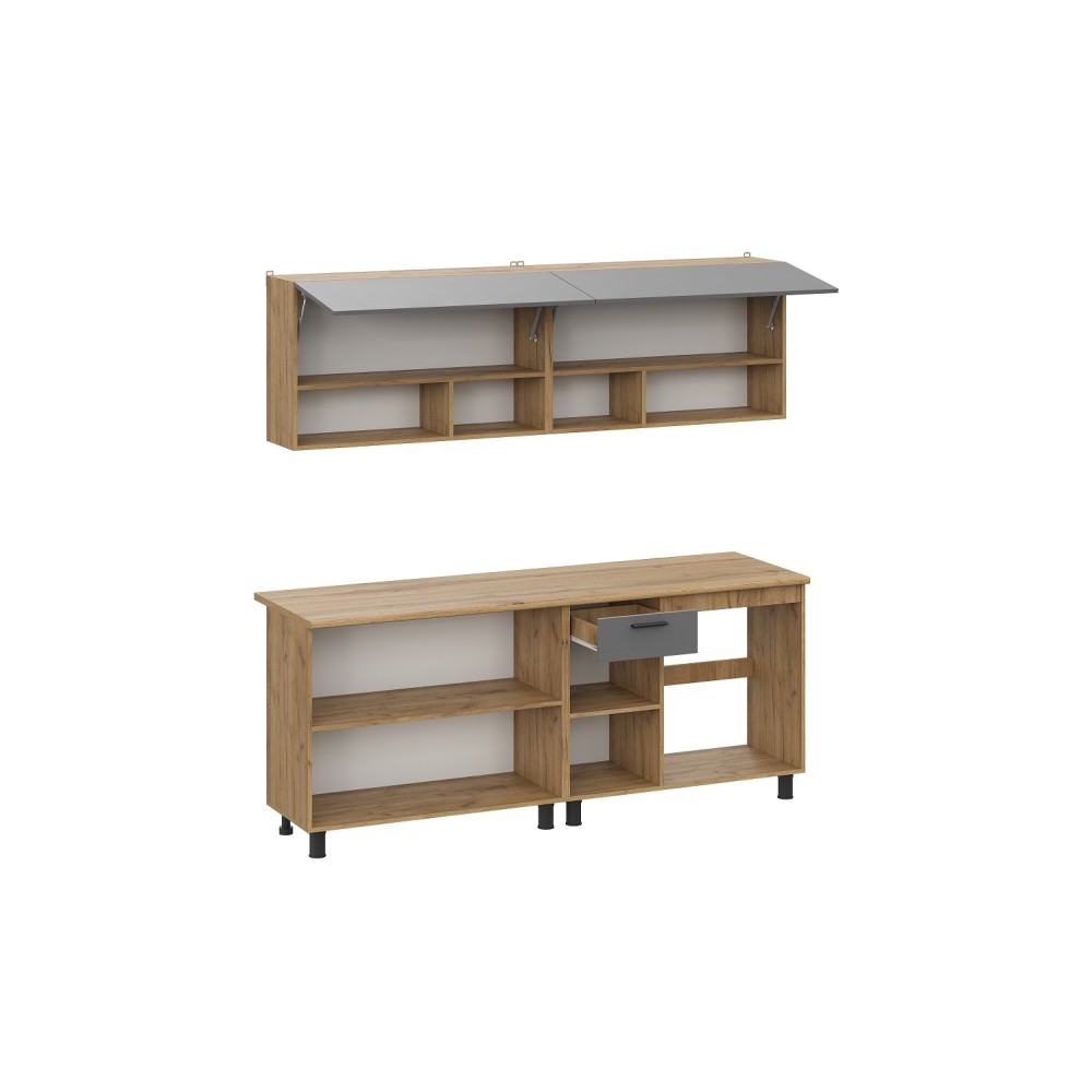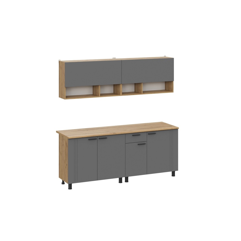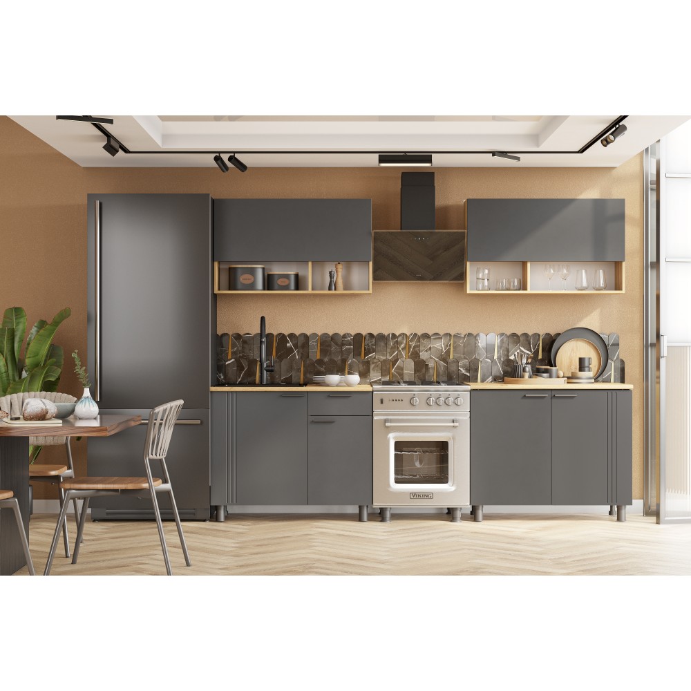 Цветовое решение: дуб золотой, графит— добавит изысканности и стиля интерьеру. Гарнитур состоит из удобных шкафов, ящиков и столешниц, обеспечивая максимальную функциональность и комфорт при готовке.