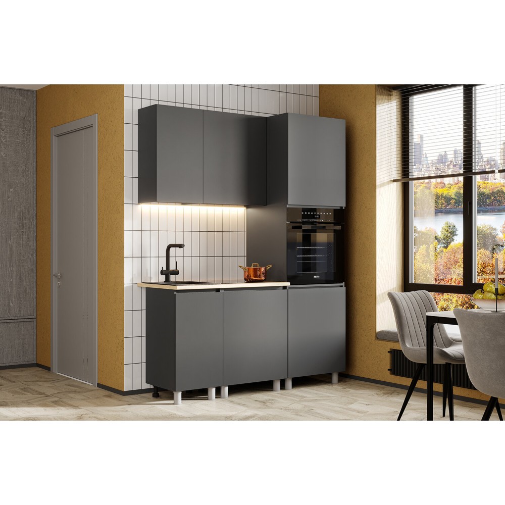 Кухонный гарнитур Денвер - это практичное решение для организации кухонной зоны в малогабаритной квартире или квартире-студии. Состоит из 5-ти удобных модулей. Два верхних шкафа шириной 40 и 60 см оснащены распашными фасадами, за дверцами шкафов скрываются полки. Нижний ряд состоит из рабочих столов с полками шириной 40 и 60 см и пенала для духового шкафа.