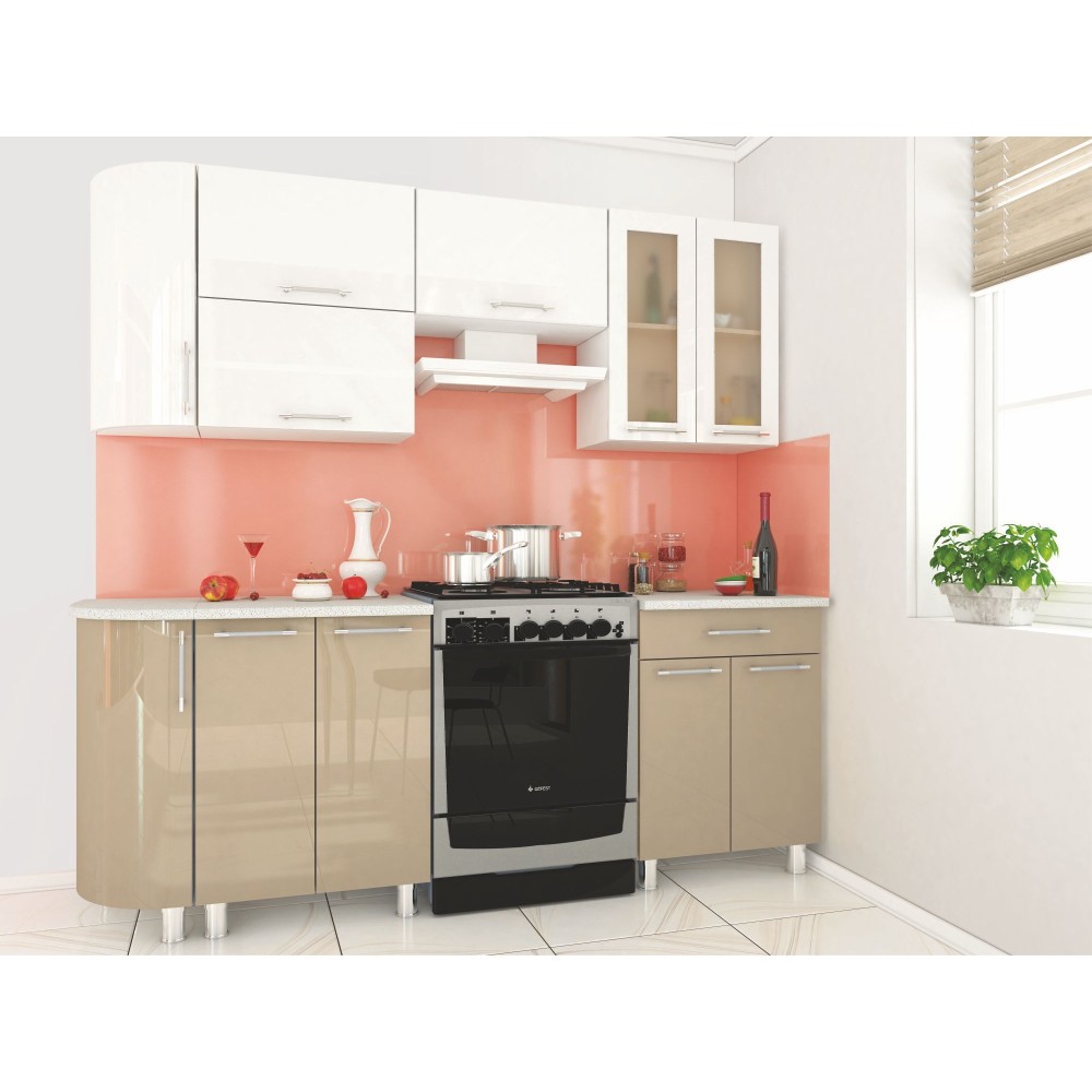 Прямая кухня Танго с закругленными краями в нежном пастельном исполнении — многофункциональная система хранения в стиле модерн для современного интерьера. В этом гарнитуре гармонично сочетаются два нейтральных оттенка, белый и мокко, которые придадут Вашему помещению атмосферу уюта и тепла. Глянцевые фасады, металлические ручки, стилизованные под рейлинги, матовые стеклянные фасады и угловое радиусное завершение создают ощущение единства и законченности.