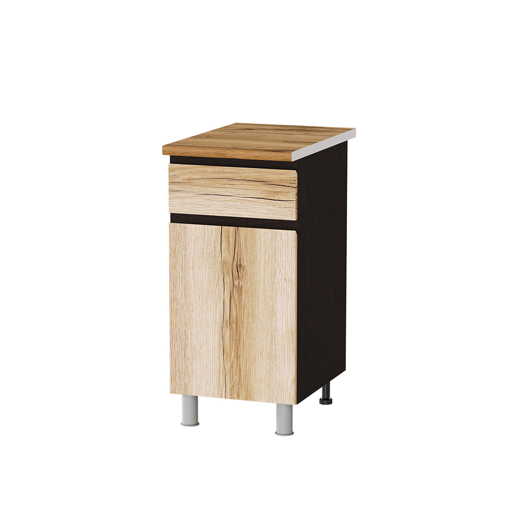 Напольный шкаф с ящиком и распашным фасадом Плейона в цвете венге/дуб делано. Регулируемые ножки придают конструкции устойчивость.