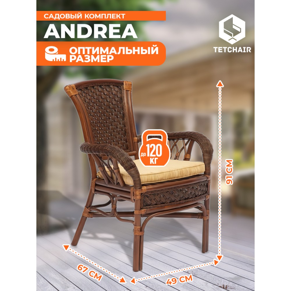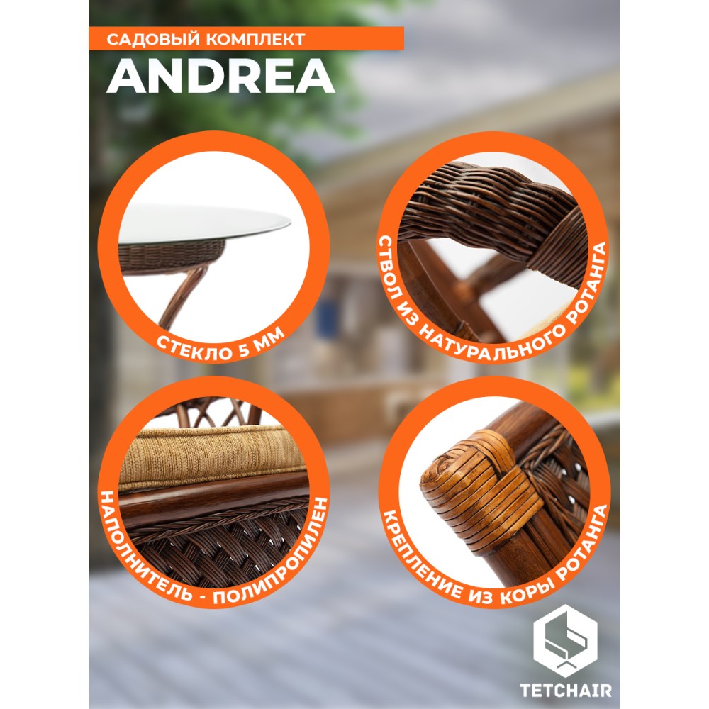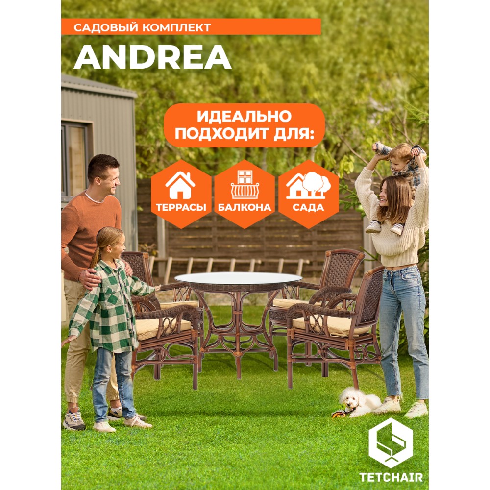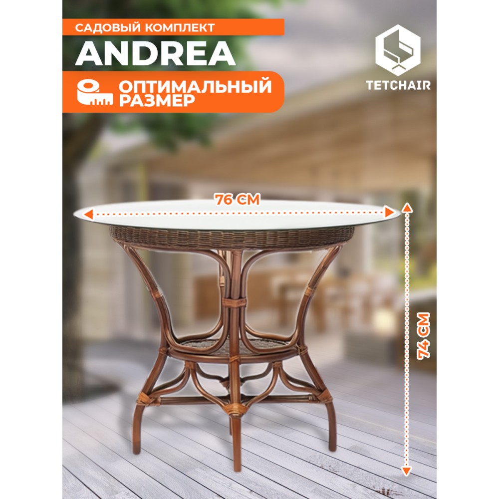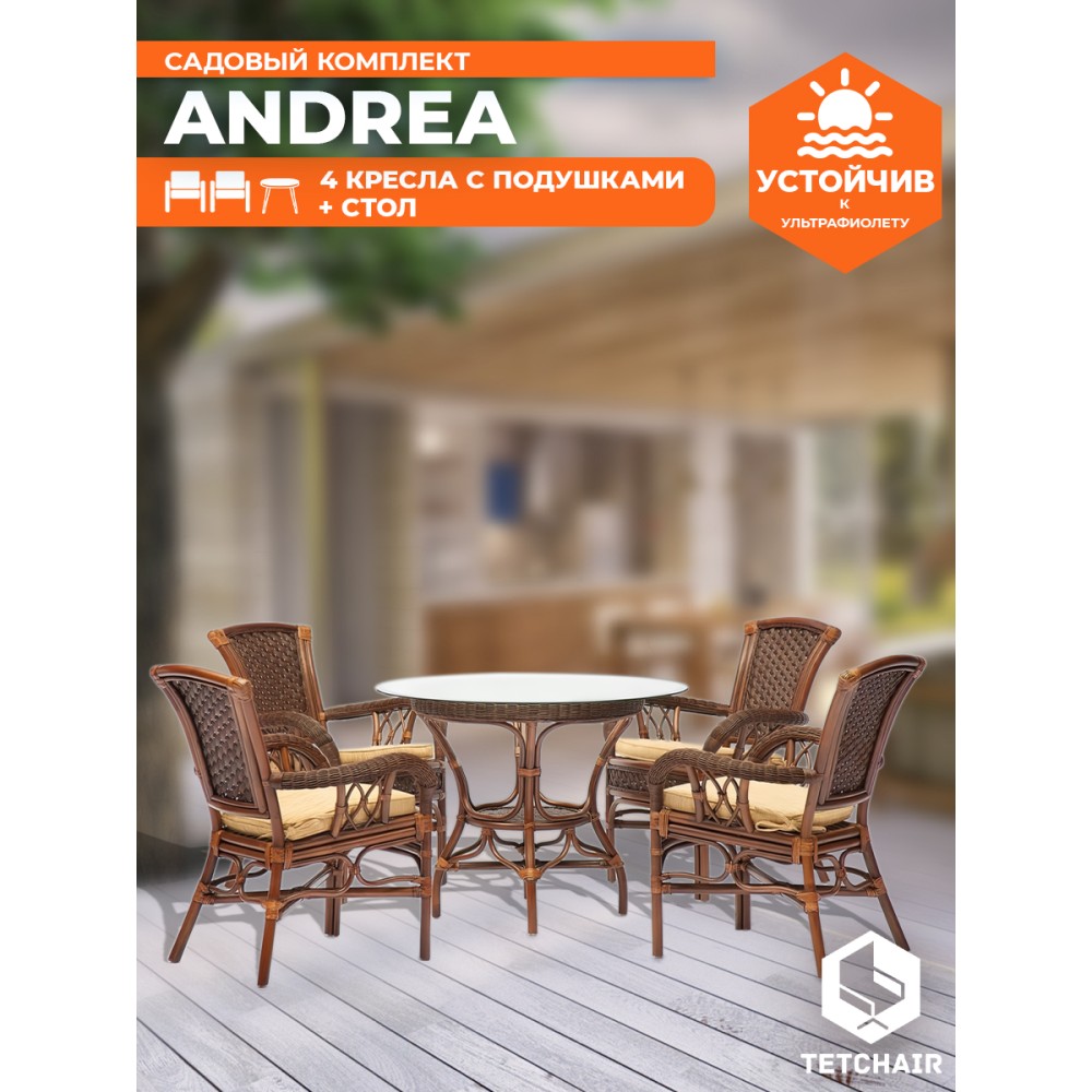 Изысканный обеденный комплект мебели Secret De Maison из коллекции ANDREA, состоящий из стола и четырех кресел, − идеальное решение для отдыха на загородном участке. Элегантные стулья с эргономичной спинкой, высокими подлокотниками, мягкой подушкой на сиденье и усиленным основанием каркаса обеспечат комфортный отдых и приятное времяпрепровождение на свежем воздухе. Устойчивый стол, дополненный нижней полкой, со столешницей из закаленного стекла добавит благородства и элегантности в оформление вашего сада. Стекло обладает повышенной прочностью, долговечностью, способно многие годы не утрачивать своей первоначальной привлекательности. Круглая форма стола располагает к приятному и непринужденному общению. Тканевая обивка подушек на сиденье проста в уходе, прослужит вам долгие годы, сохраняя свой первоначальный вид. Комплект выполнен из натурального ротанга с использованием нескольких видов традиционного индонезийского плетения и покрыт прозрачным матовым лаком, устойчивым к УФ-излучению. Он прочен, надежен, устойчив к повышенной влажности. Мебель идеально сочетается с изделиями из коллекции ANDREA, поставляется в собранном виде.