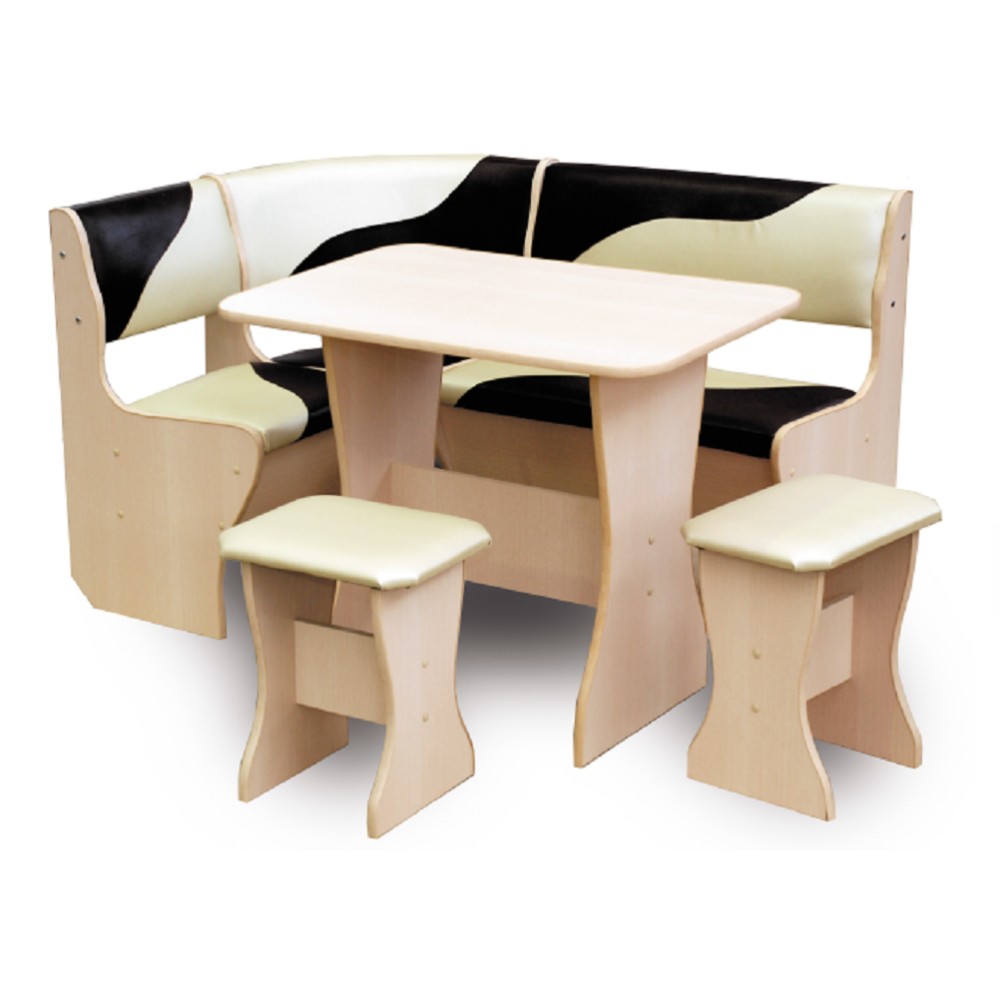Классический кухонный уголок с полочкой, идеально подходящий для небольших кухонь. С универсальной правой/левой сборкой. Под сиденьями есть ящики для хранения, корпус сделан из ЛДСП, а обивка из экокожи, флок.