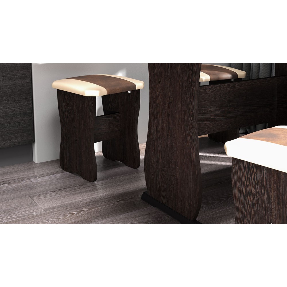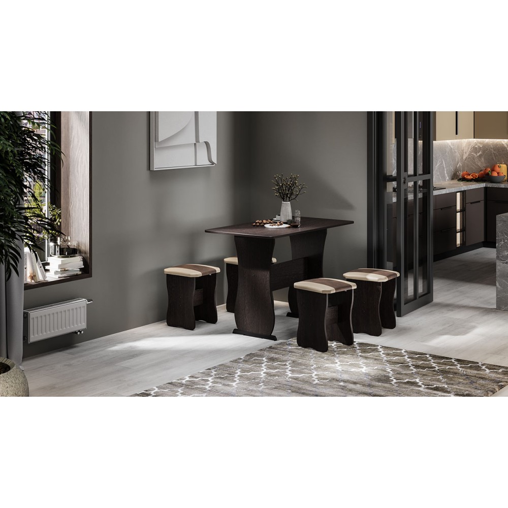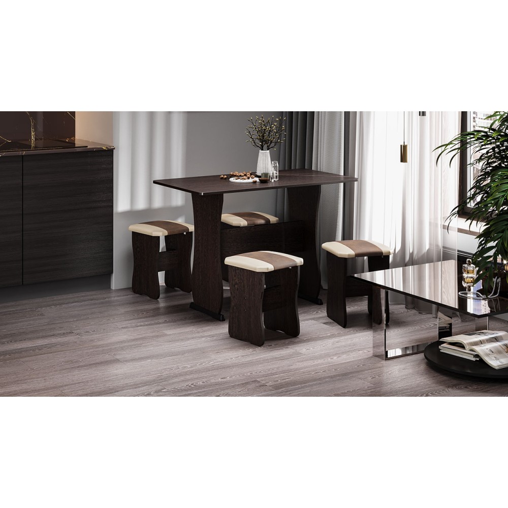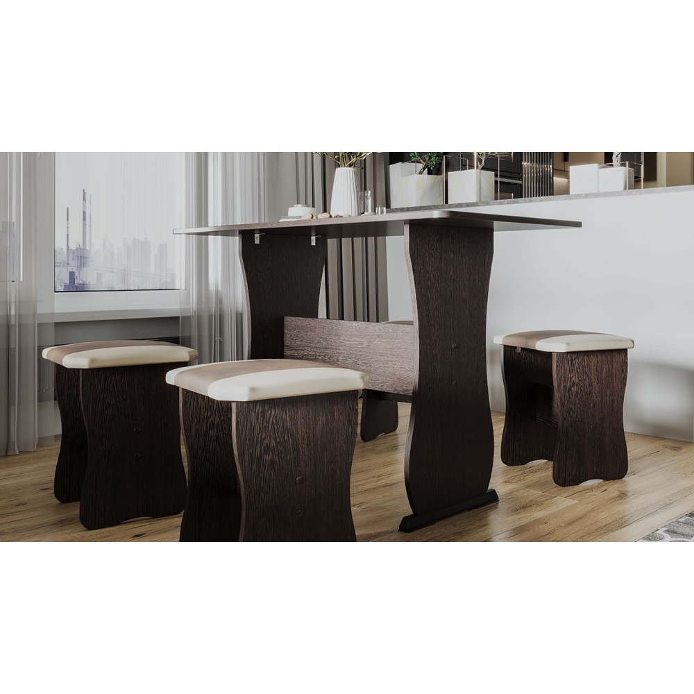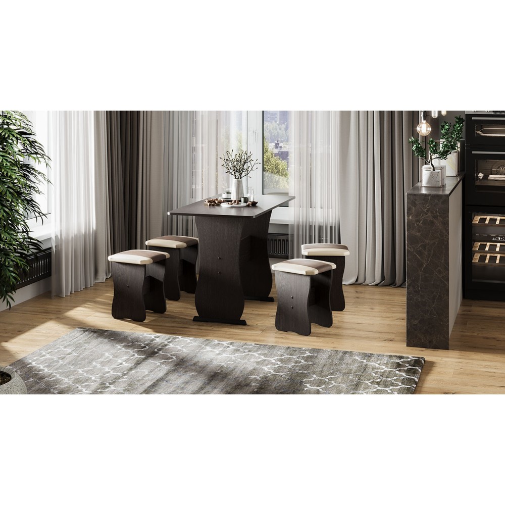 Комплектация : стол + 4 табурета, материал мягкого сидения - кожзам.