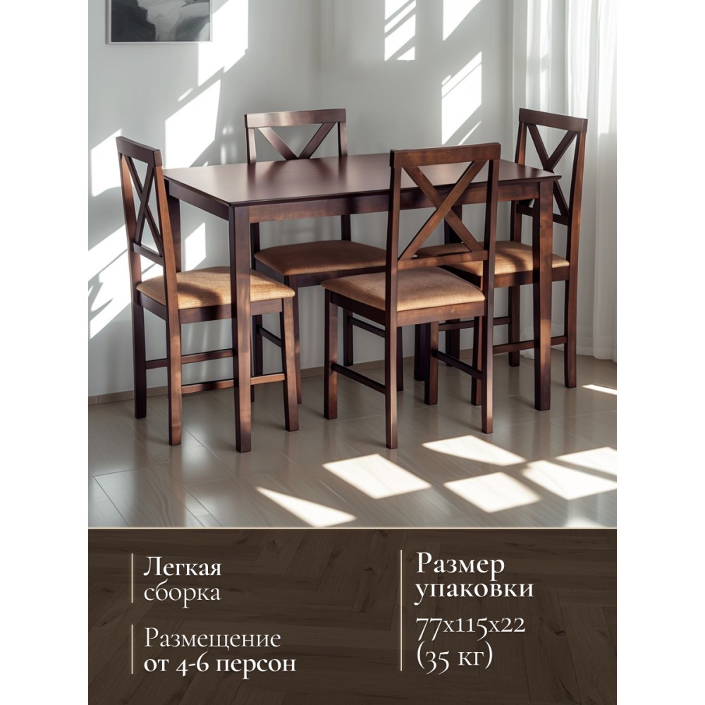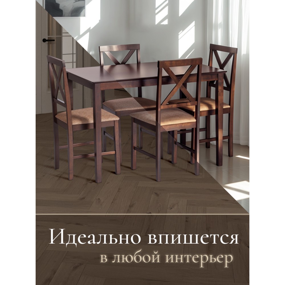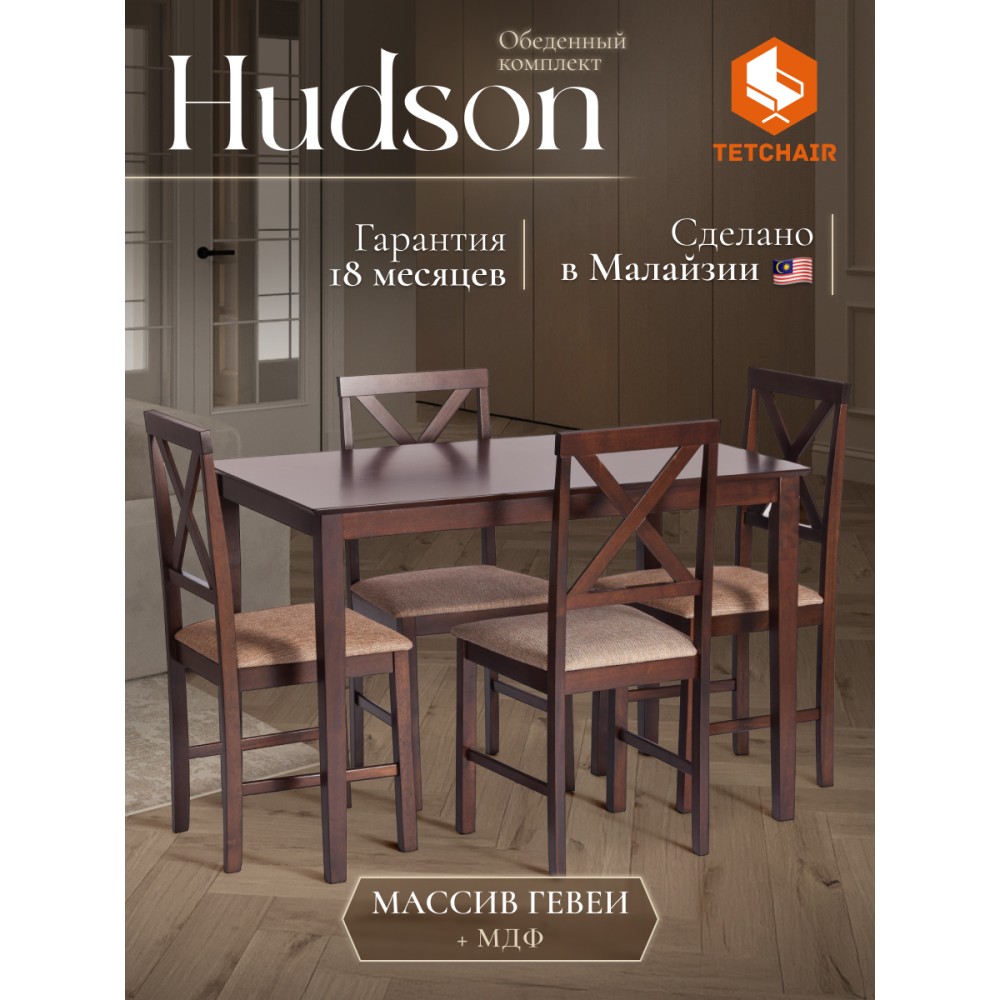 Стильный обеденный комплект Хадсон из Дельфийской коллекции идеально дополнит интерьер вашей кухни или столовой. Обеденная группа будет отлично смотреться в гостиной, кухни или столовой создавая в комнате атмосферу спокойствия и комфорта. Каркас стола классической прямоугольной формы и основание стульев выполнены из массива гевеи - прочной и долговечной древесины. Столешница изготовлена из МДФ, она не требует специального ухода, не деформируется при изменении температуры и попадания влаги. Мягкая тканевая обивка стула не меняет форму со временем, будет радовать вас своим первоначальным видом долгие годы. Стол в благородном цвете темный орех (Cappuccino) в сочетании с сиденьями стульев коричнево-золотого оттенка добавит в ваш интерьер элементы элегантности. Уникальный обеденный комплект Хадсон из Дельфийской коллекции будет идеальным решением для квартиры и загородного дома. Данный комплект предполагает комфортное размещение четырех человек, для приятного и длительного времяпрепровождения. Мебель поставляется в разобранном виде, необходима несложная сборка. Инструкция прилагается.