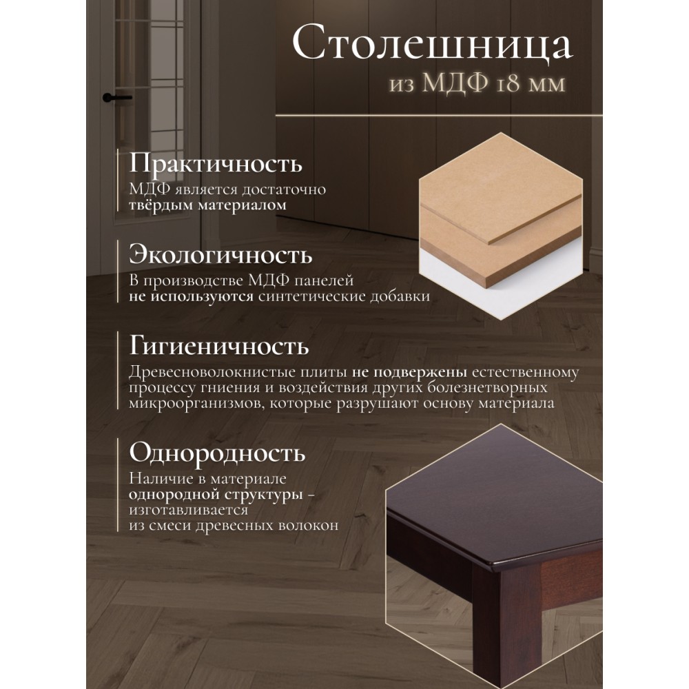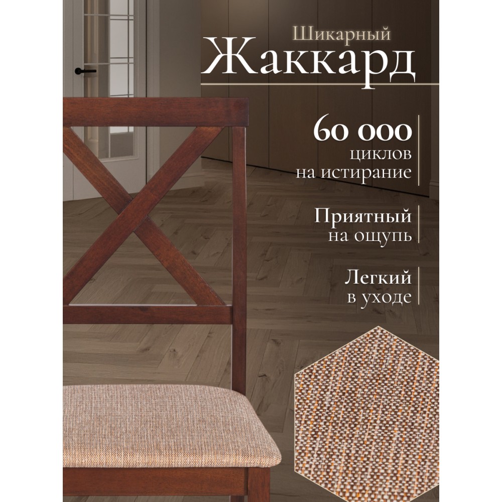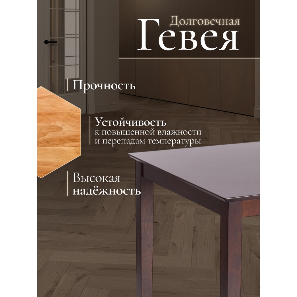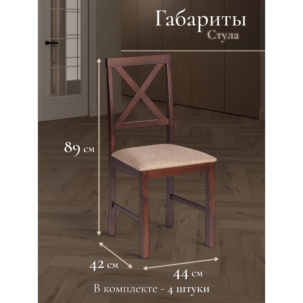 Стильный обеденный комплект Хадсон из Дельфийской коллекции идеально дополнит интерьер вашей кухни или столовой. Обеденная группа будет отлично смотреться в гостиной, кухни или столовой создавая в комнате атмосферу спокойствия и комфорта. Каркас стола классической прямоугольной формы и основание стульев выполнены из массива гевеи - прочной и долговечной древесины. Столешница изготовлена из МДФ, она не требует специального ухода, не деформируется при изменении температуры и попадания влаги. Мягкая тканевая обивка стула не меняет форму со временем, будет радовать вас своим первоначальным видом долгие годы. Стол в благородном цвете темный орех (Cappuccino) в сочетании с сиденьями стульев коричнево-золотого оттенка добавит в ваш интерьер элементы элегантности. Уникальный обеденный комплект Хадсон из Дельфийской коллекции будет идеальным решением для квартиры и загородного дома. Данный комплект предполагает комфортное размещение четырех человек, для приятного и длительного времяпрепровождения. Мебель поставляется в разобранном виде, необходима несложная сборка. Инструкция прилагается.
