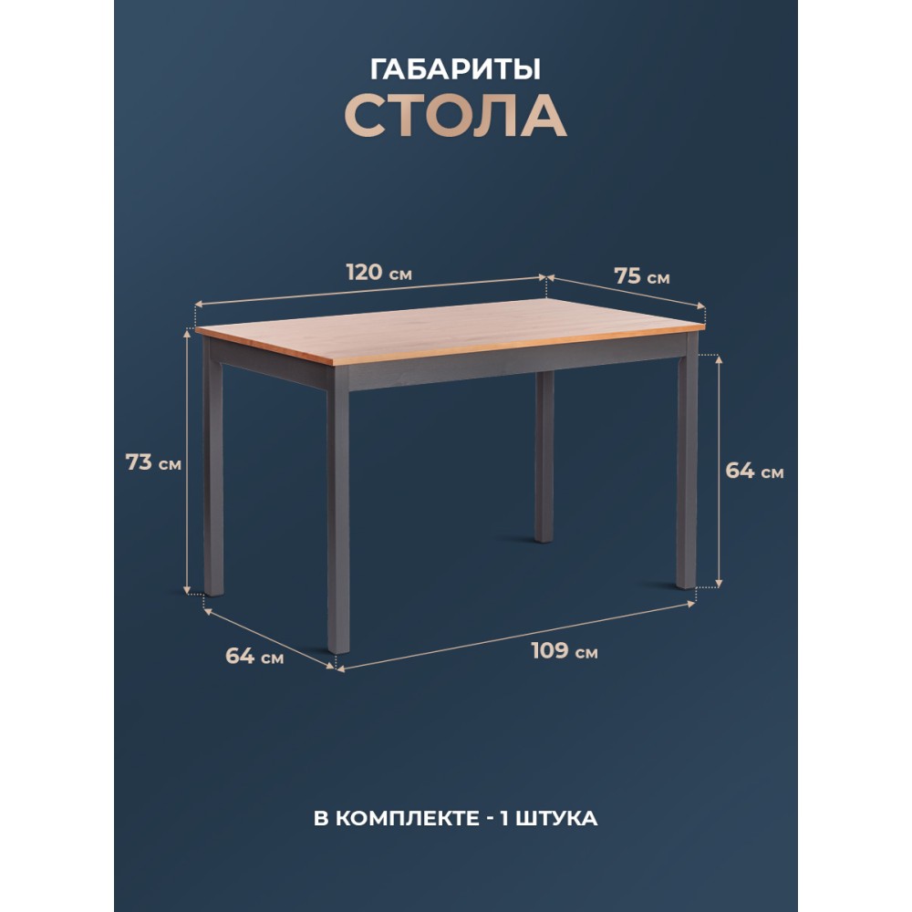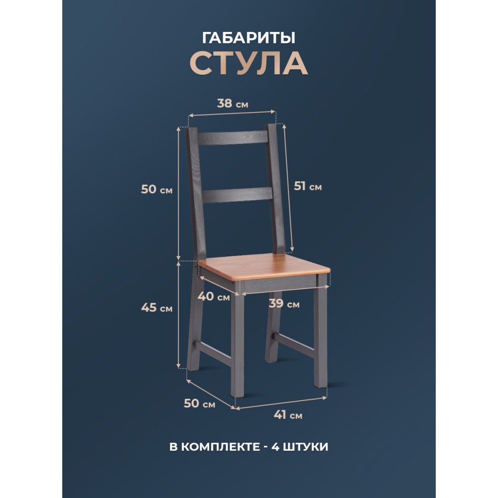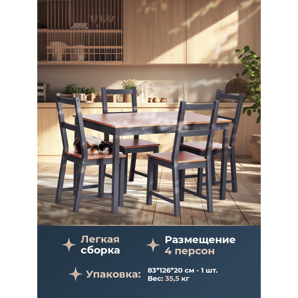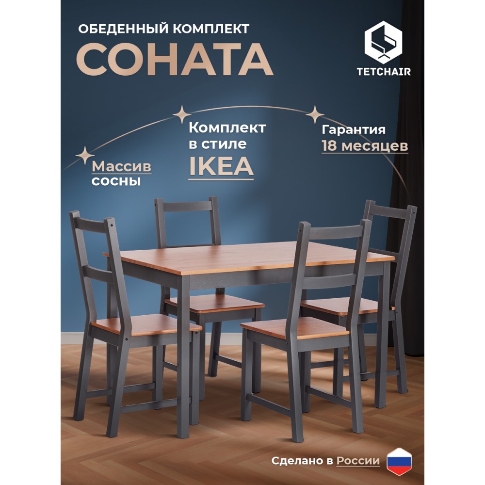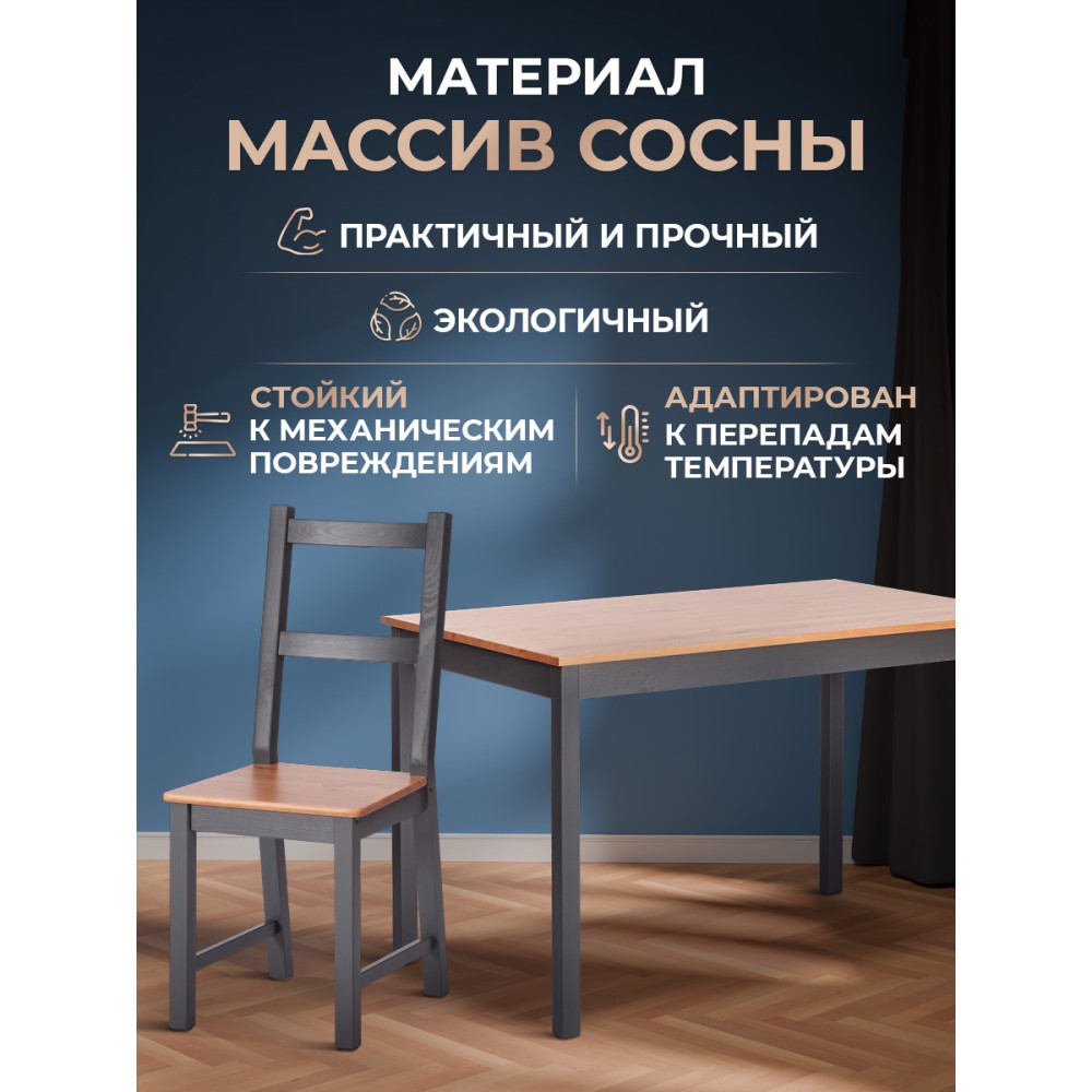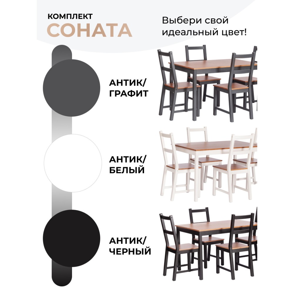 Обеденный комплект Соната из Дельфийской коллекции — это стильный и функциональный элемент интерьера вашей кухни или столовой. В комплект входят стол и четыре стула с прочным и долговечным каркасом из массива сосны. Античный оттенок столешницы и сидений стульев в сочетании с графитовым цветом придаёт интерьеру элегантность. Этот комплект будет хорошо смотреться как в городской квартире, так и в загородном доме, в столовой или на кухне, на террасе или веранде. Он позволяет разместить до четырёх человек и подходит для комфортного и длительного времяпрепровождения. Мебель поставляется в разобранном виде и легко собирается согласно инструкции.