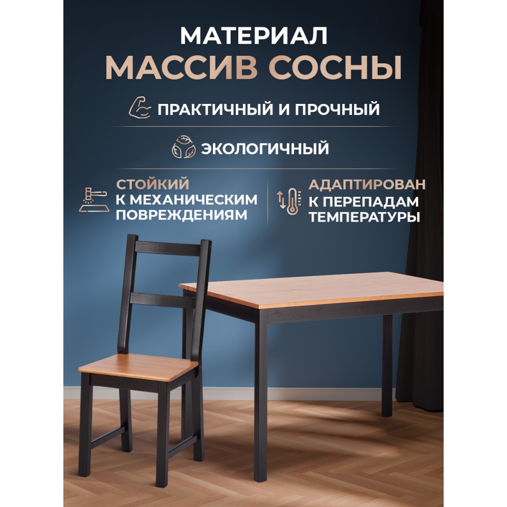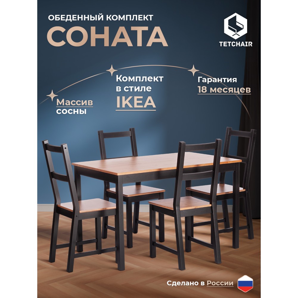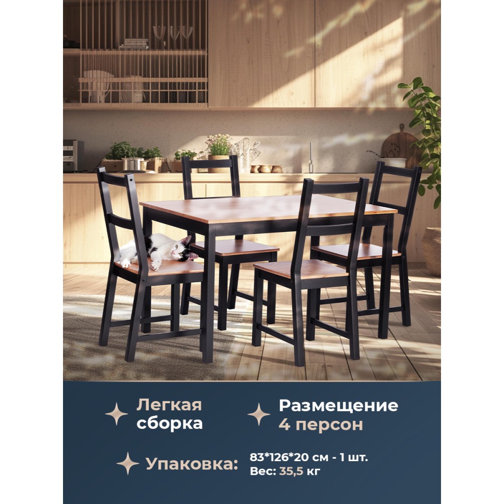 Обеденный комплект Соната из Дельфийской коллекции — это стильный и функциональный элемент интерьера вашей кухни или столовой. В комплект входят стол и четыре стула с прочным и долговечным каркасом из массива сосны. Античный оттенок столешницы и сидений стульев в сочетании с черным цветом придаёт интерьеру элегантность. Этот комплект будет хорошо смотреться как в городской квартире, так и в загородном доме, в столовой или на кухне, на террасе или веранде. Он позволяет разместить до четырёх человек и подходит для комфортного и длительного времяпрепровождения. Мебель поставляется в разобранном виде и легко собирается согласно инструкции.