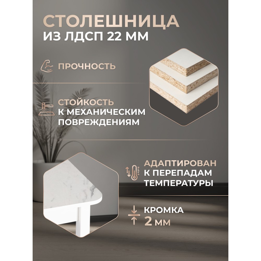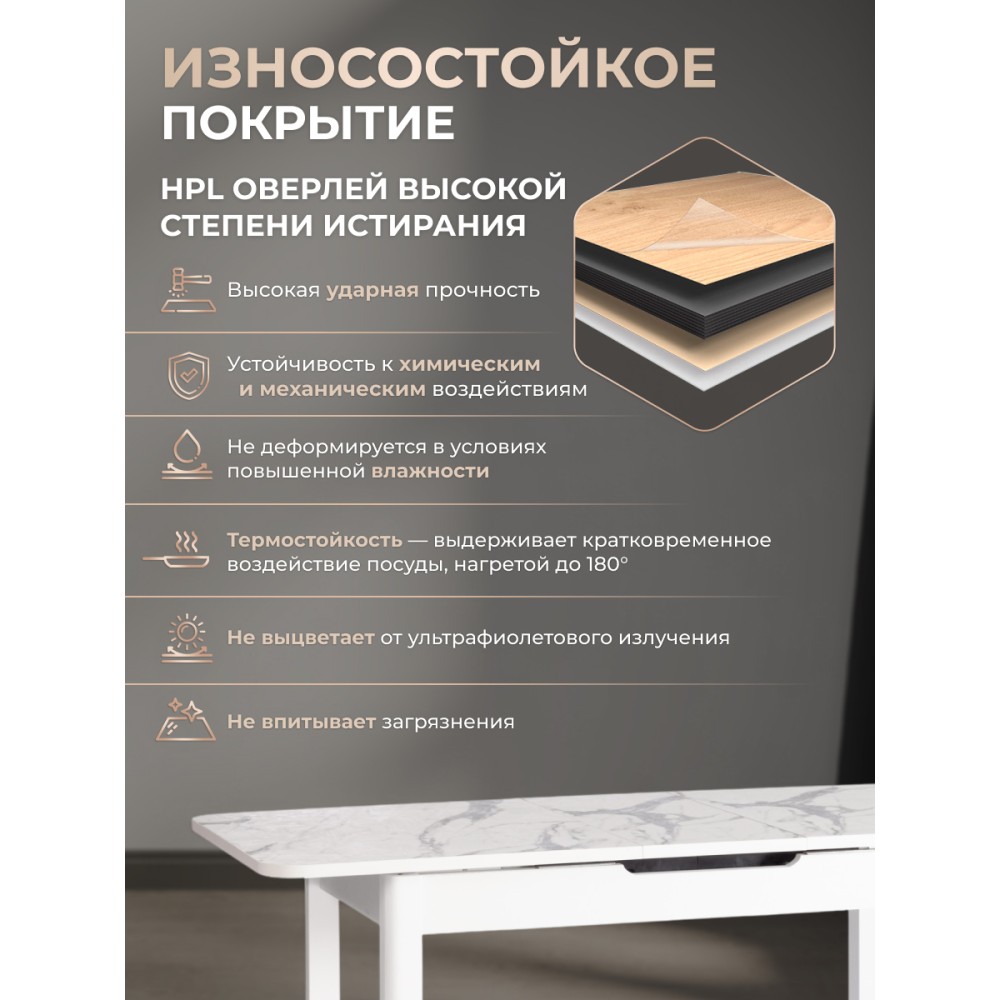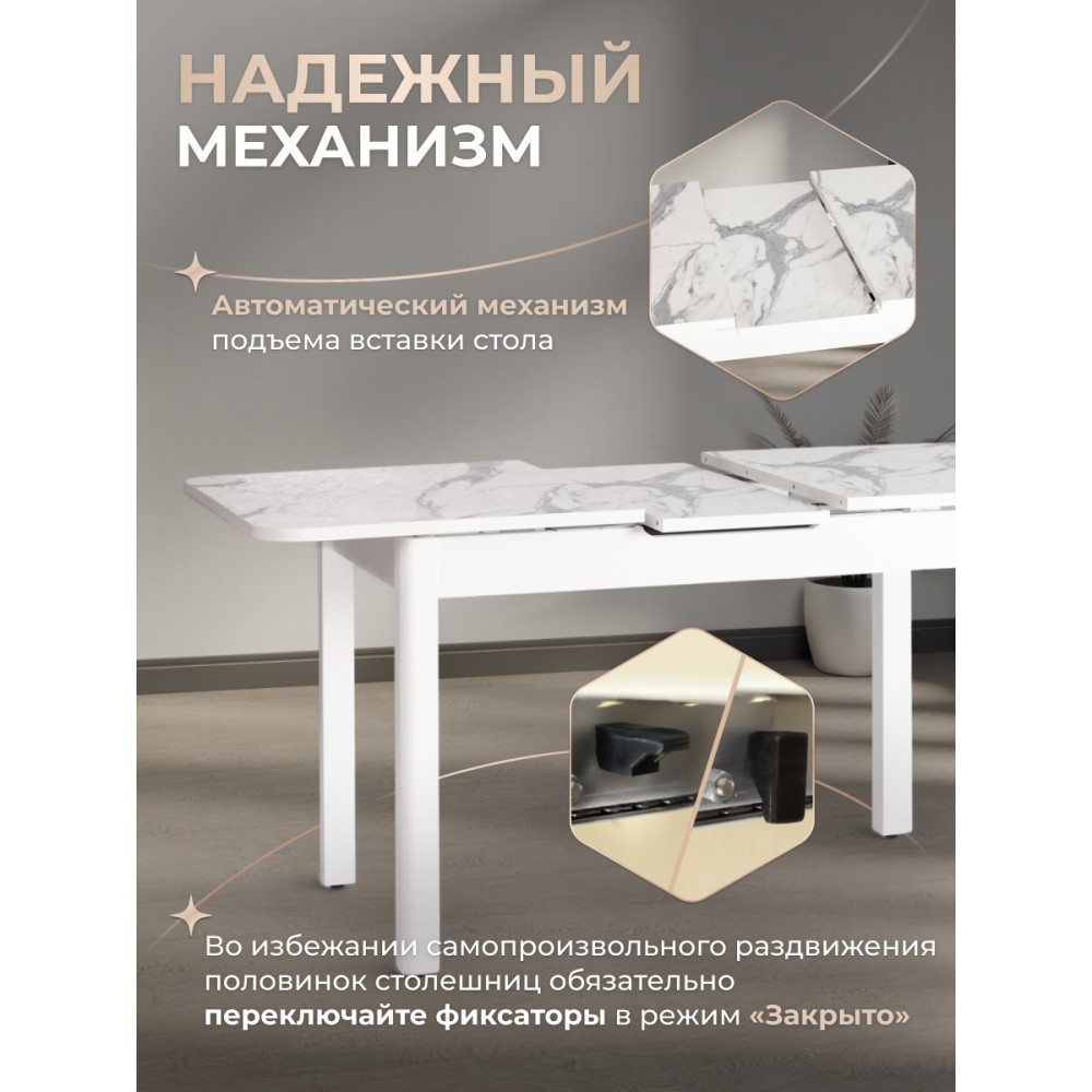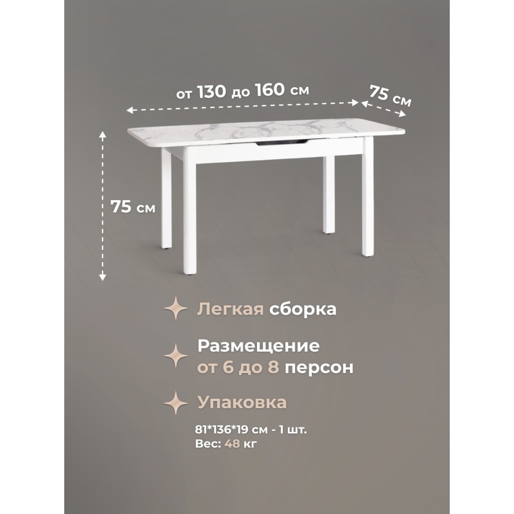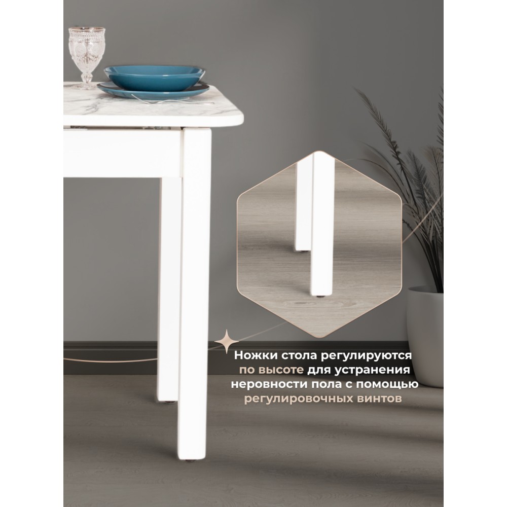 Раскладной стол ALIGERY из коллекции Modern сделает оригинальным и узнаваемым интерьер загородного дома или городской квартиры. Стол подойдёт для гостиной, кухни или столовой. Столешница цвета мрамор светлый и вставка выполнены из ЛДСП толщиной 22 мм на лицевую поверхность которых нанесен защитный слой HPL толщиной 1 мм. HPL имеет защитное покрытие оверлей высокой степени истирания, которое повышает устойчивость поверхностей к повреждениям. Структурированная поверхность столлешницы с имитацией натурального камня придает изыканный вид. Используется кромка ПВХ 2 мм. Для увеличения размера стола используется автоматический механизм подъема вставки стола. Прочные белые ножки из массива березы, окрашены. Ножки стола регулируются по высоте для устранения неровности пола с помощью регулировочных винтов. Во избежании самопроизвольного раздвижения половинок столешниц обязательно переключайте фиксаторы в режим "Закрыто". Уникальная модель впечатлит своей прочностью, простотой в уходе и долговечностью, придаст помещению элегантность, изысканность и акцентирует внимание гостей на обеденной зоне. За столом могут разместиться от 2 до 6 человек. Стол упакован в транспортировочный короб из ЛДСП + гофрокороб. Модель проста в сборке, инструкция по сборке прилагается.
