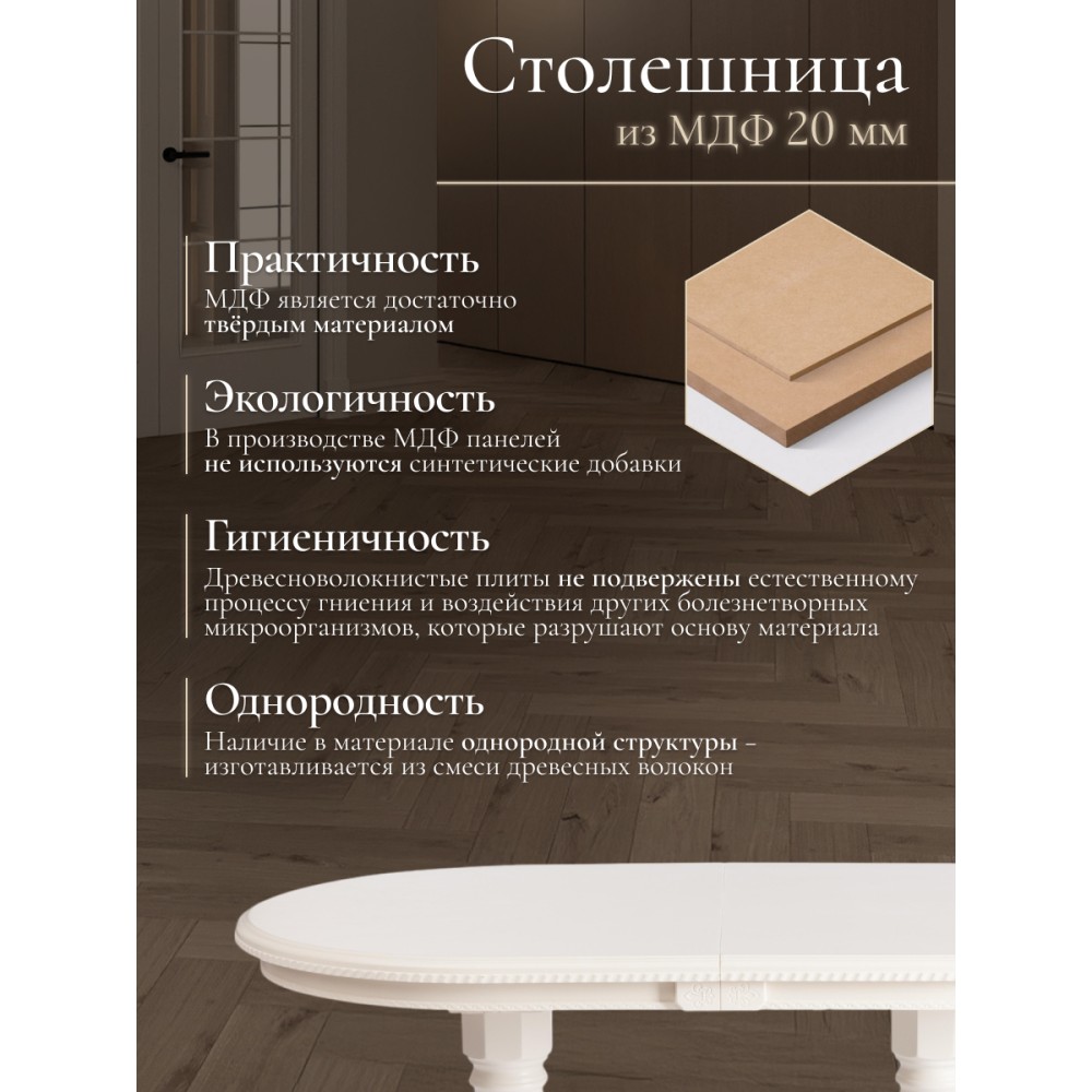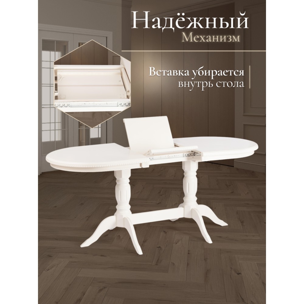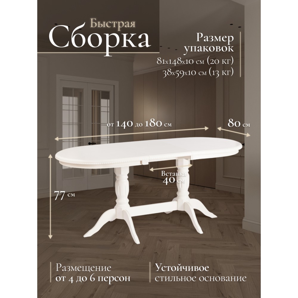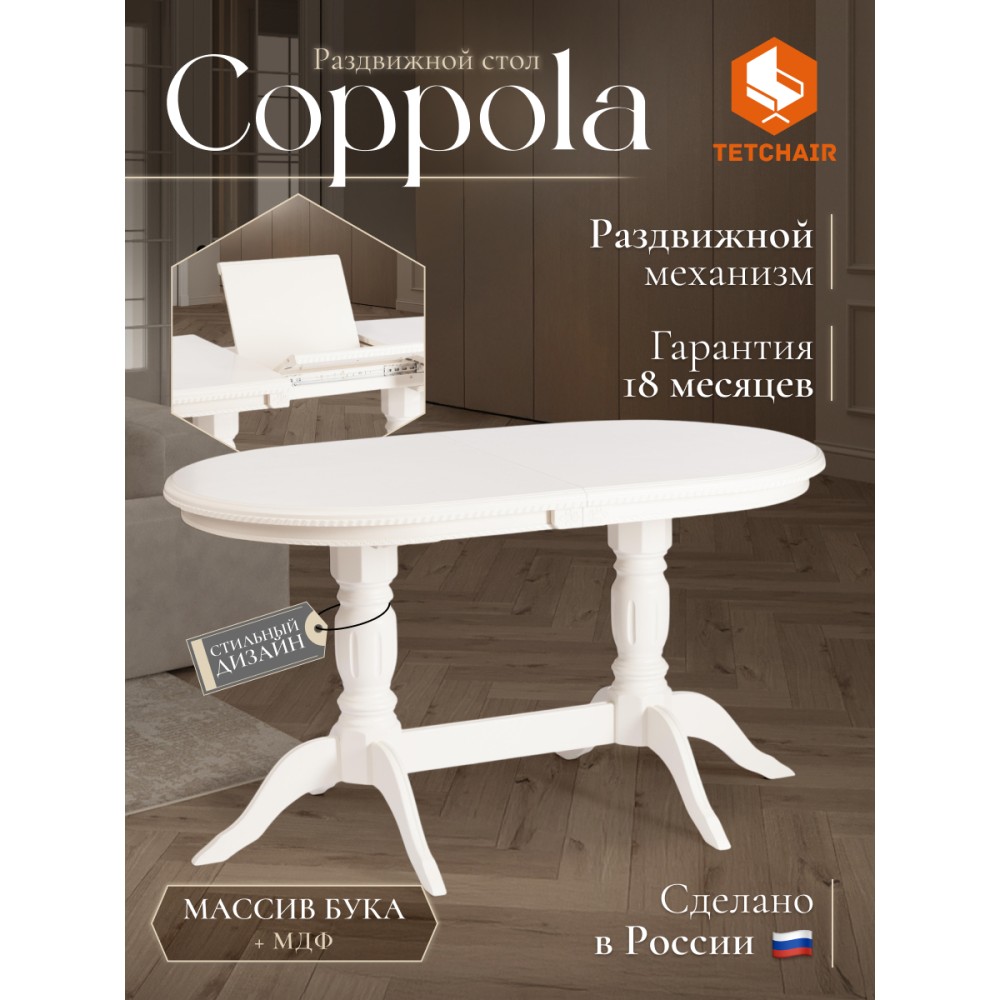 Одновременно простой и невероятно стильный стол COPPOLA из Миланской коллекции поможет создать уют и комфорт в вашем доме. Ножки стола изготовлены из массива бука, столешница из МДФ. Удобная конструкция стола с раздвижным механизмом поможет грамотно организовать пространство и комфортно разместить от шести до восьми человек. Модель не имеет острых углов, что является неоспоримым преимуществом при выборе предмета интерьера для дома. Резное основание стола устойчиво и основательно. Овальная столешница не требует специального ухода, выдерживает воздействие влаги и изменения температуры. Стол COPPOLA в цвете Ivory white удачно впишется в интерьер квартиры или загородного дома. Идеальное решение для столовой, гостиной или кухни. Стол восхитит владельца своей фундаментальностью, привлекательностью и долгим сроком службы. Модель поставляется в разобранном виде, необходима несложная сборка. Инструкция прилагается.