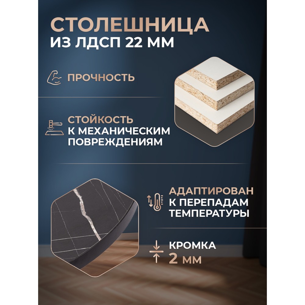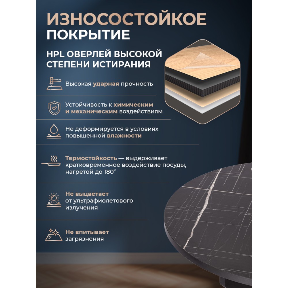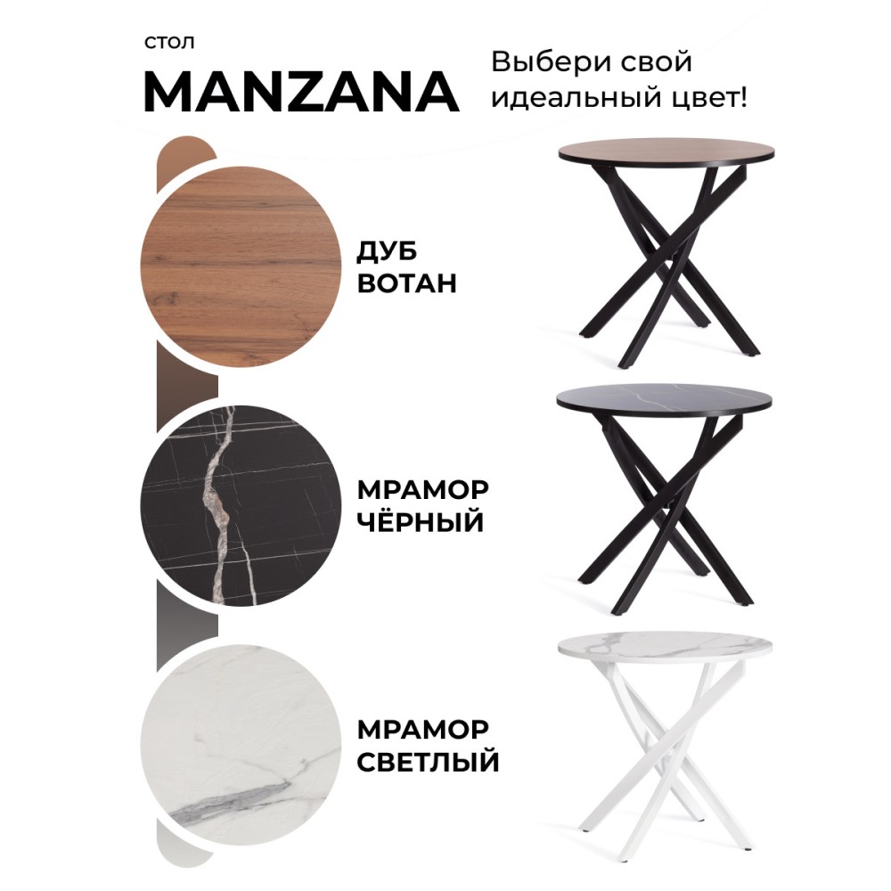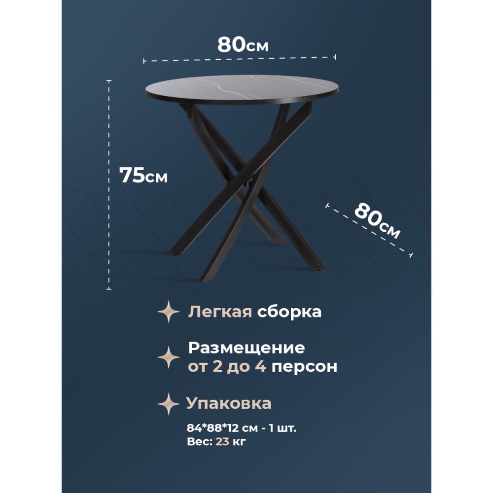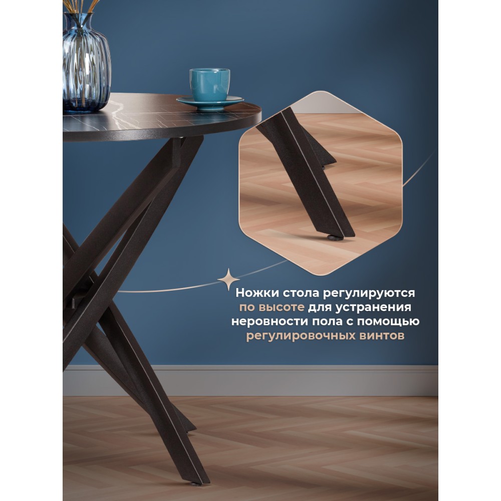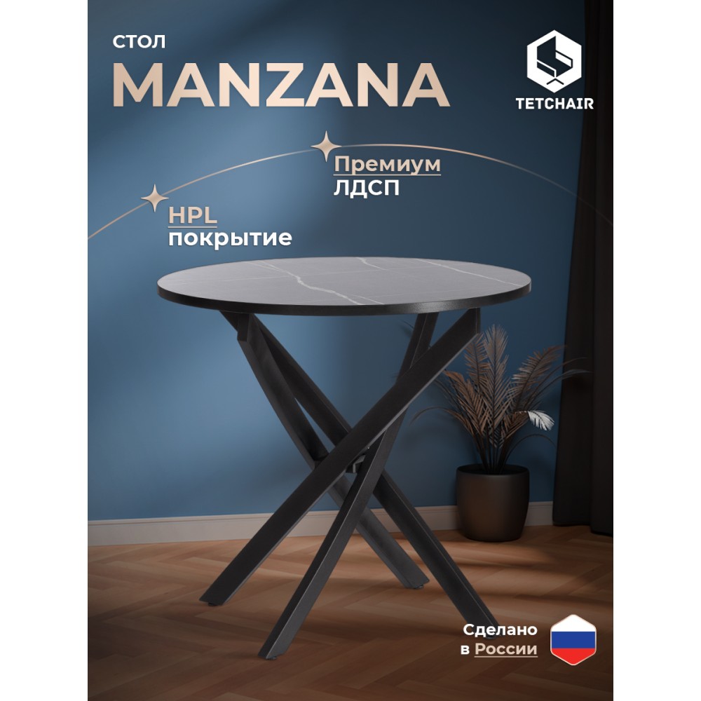 Круглый обеденный стол MANZANA из коллекции Modern отлично впишется в современный интерьер городской квартиры или загородного дома. Стол будет отлично смотреться в гостиной, кухне или столовой. Столешница цвета мрамор выполнен из ЛДСП толщиной 22 мм на лицевую поверхность которых нанесен защитный слой HPL толщиной 1 мм. HPL имеет защитное покрытие оверлей высокой степени истирания, которое повышает устойчивость поверхностей к повреждениям. Кромка столешницы оклеена высокопрочной пленкой из ПВХ толщиной 2 мм. Стильные черные изогнутые металлические ножки окрашены порошковой краской. Устойчивые ножки стола регулируются по высоте для устранения неровности пола. За столом могут разместиться от 2 до 6 человек.. Простая в сборке и прочная конструкция прослужит вам долгие годы. Стол упакован в транспортировочный короб из ЛДСП + гофрокороб. Модель проста в сборке, инструкция прилагается.