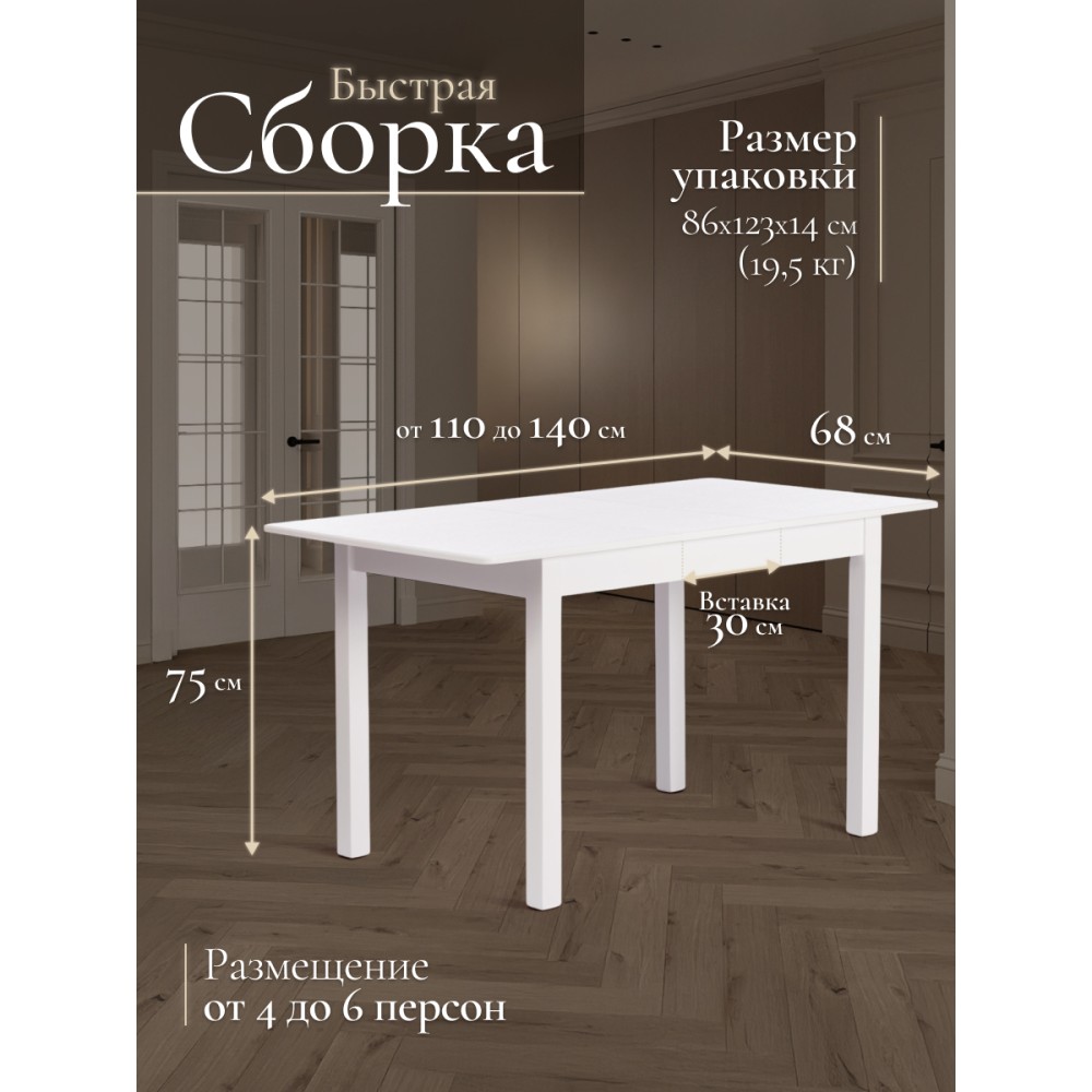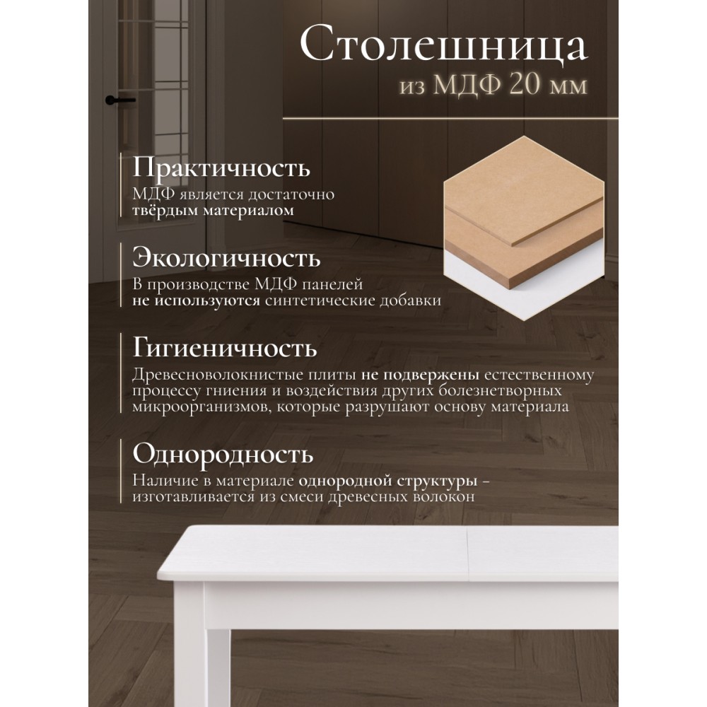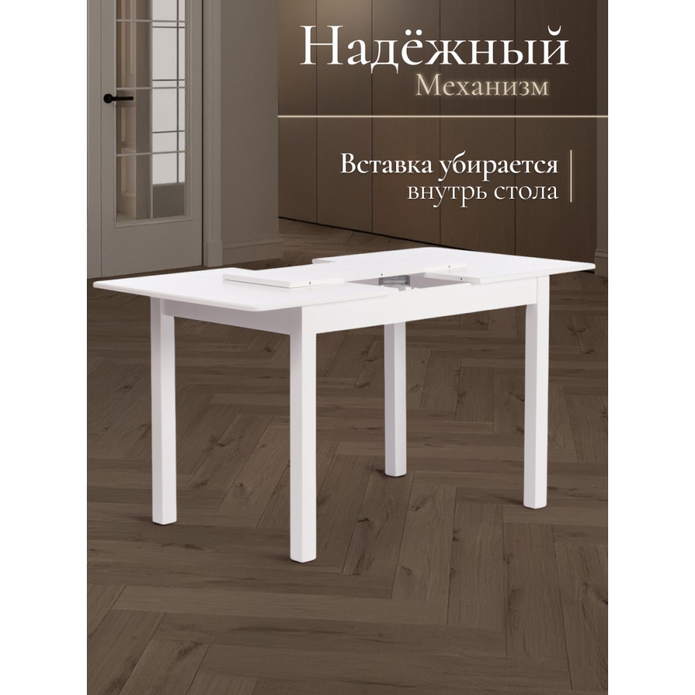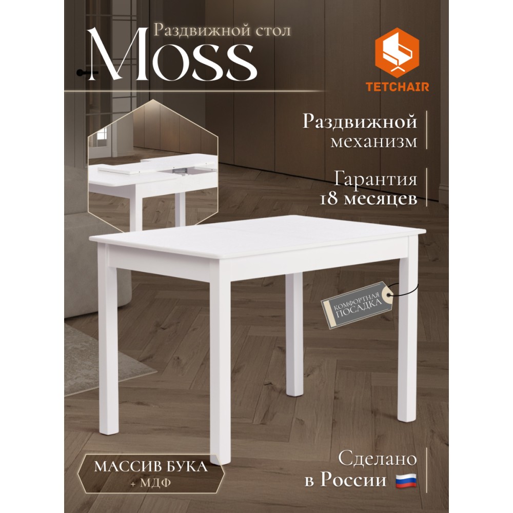 Прямоугольный раздвижной стол MOSS из Дельфийской коллекции - идеальное сочетание практичности, функциональности и надежности. Модель прекрасно впишется в дизайн столовой, кухни или гостиной. Стол выполнен из натуральной древесины бука. Такой материал обладает высокой износостойкостью, прочностью, долговечностью. Красивая естественная текстура добавляет модели оригинальности и привлекательности. Аккуратные прямые ножки стола устойчивы и основательны. Столешница из МДФ не требует специального ухода, легко чистится от загрязнений, устойчива к перепадам температур и воздействию влажности. Стол имеет надежный раздвижной механизм со вставкой, которая убирается в подстолье, что позволяет увеличить обеденное пространство и разместить с комфортом до шести человек. Экологически чистый и натуральный деревянный стол белого цвета выглядит элегантно и изысканно. Модель станет основным акцентом в интерьере вашего загородного дома или городской квартиры. Надежный и крепкий стол MOSS будет радовать владельца своими эксплуатационными качествами, устойчивостью, а также первоначальным внешним видом на протяжении длительного времени. Стол очень прост в сборке, инструкция по сборке прилагается.