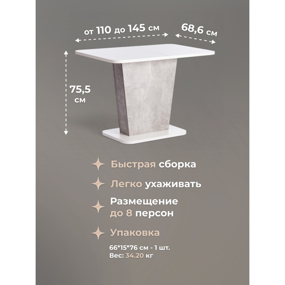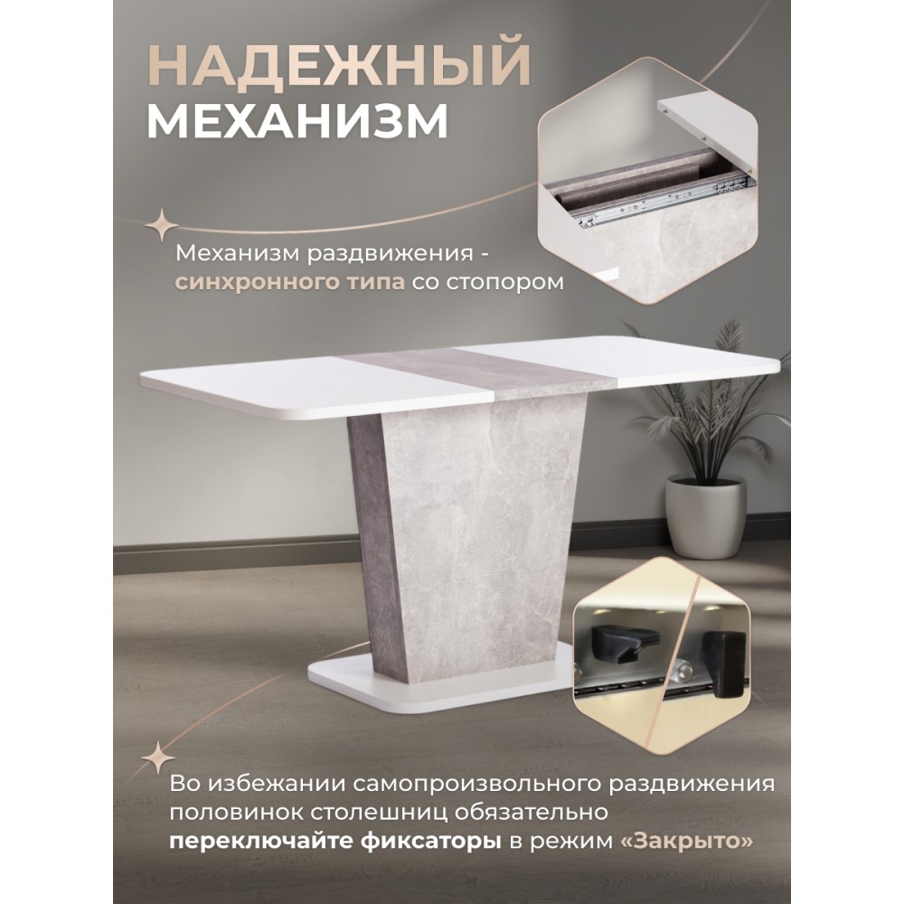 Стильный и компактный стол-трансформер GENT – это удачное сочетание простоты и элегантности. Стол хорошо впишется в обстановку гостиной, кухни или столовой благодаря отличному сочетанию белого цвета и цвета серого бетона. Его размеры позволяют комфортно разместить от четырех до шести человек. Вставка стола убирается в ножку. Края оклеены прочной пластиковой кромкой толщиной 2 мм. ЛДСП толщиной 25 мм. Механизм раздвижения - синхронного типа со стопором. Стол GENT отлично подойдёт для гостиной, для кухни или для загородного дома. Стол очень прост в сборке, инструкция по сборке прилагается.