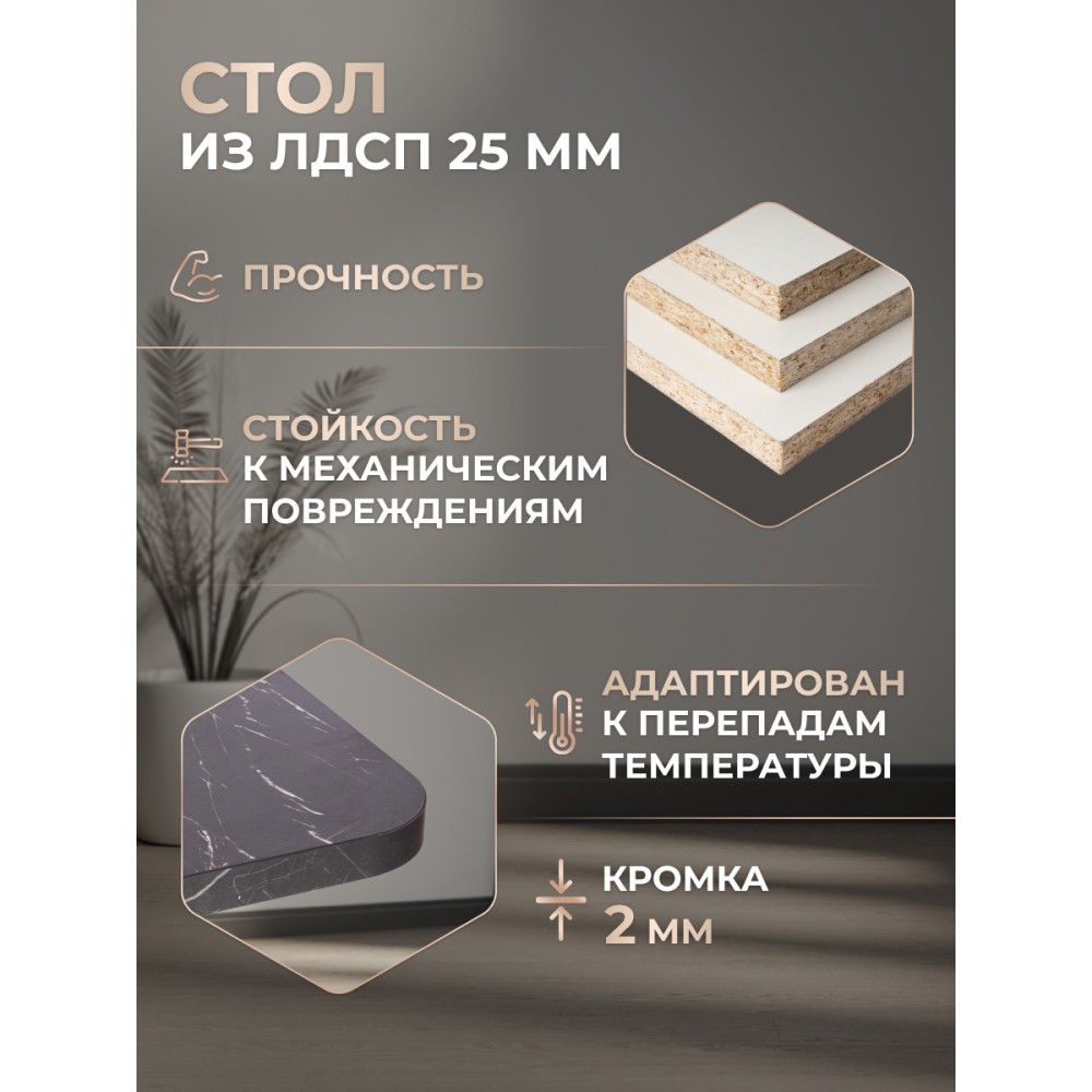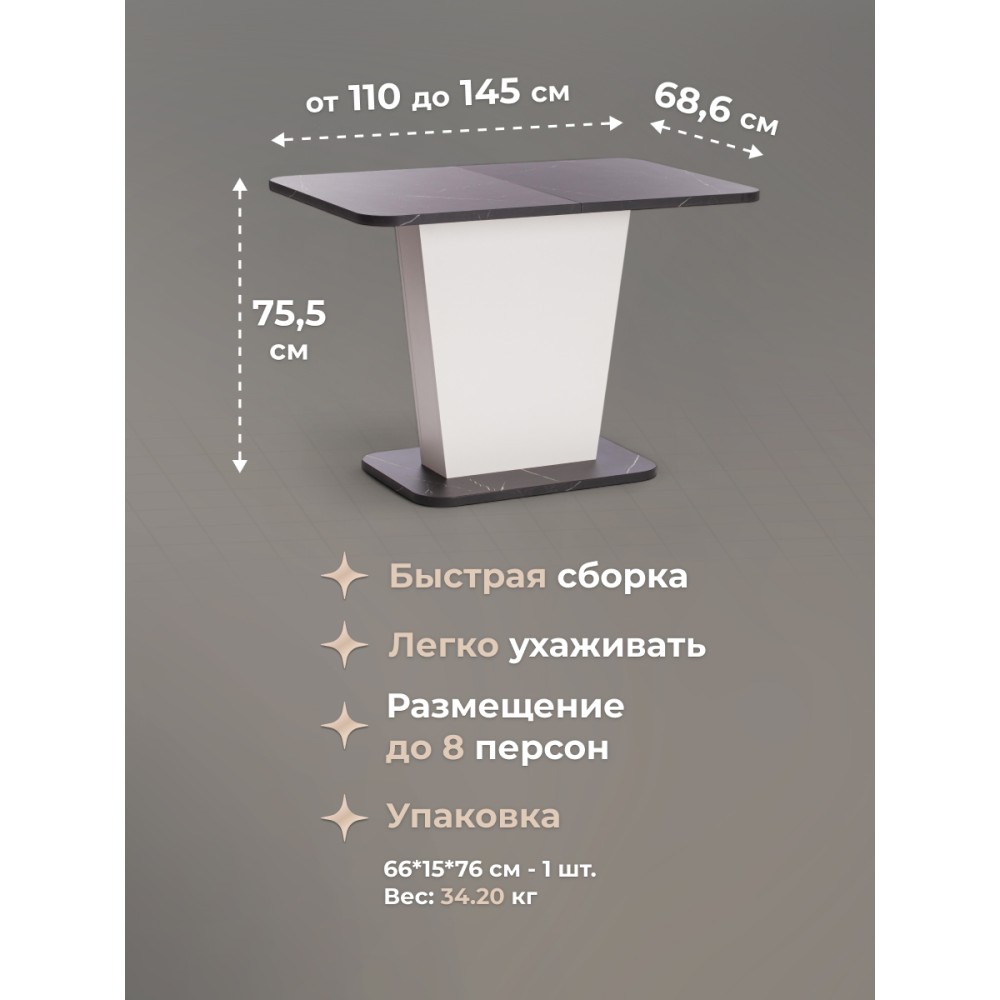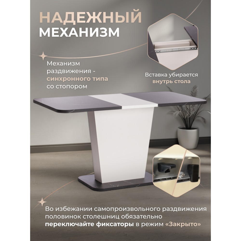 Стильный и компактный стол-трансформер GENT – это удачное сочетание простоты и элегантности. Стол хорошо впишется в обстановку гостиной, кухни или столовой благодаря отличному сочетанию белого цвета и цвета Мрамор Блэк Роял. Его размеры позволяют комфортно разместить от четырех до шести человек. Вставка стола убирается в ножку. Края оклеены прочной пластиковой кромкой толщиной 2 мм. ЛДСП толщиной 25 мм. Механизм раздвижения - синхронного типа со стопором. Стол GENT отлично подойдёт для гостиной, для кухни или для загородного дома. Стол очень прост в сборке, инструкция по сборке прилагается.