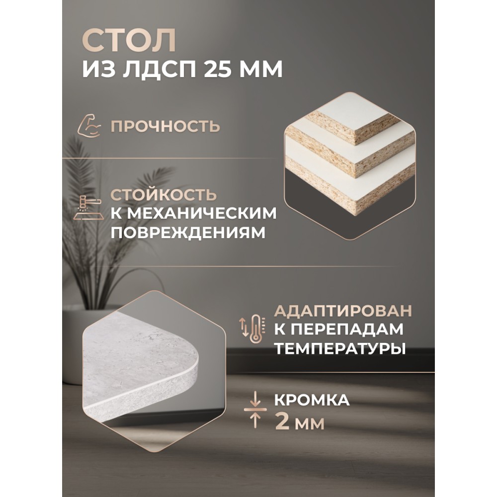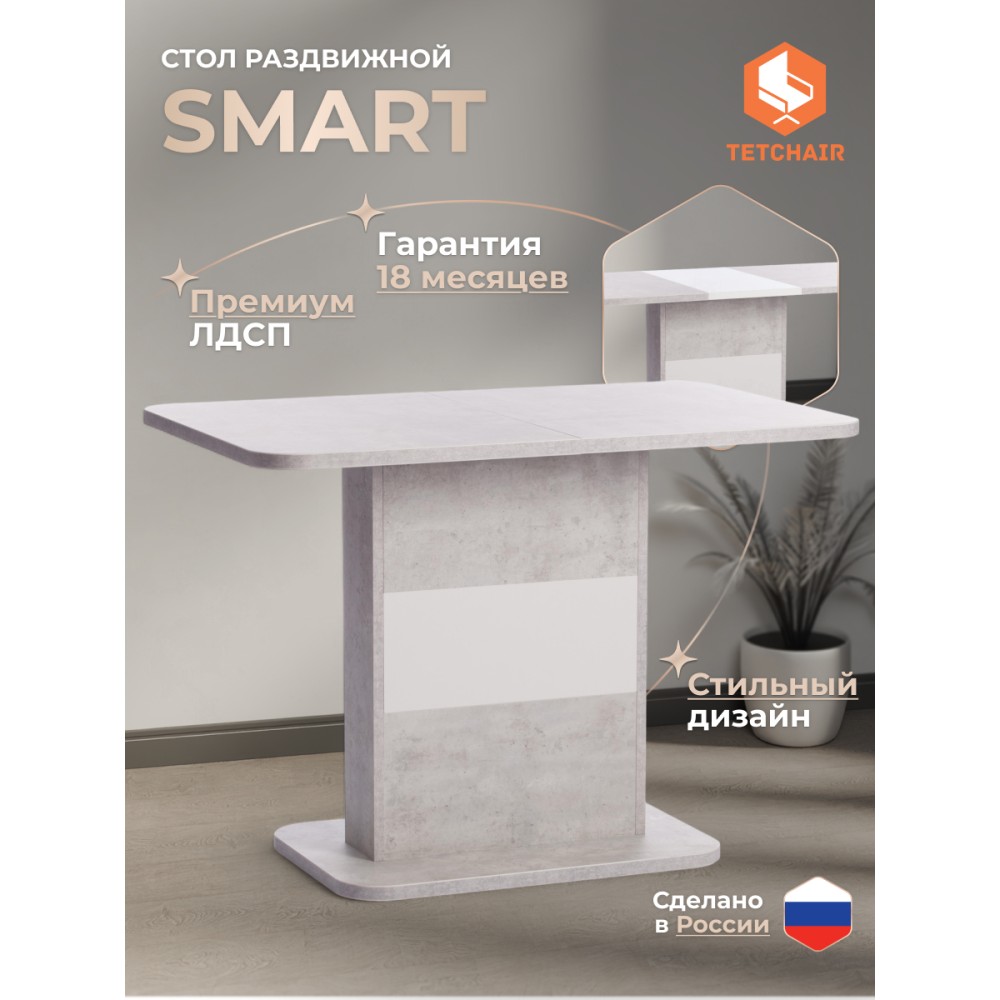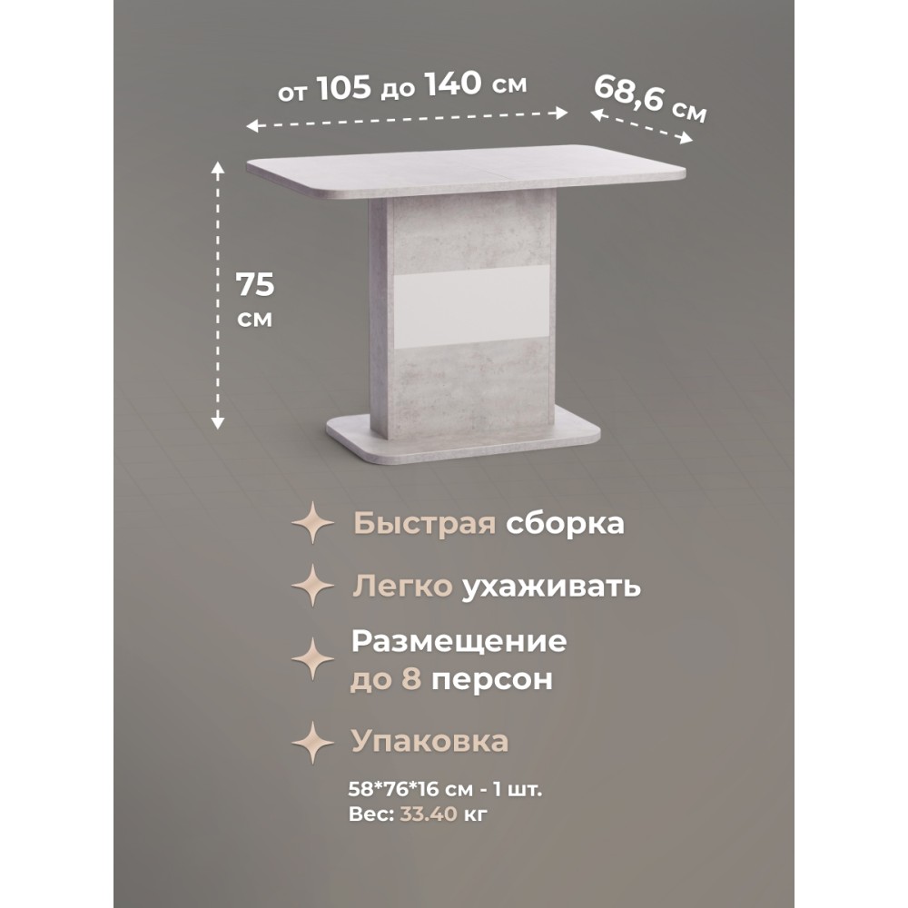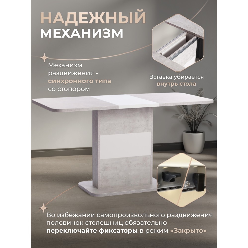 Кухонный стол Smart из коллекции Modern прекрасное решение простоты и функциональности. Прямоугольная столешница из ЛДСП толщиной 25 мм и оригинальная ножка-опора белого цвета и цвета бетон – идеальное сочетание для современного стильного пространства. Края стола оклеены прочной пластиковой кромкой толщиной 2 мм, что значительно продлит срок его службы. При необходимости можно быстро и легко увеличить размеры стола с помощью центральной секции, для этого используется механизм синхронного типа со стопором. Вставка стола легко убирается в ножку. За столом с комфортом могут разместиться от 4 до 6 человек. Эта стильная и комфортная модель станет любимым местом отдыха в вашем доме. Стол Smart отлично подойдёт для гостиной, для кухни или для загородного дома. Стол очень прост в сборке, инструкция по сборке прилагается.