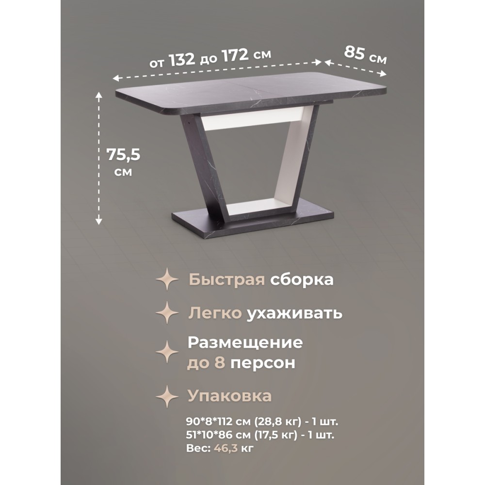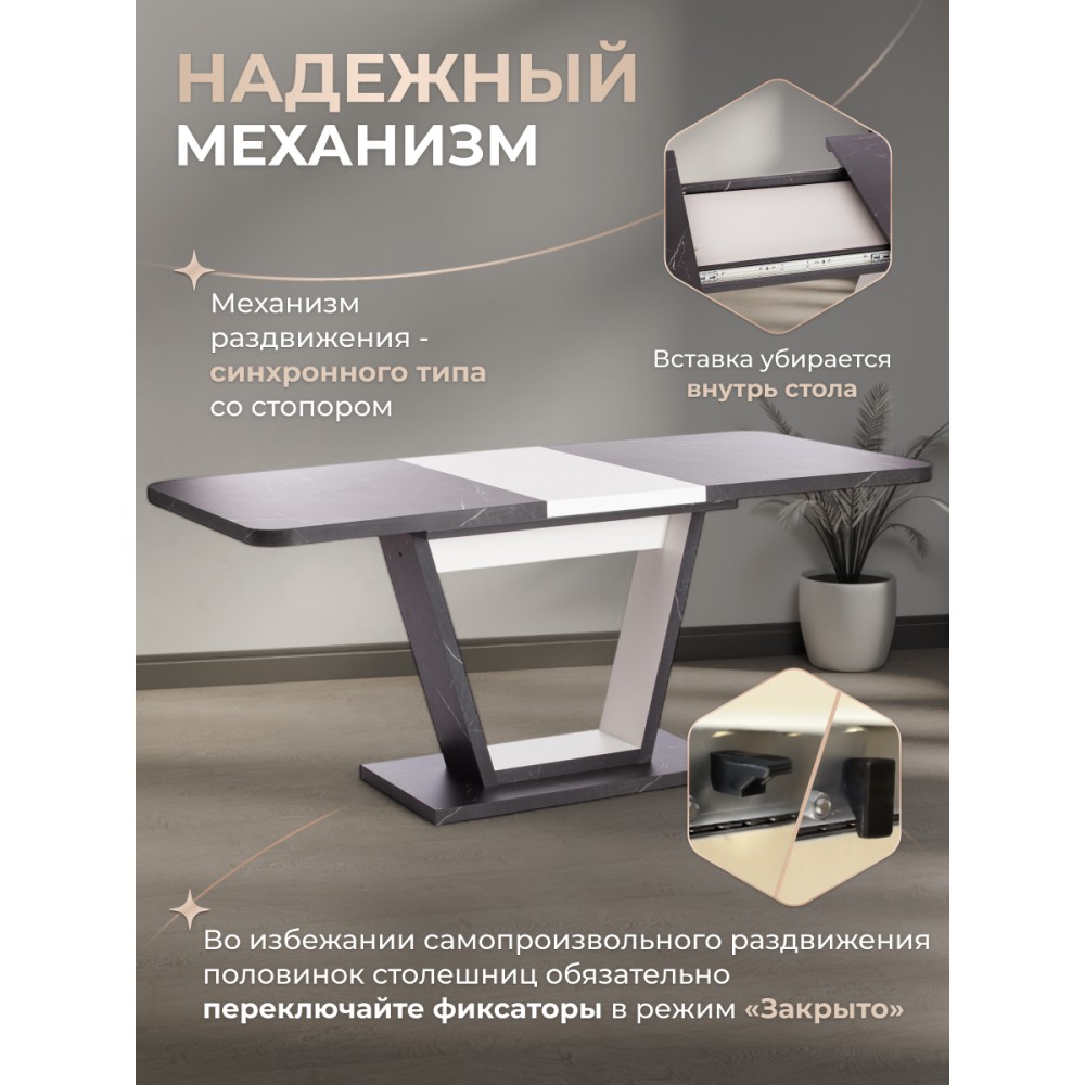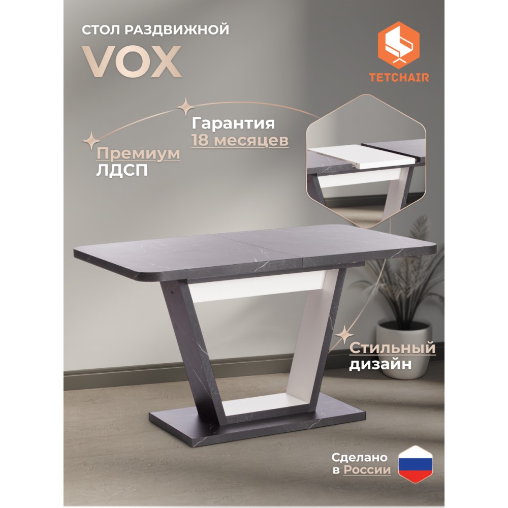 Визуально легкий стол-транформер VOX украсит собой любую домашнюю обстановку. Большая столешница, оригинальная ножка-опора и удачное сочетание белого цвета и цета черный Мрамор – идеальное решение для современного стильного интерьера. Размеры стола дают возможность с комфортом разместить от четырех до восьми человек. Вставка стола убирается горизонтально в подстолье. Края оклеены прочной пластиковой кромкой толщиной 2 мм. ЛДСП толщиной 18+18 мм. Механизм раздвижения - синхронного типа со стопором. Стол VOX отлично подойдёт для гостиной, для кухни или для загородного дома. Стол очень прост в сборке, инструкция по сборке прилагается.