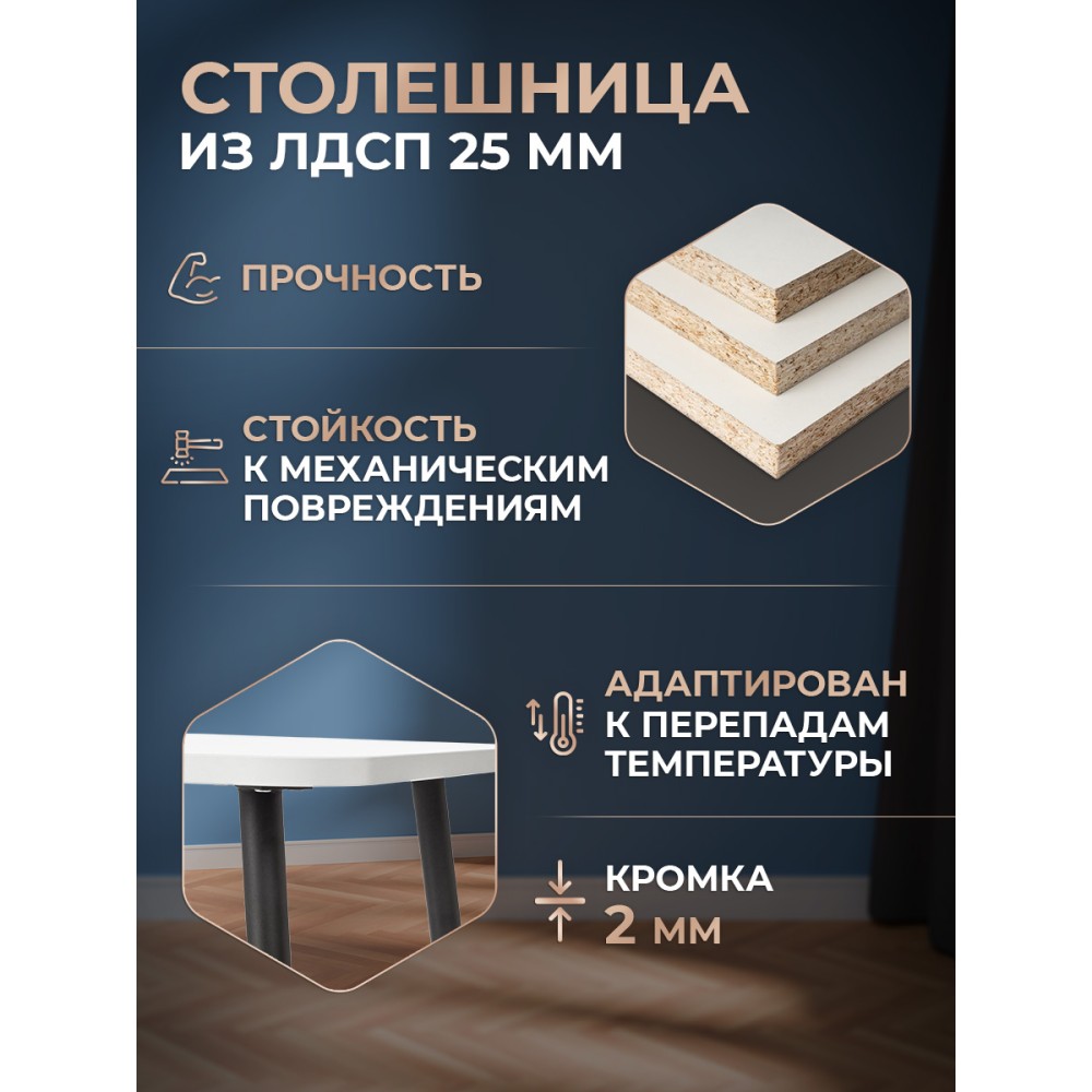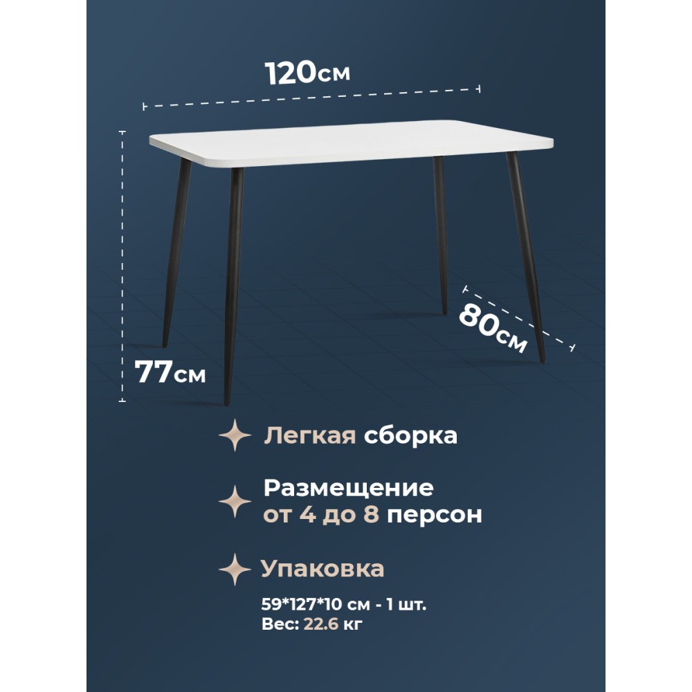 Стильный и компактный стол Pluto из коллекции Modern – это удачное сочетание простоты и элегантности. Стол отлично впишется в интерьер кухни, столовой, гостиной, дачи или небольшого кафе. Cтолешница белого цвета выполнена из ЛДСП толщиной 25 мм, края оклеены прочной пластиковой кромкой толщиной 2 мм. Изящные тонкие ножки изготовлены из металла и окрашены в черный цвет. Простая в сборке и прочная конструкция прослужит вам долгие годы. Небольшие размеры стола позволят разместить его даже в небольшом пространстве. Стол прост в сборке, инструкция по сборке прилагается.