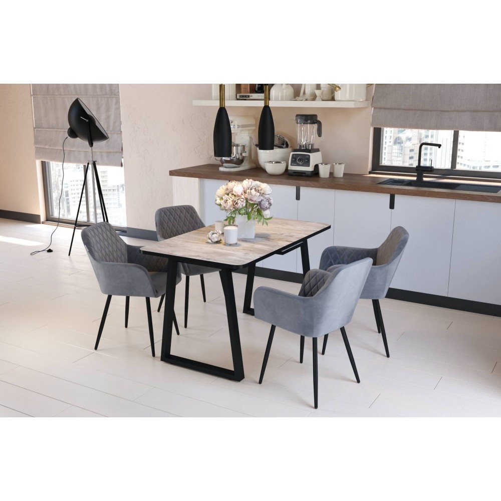 Необычный дизайн ножек не только добавляет в интерьер ломаных линий, но и позволяет сэкономить пространство для ног. Рисунок натурального дерева на столешнице отлично дополнит классический интерьер обеденной зоны.