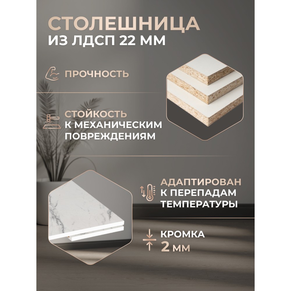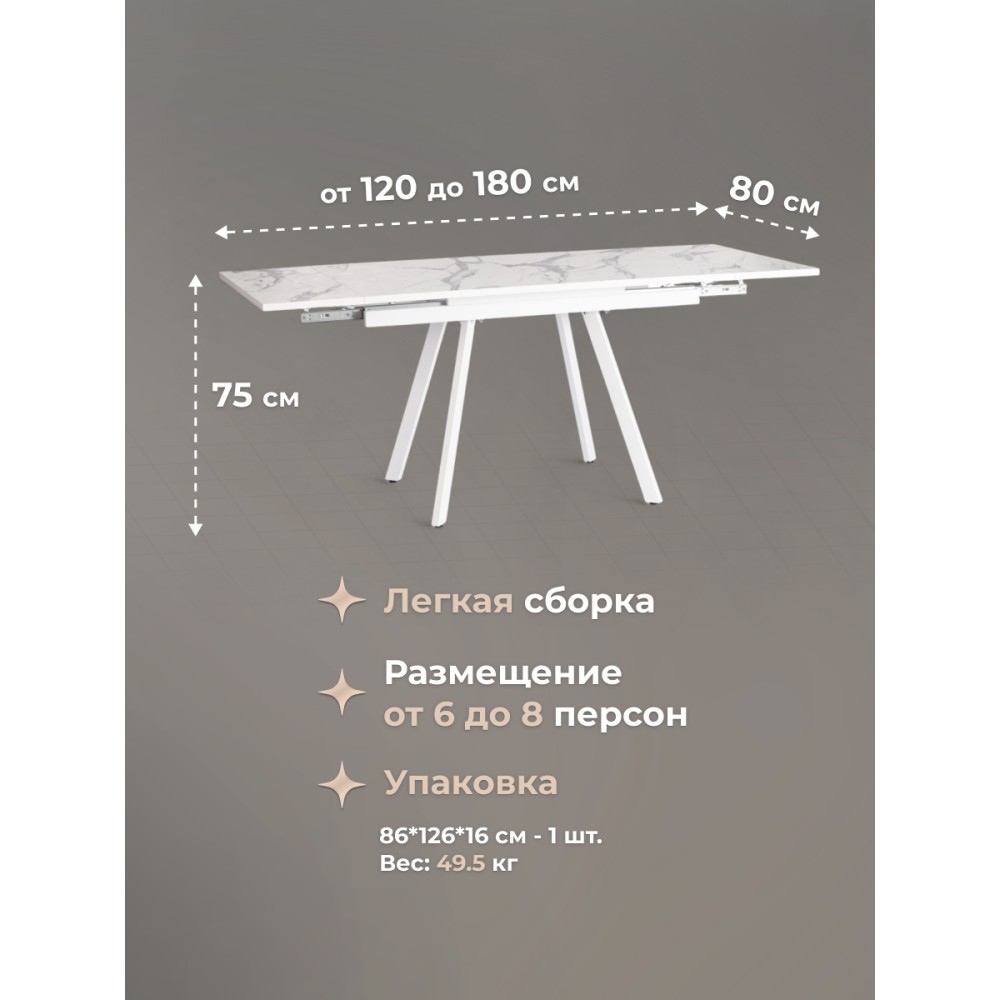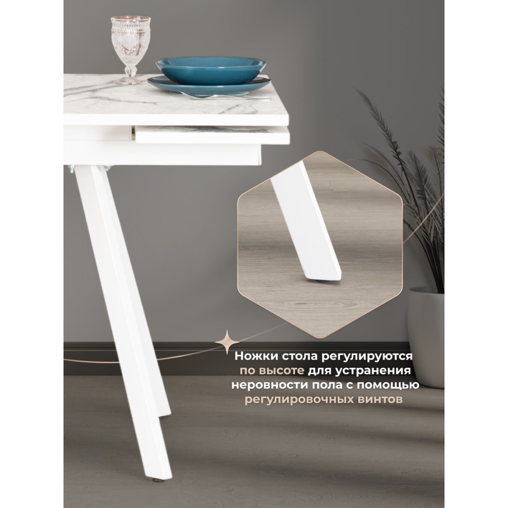 Стол VIGO из коллекции Modern украсит собой любую домашнюю обстановку Стол VIGO отлично подойдёт для гостиной, кухни, столовой или загородного дома. Столешница светлый мрамор и боковые выдвижные вставки выполнены из ЛДСП толщиной 22 мм на лицевую поверхность которых нанесен защитный слой HPL толщиной 1 мм. HPL имеет защитное покрытие оверлей высокой степени истирания, которое повышает устойчивость поверхностей к повреждениям. Структурированная поверхность столлешницы с имитацией натурального камня придает изыканный вид.Используется кромка ПВХ 2 мм. Для увеличения площади стола используется боковой механизм выдвижения с двумя вставками с обеих сторон. Прочные белые металлические ножки окрашены порошковой краской. Ножки стола регулируются по высоте для устранения неровности пола. За столом могут разместиться от 4 до 8 человек. Стол упакован в транспортировочный короб из ЛДСП + гофрокороб. Модель проста в сборке, инструкция по сборке прилагается.