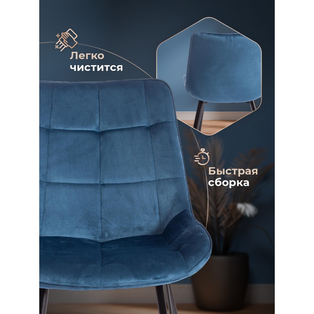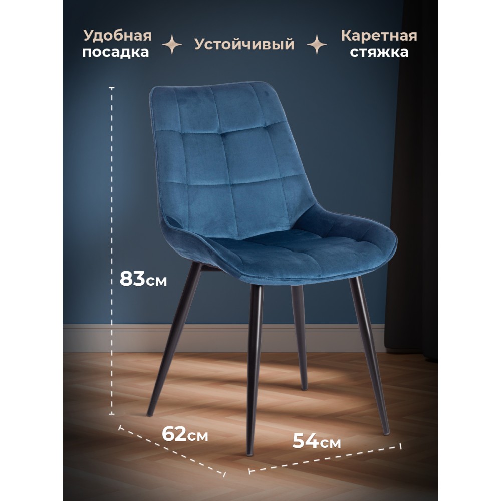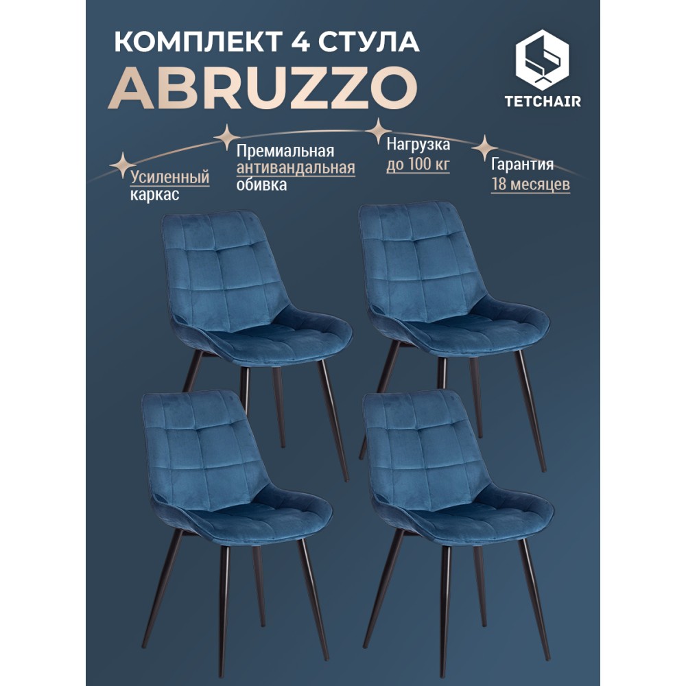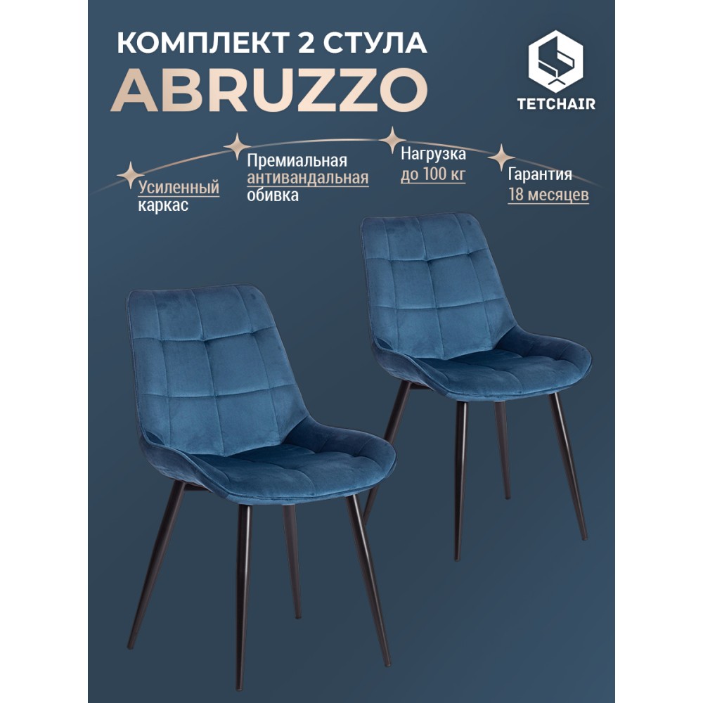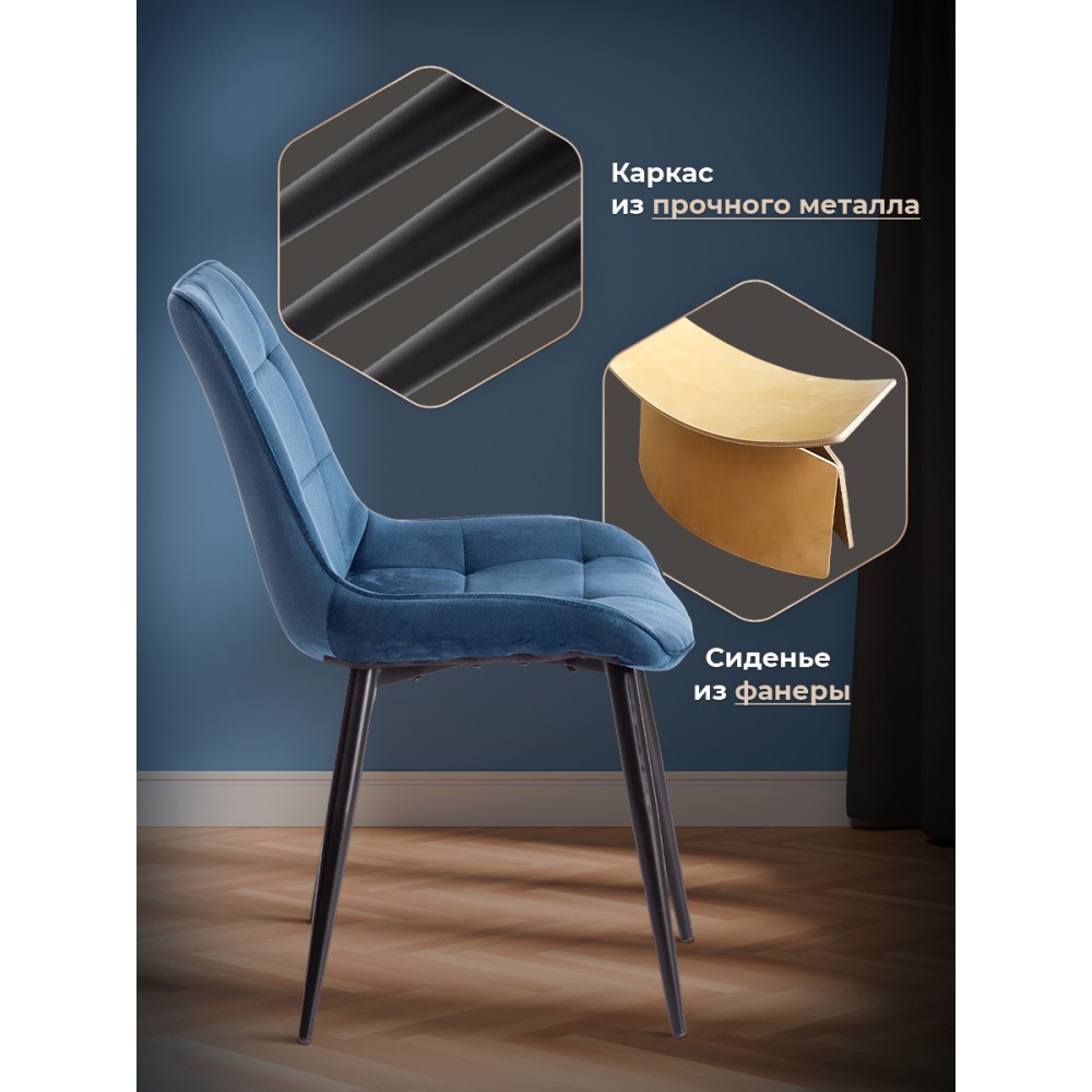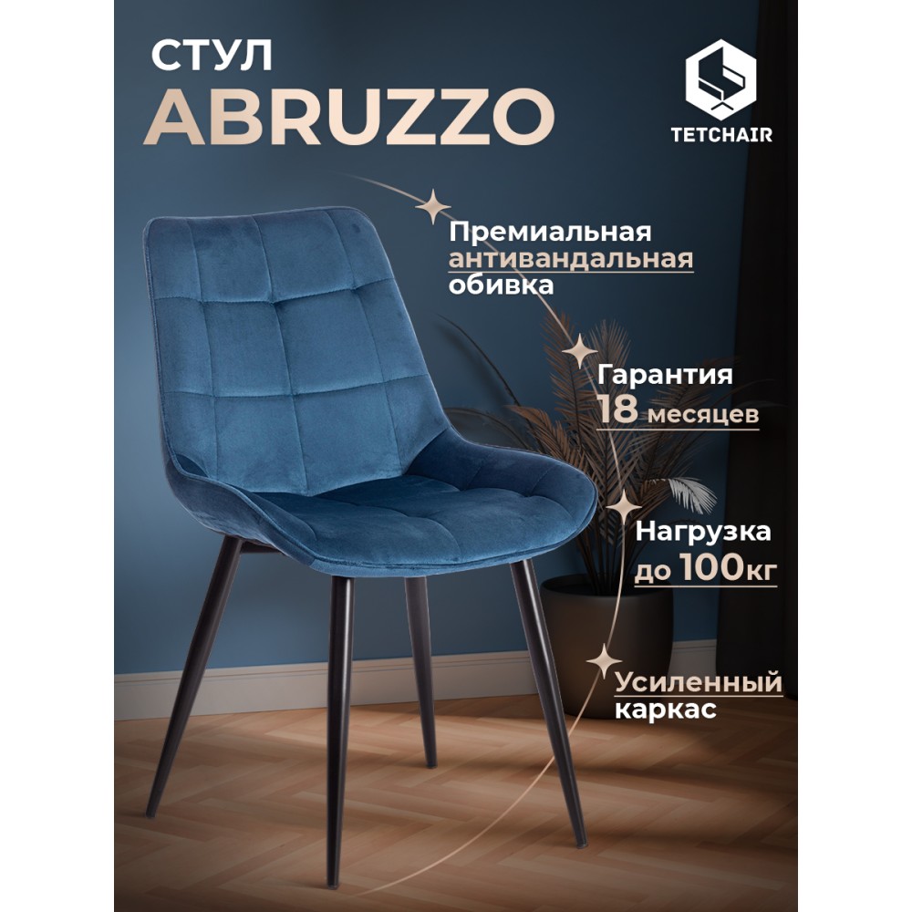 Легкий и элегантный дизайн, простые линии и естественные цвета стула ABRUZZO из коллекции Modern украсят собой любую домашнюю обстановку. Сочетание стеганой обивки синего цвета с черными металлическими ножками придает стулу особенную красоту и оригинальность. Эргономичная спинка и удобное сиденье позволят комфортно сидеть в течение длительного времени. Конструкция изделия разработана с учетом равномерного распределения нагрузки. Тканевая обивка не мнётся, не меняет форму, пропускает воздух, экологична и гипоаллергенна. Металл – прочный и долговечный материал, не требующий специального ухода, способный выдерживать большую нагрузку. Стул будет радовать вас своим первоначальным видом долгие годы. Стул подойдёт для гостиной, для кухни, для спальни, для ресторана или для кафе. Стул очень прост в сборке, инструкция по сборке прилагается.