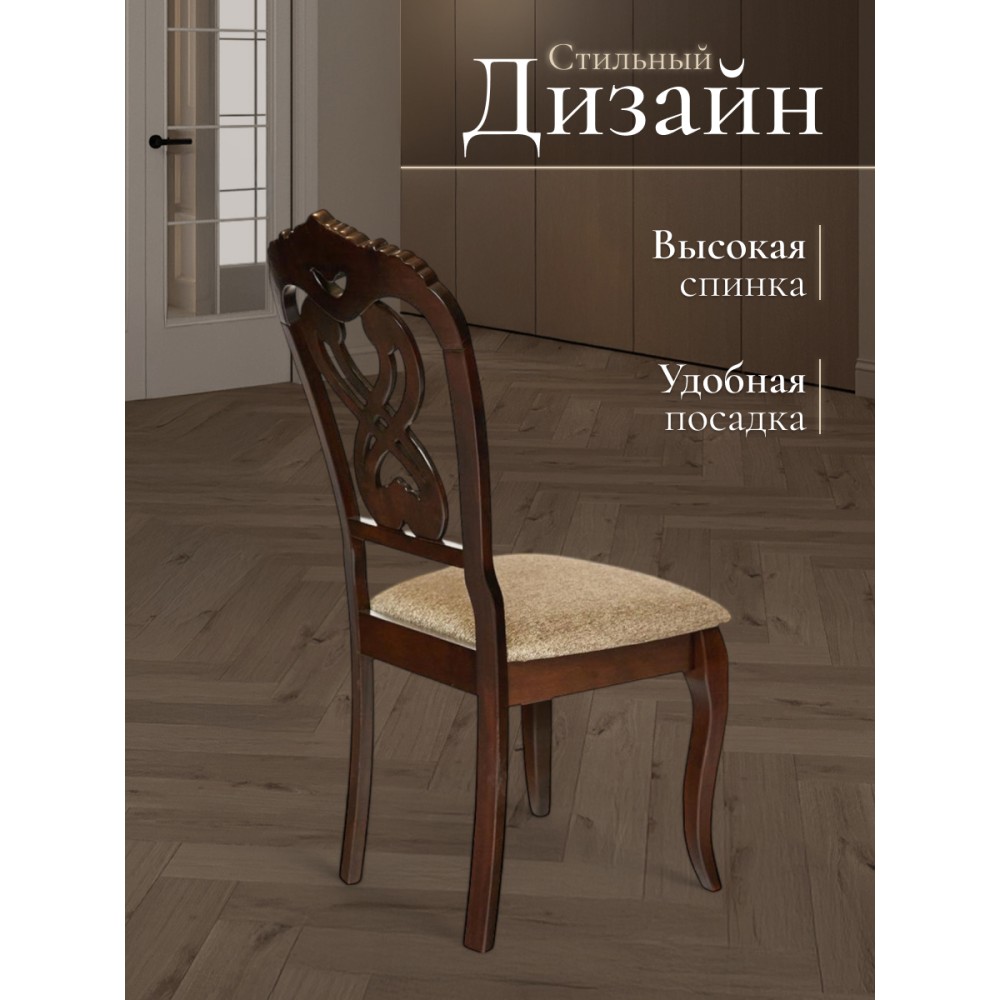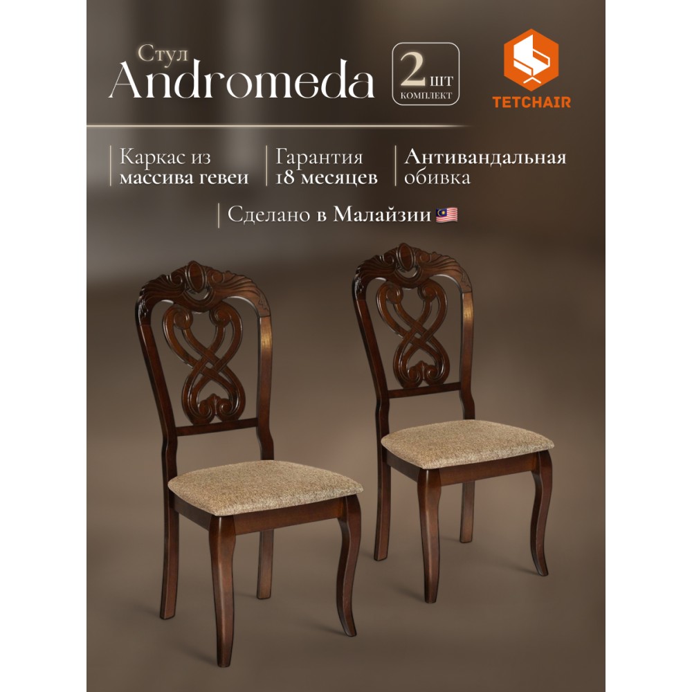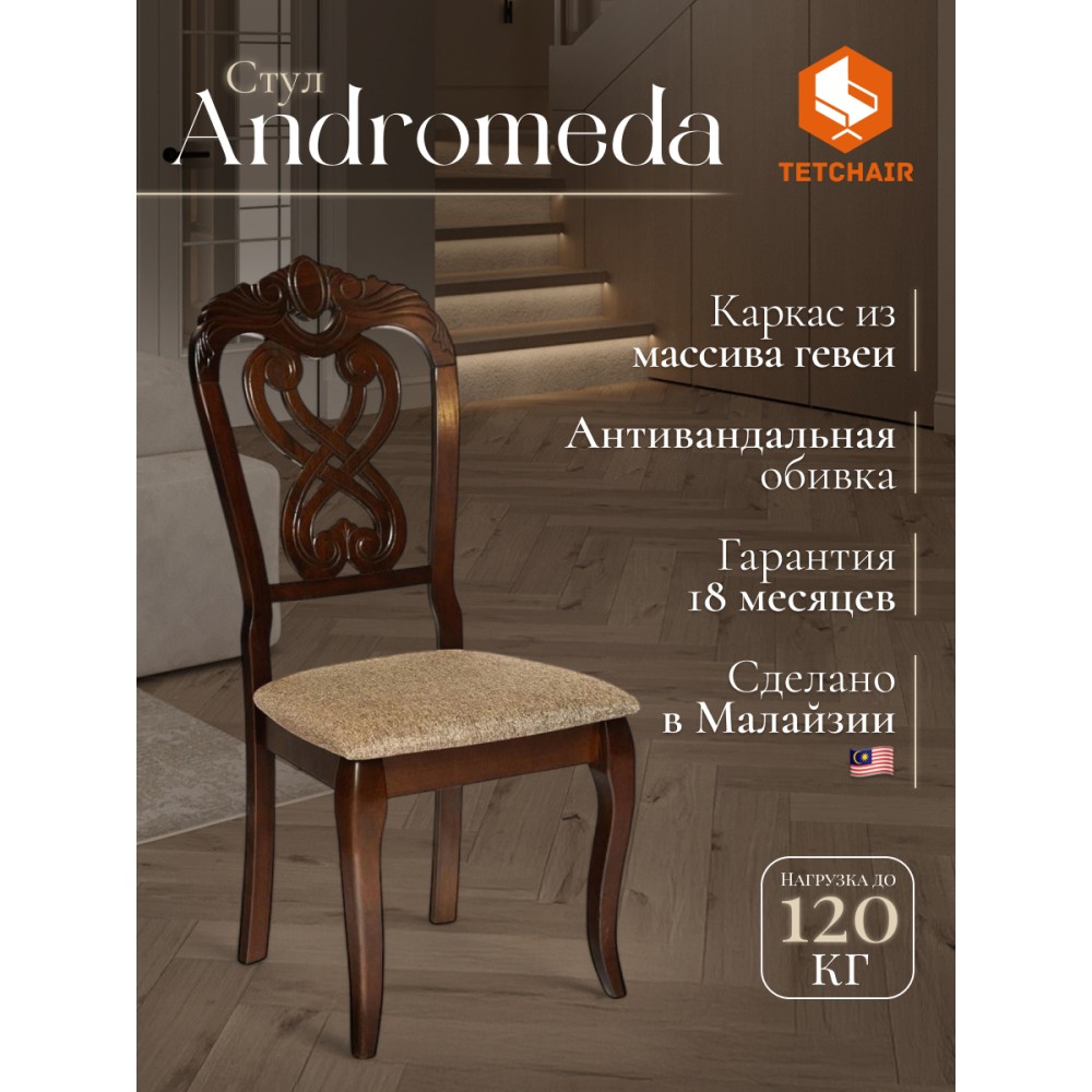 Резная спинка, изящные ножки и мягкое сиденье обеденного стула Андромеда (Andromeda) из Дельфийской коллекции - воплощение роскоши, уникальности и изысканности. Модель отлично впишется в обстановку загородного дома или городской квартиры. Стул Андромеда с резной спинкой ручной работы может стать не только частью интерьера, но и нестандартной составляющей обстановки, привлекающей к себе внимание в кафе или ресторане. Утонченные грациозные ножки модели имеют изогнутую форму, что придает ей визуальную легкость и уникальность. Каркас изделия изготовлен из крепкой и прочной древесины - дерева гевеи. Комфортное мягкое сиденье обито тканью, не требующей дополнительного ухода и поддающейся несложной чистке. Безукоризненное сочетание каркаса и ножек цвета темный орех (Cappuchino) с сиденьем благородного коричневого цвета позволяет использовать модель в помещении любой цветовой гаммы. Деревянный стул Андромеда придаст элегантности вашему интерьеру ,он будет вас радовать своим первоначальным видом долгие годы. Стул подойдёт для гостиной, кухни или столовой. Стул очень прост в сборке, инструкция по сборке прилагается.