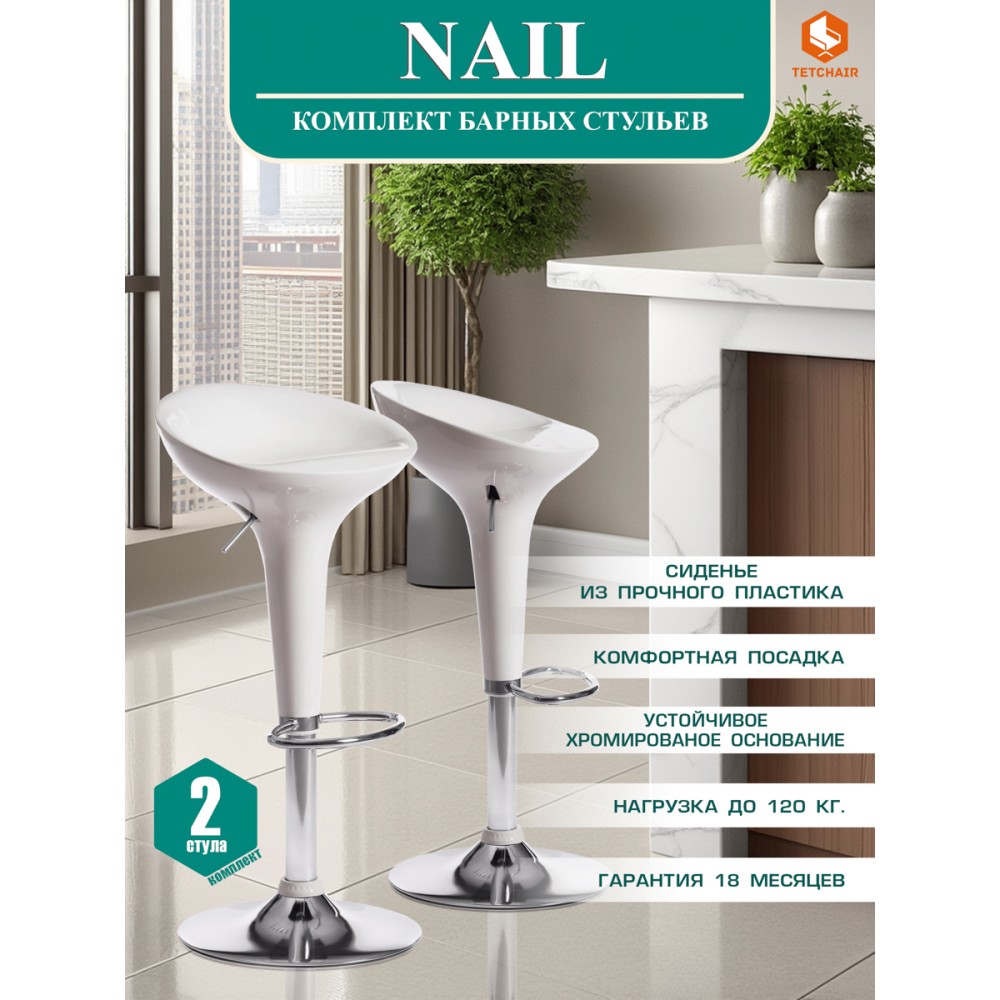 Стильный барный стул NAIL из коллекции Modern удачно сочетает в себе дизайнерское решение и функциональность. Он лаконичен, сдержан, легок и оригинален. Визуальная легкость позволяет ему стать идеальным решением даже для небольшого помещения. Превосходное решение для кухни, бара и кафе. Белое пластиковое сиденье в сочетании с хромированной металлической ножкой выглядит модно и современно. Удобная подставка для ног, механизм регулировки высоты и комфортное сиденье дадут возможность приятно провести вечер за барной стойкой. Благодаря круглому основанию из стали с хромированным покрытием стул устойчив, надежен, основателен. Пластик и металл – прочные и долговечные материалы, не требующие специального ухода, способные выдерживать большую нагрузку. Стул будет радовать вас своим первоначальным видом долгие годы. Стул хорошо подойдет для гостиной, для кухни, для бара, для ресторана или для кафе. Стул очень прост в сборке, инструкция по сборке прилагается.