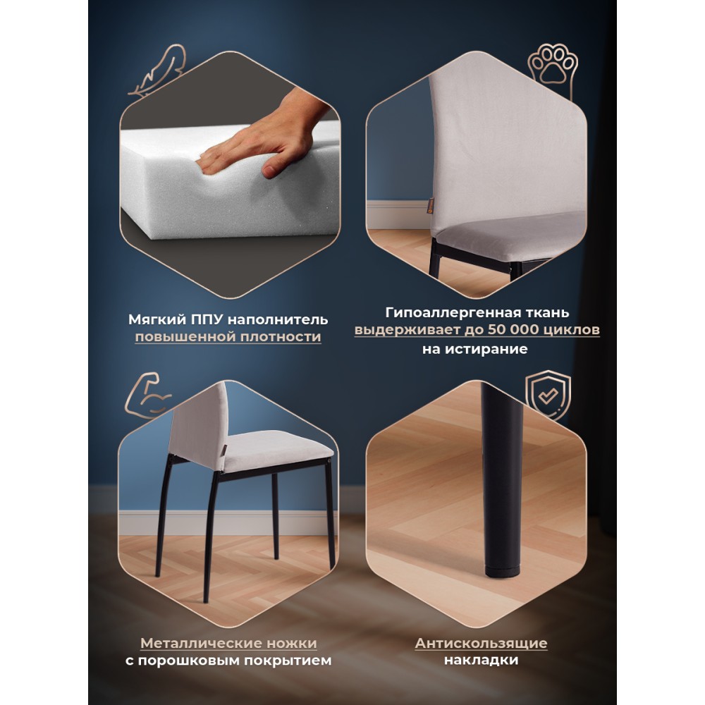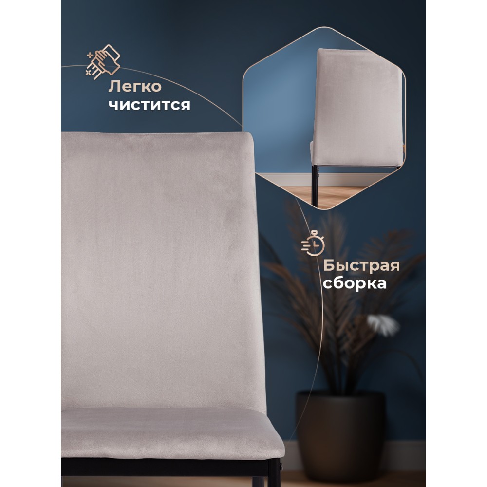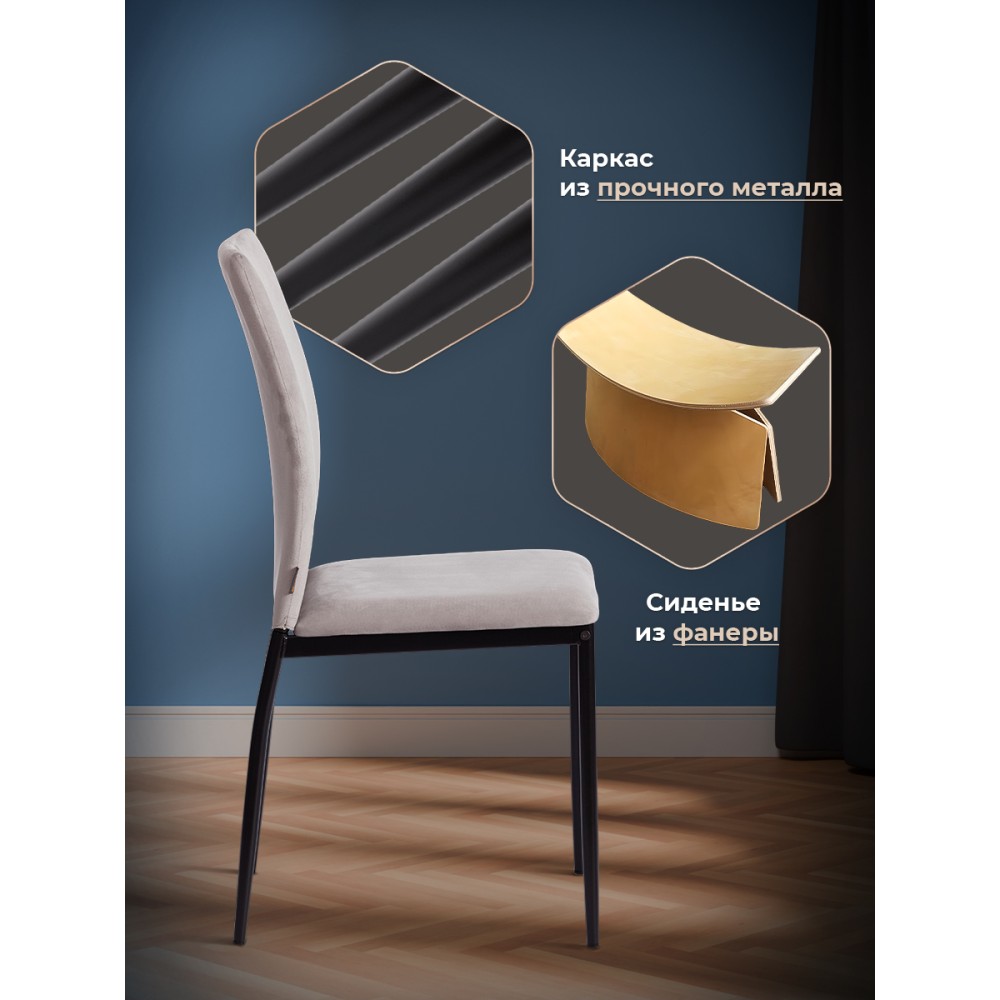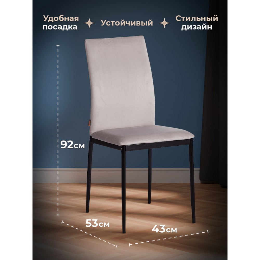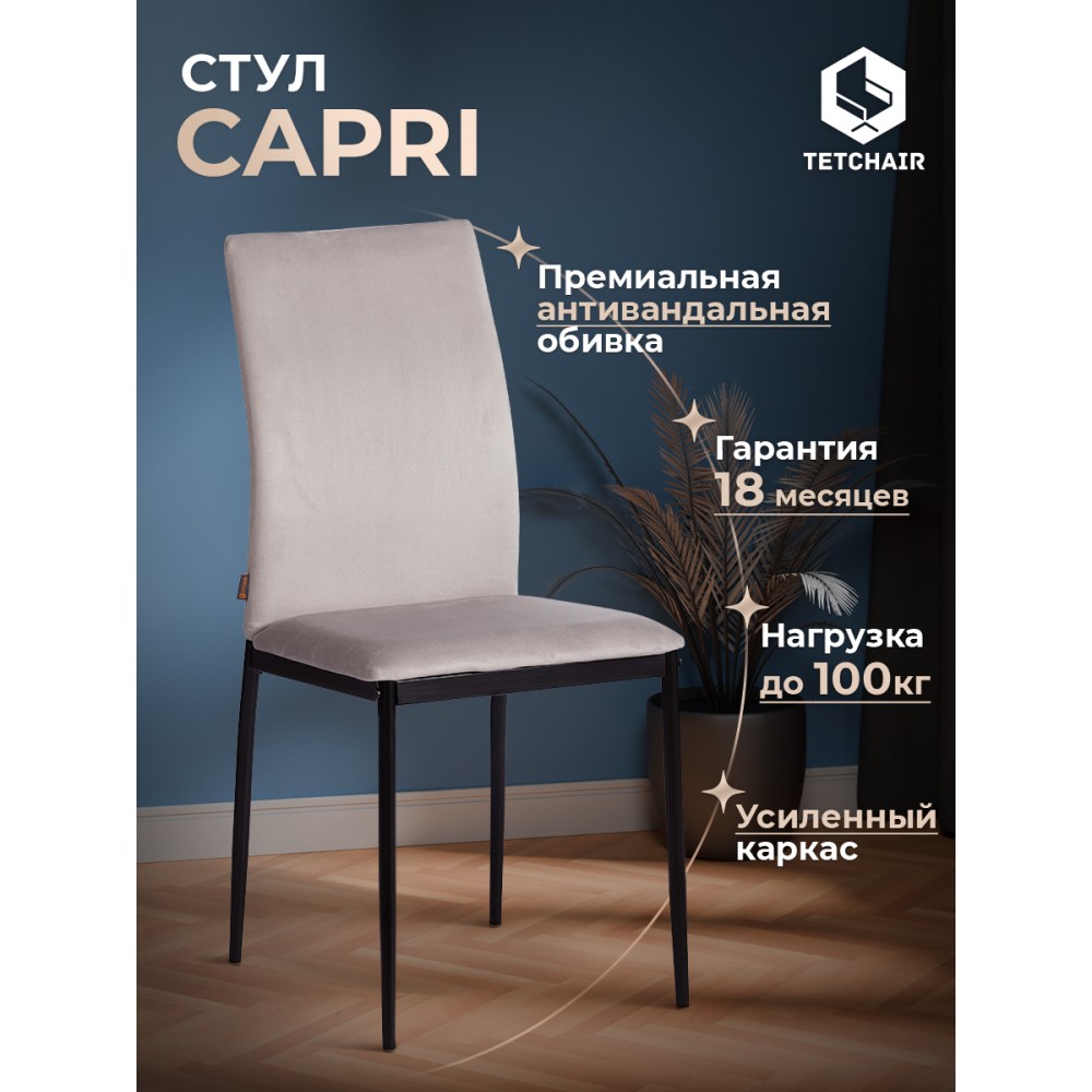 Стул CAPRI из коллекции Modern подчеркнет индивидуальность вашего интерьера, не перегружая его лишними деталями. Удобство, практичность и простота выгодно выделяют стул среди привычной мебели. Обивка из флока и тонкие металлические ножки, покрашенные порошковой краской, выглядят стильно и привлекательно. Удобное сиденье и высокая спинка позволяют комфортно расположиться на длительное время. Широко поставленные прочные ножки, делают модель крепкой и основательной. Стул может стать украшением загородного дома или городской квартиры. Обивка из флока светло-серого цвета – красивая, надежная, не требующая сложного ухода. Стул будет радовать вас своим первоначальным видом долгие годы. Стул подойдёт для гостиной, для кухни, для спальни, для кабинета, для офиса, для ресторана или для кафе. Стул очень прост в сборке, инструкция по сборке прилагается.