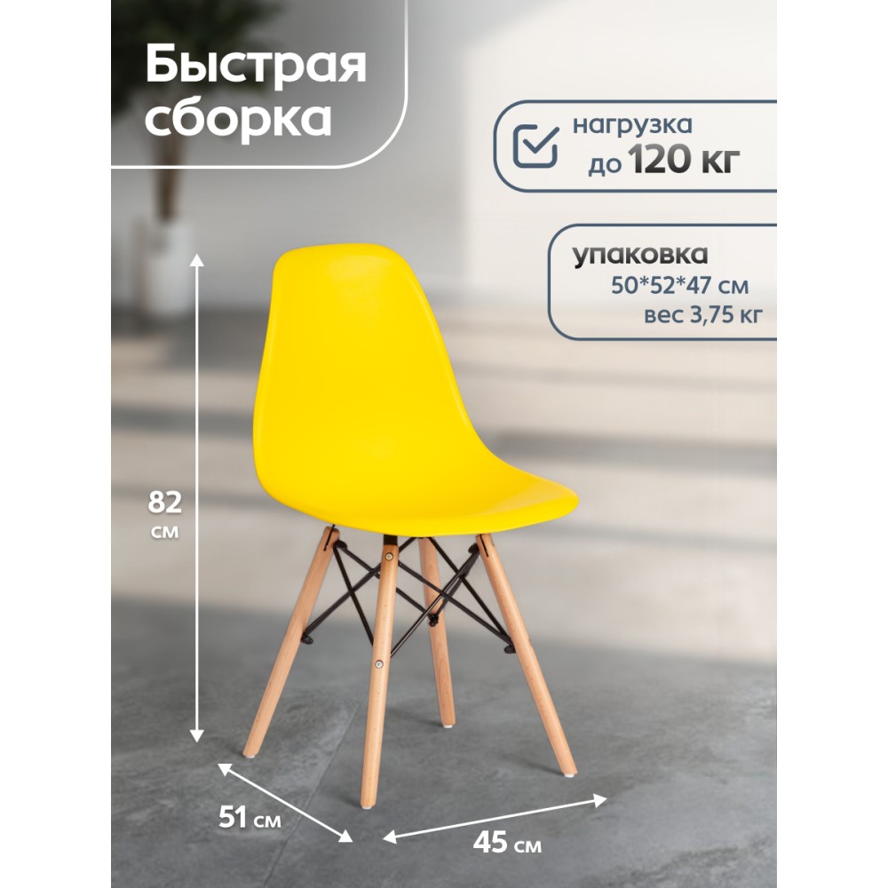 Стильный стул Cindy Chair из коллекции Modern, созданный в стиле знаменитого стула Eames DSW супругов Имз, украсит собой любую домашнюю обстановку. Этот удобный и легкий стул будет отличным украшением городской квартиры, загородного дома, кафе или ресторана. Сочетание желтого пластикового сиденья, ножек из массива бука и классического металлического крепления придает стулу особенную красоту и оригинальность. Эргономичная спинка и удобное сиденье позволят комфортно расположиться на продолжительное время. Конструкция изделия разработана с учетом равномерного распределения нагрузки. Пластик и массив бука – прочные и долговечные материалы, не требующие специального ухода, способные выдерживать большую нагрузку. Стул будет радовать вас своим первоначальным видом долгие годы. Стул хорошо подойдет для гостиной, для кухни, для террасы, для дачи, для ресторана или для кафе. Стул очень прост в сборке, инструкция по сборке прилагается.