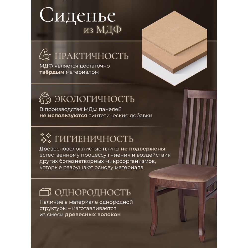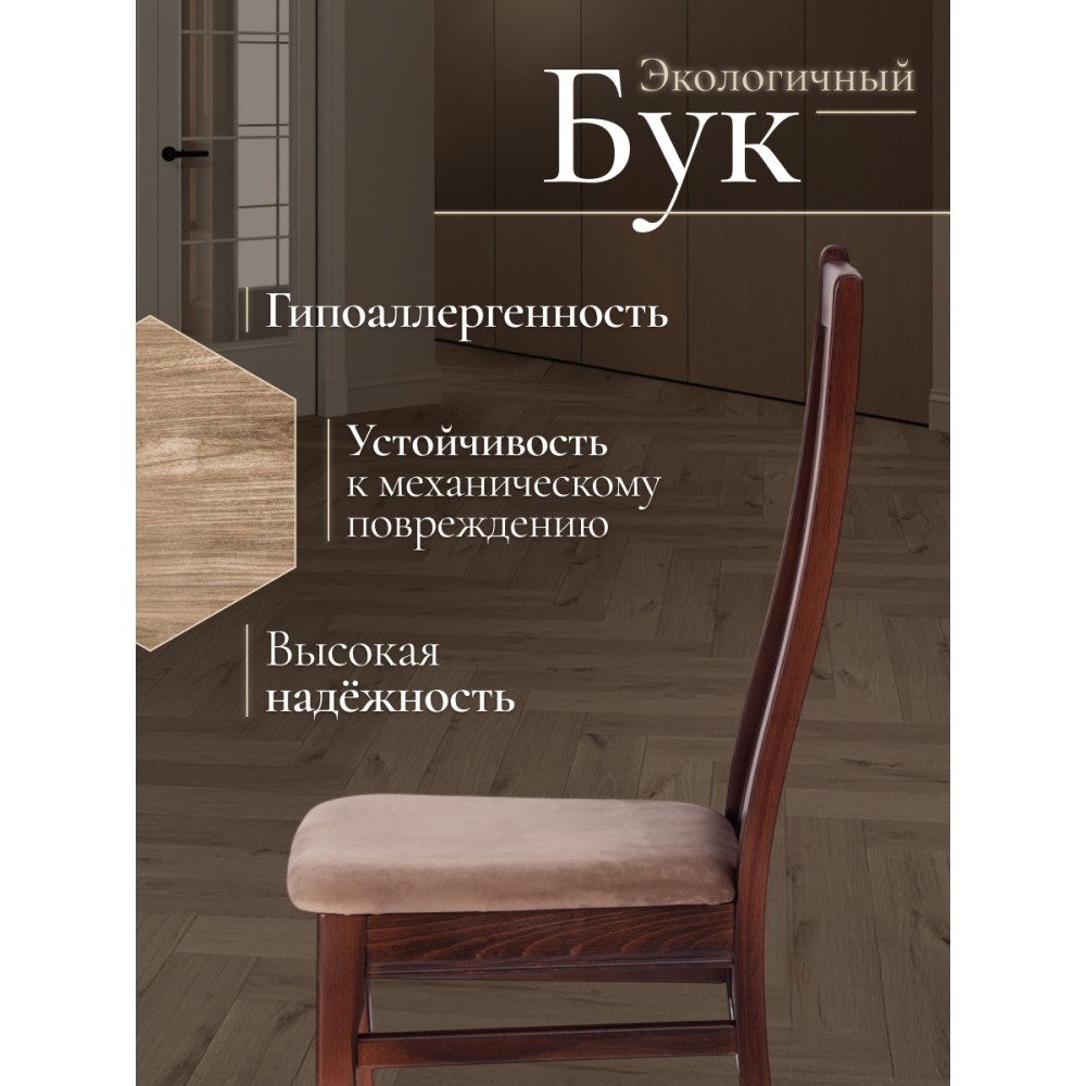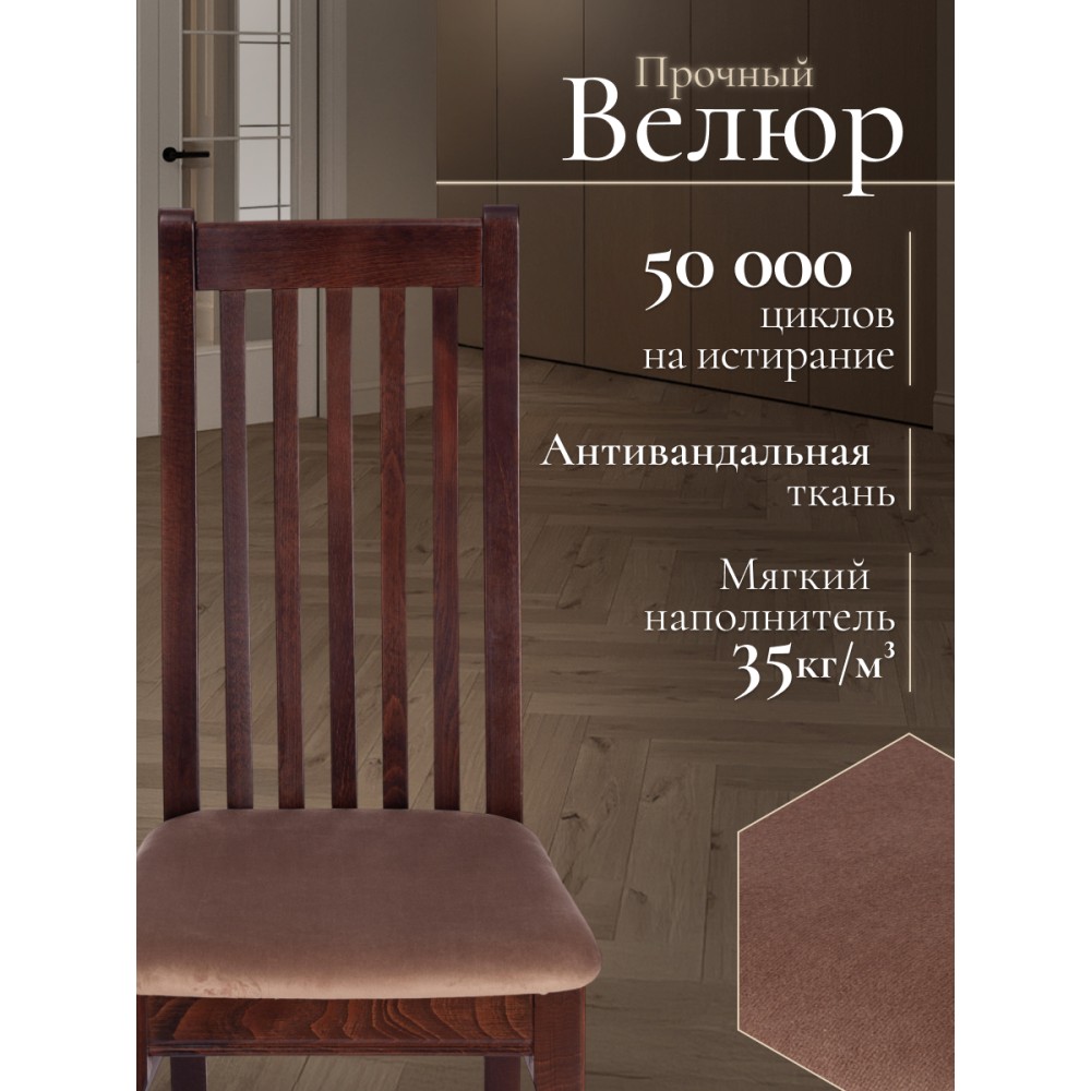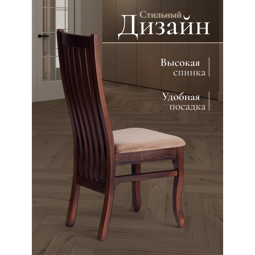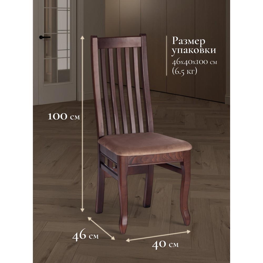 Классический деревянный стул DOLCE из Миланской коллекции - незаменимый предмет мебели на кухне, в гостиной, в спальне или столовой. Высокая удобная прямоугольная форма спинки обеспечивает анатомический изгиб, идеально поддерживающий спину во время сидения, тонкие устойчивые ножки и прочное мягкое сиденье помогут создать атмосферу комфорта и уюта в вашем доме. Экологически безопасный каркас стула изготовлен из высококачественной буковой древесины, что обеспечивает его долговечность и надежность. Он не требует сложного ухода, устойчив к механическому воздействию, что позволяет использовать стул на протяжении многих лет. Все элементы стула соединены между собой с помощью надежных шиповых соединений на клею и дополнительно закреплены шкантами. Это обеспечивает прочность и устойчивость всей конструкции стула. Сиденье стула крепится к каркасу через косынки и с помощью пластиковых уголков, что придает ему дополнительную устойчивость. Стул окрашен полиуретановым грунтом и лаком, а также тонирован спиртовыми морилками, что придает ему элегантный и стильный внешний вид. Модель прекрасно сочетается с различными видами обеденных столов и создает элегантную атмосферу в помещении. Мягкое сиденье, обито велюром который подойдет для любого интерьера . Стул в цвете Tobacco подойдет для загородного дома и городской квартиры, кухни, гостиной, ресторана или кафе, впишется в любой интерьер. Практичная и оригинальная модель DOLCE обладает прекрасными эстетическими свойствами и долговечностью. Стул DOLCE поставляется в собранном виде, что позволяет избежать дополнительных хлопот по его сборке. Это идеальный выбор для тех, кто ценит комфорт, качество и стиль в одном продукте.Максимальная нагрузка 120 кг.