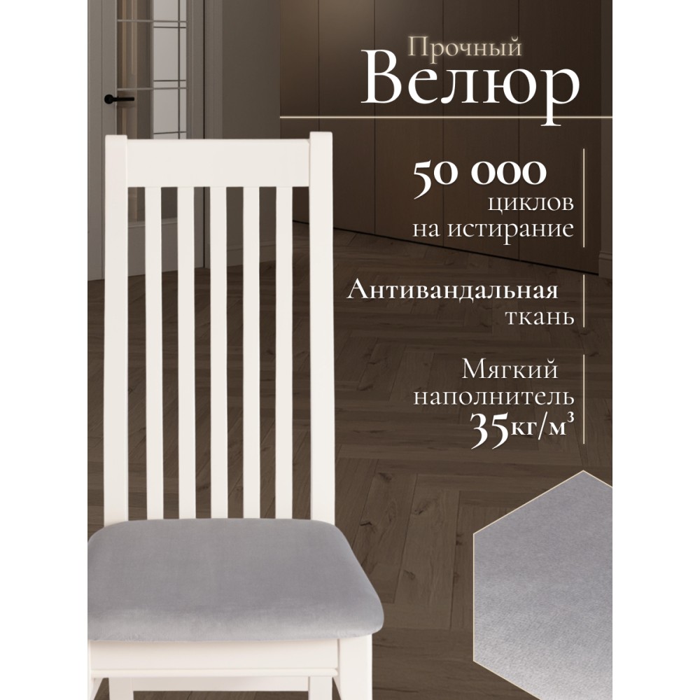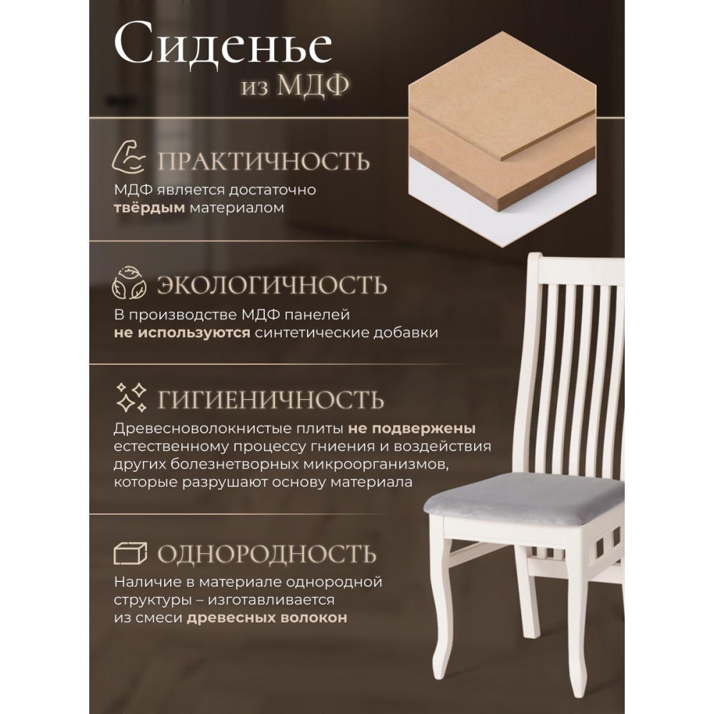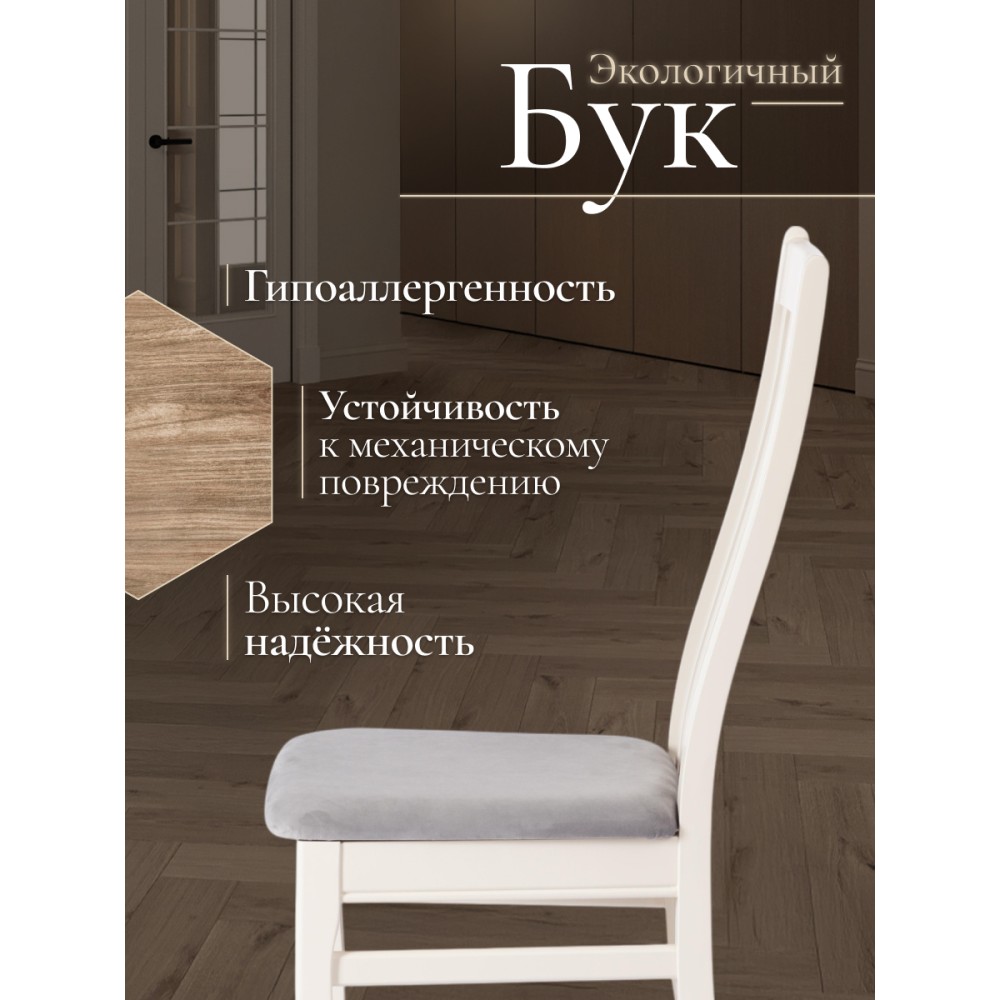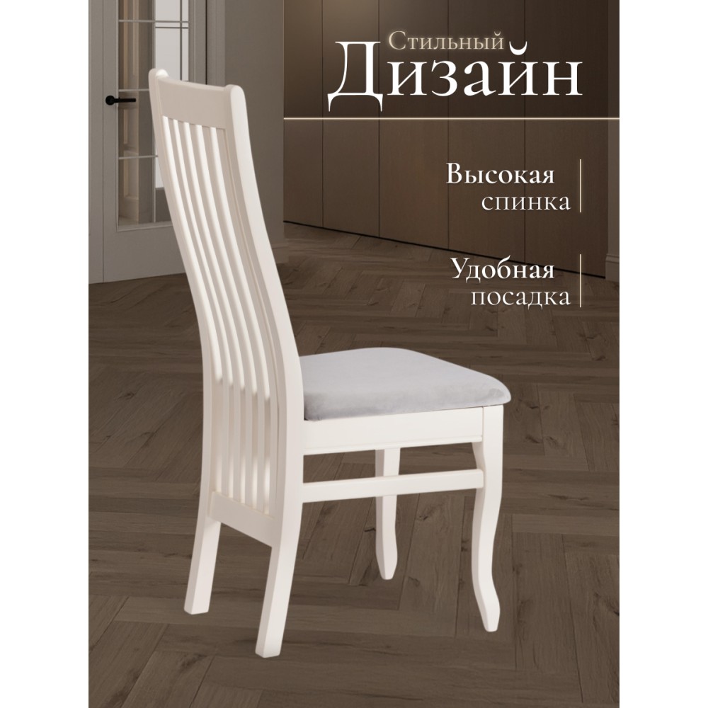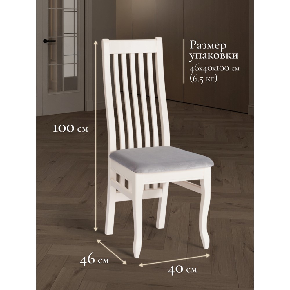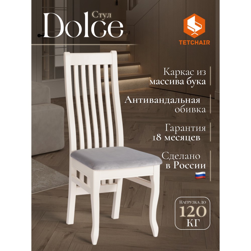Классический деревянный стул DOLCE из Миланской коллекции - незаменимый предмет мебели на кухне, в гостиной, в спальне или столовой. Высокая удобная прямоугольная форма спинки обеспечивает анатомический изгиб, идеально поддерживающий спину во время сидения, тонкие устойчивые ножки и прочное мягкое сиденье помогут создать атмосферу комфорта и уюта в вашем доме. Экологически безопасный каркас стула изготовлен из высококачественной буковой древесины, что обеспечивает его долговечность и надежность. Он не требует сложного ухода, устойчив к механическому воздействию, что позволяет использовать стул на протяжении многих лет. Все элементы стула соединены между собой с помощью надежных шиповых соединений на клею и дополнительно закреплены шкантами. Это обеспечивает прочность и устойчивость всей конструкции стула. Сиденье стула крепится к каркасу через косынки и с помощью пластиковых уголков, что придает ему дополнительную устойчивость. Стул окрашен полиуретановым грунтом и лаком, а также тонирован спиртовыми морилками, что придает ему элегантный и стильный внешний вид. Модель прекрасно сочетается с различными видами обеденных столов и создает элегантную атмосферу в помещении. Мягкое сиденье, обито велюром который подойдет для любого интерьера . Стул в цвете Ivory white подойдет для загородного дома и городской квартиры, кухни, гостиной, ресторана или кафе, впишется в любой интерьер. Практичная и оригинальная модель DOLCE обладает прекрасными эстетическими свойствами и долговечностью. Стул DOLCE поставляется в собранном виде, что позволяет избежать дополнительных хлопот по его сборке. Это идеальный выбор для тех, кто ценит комфорт, качество и стиль в одном продукте.Максимальная нагрузка 120 кг.